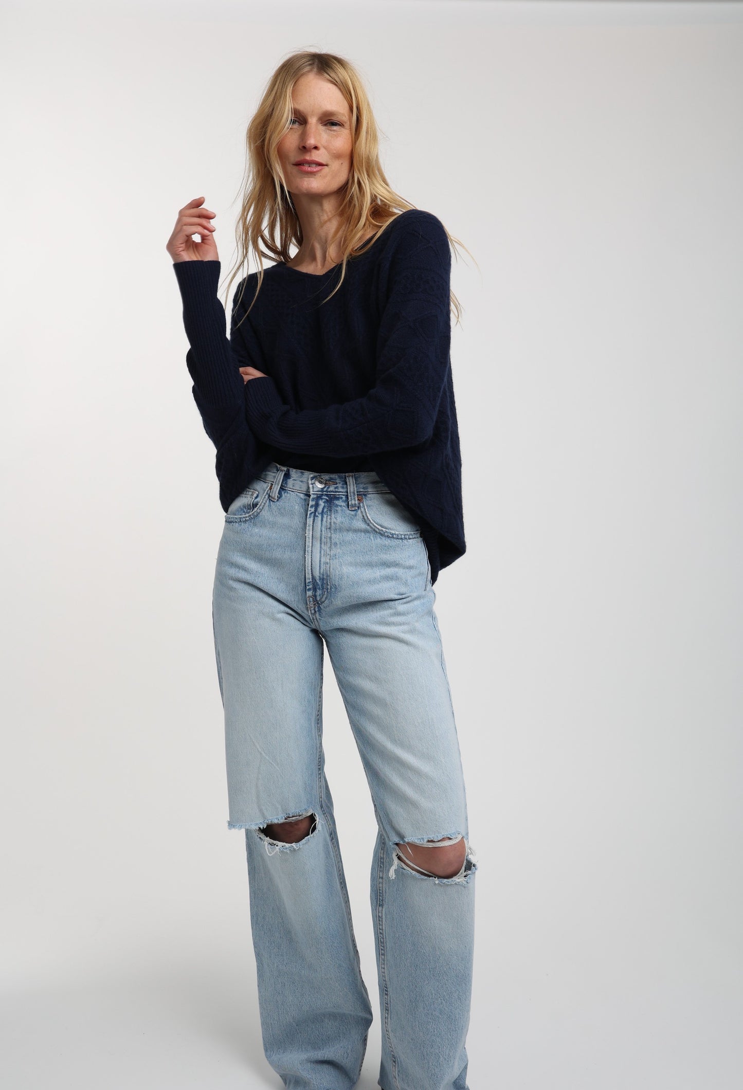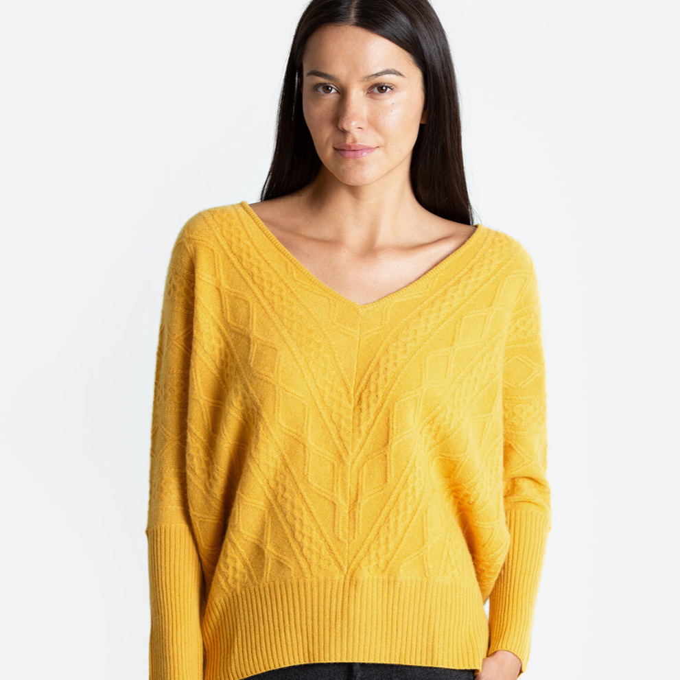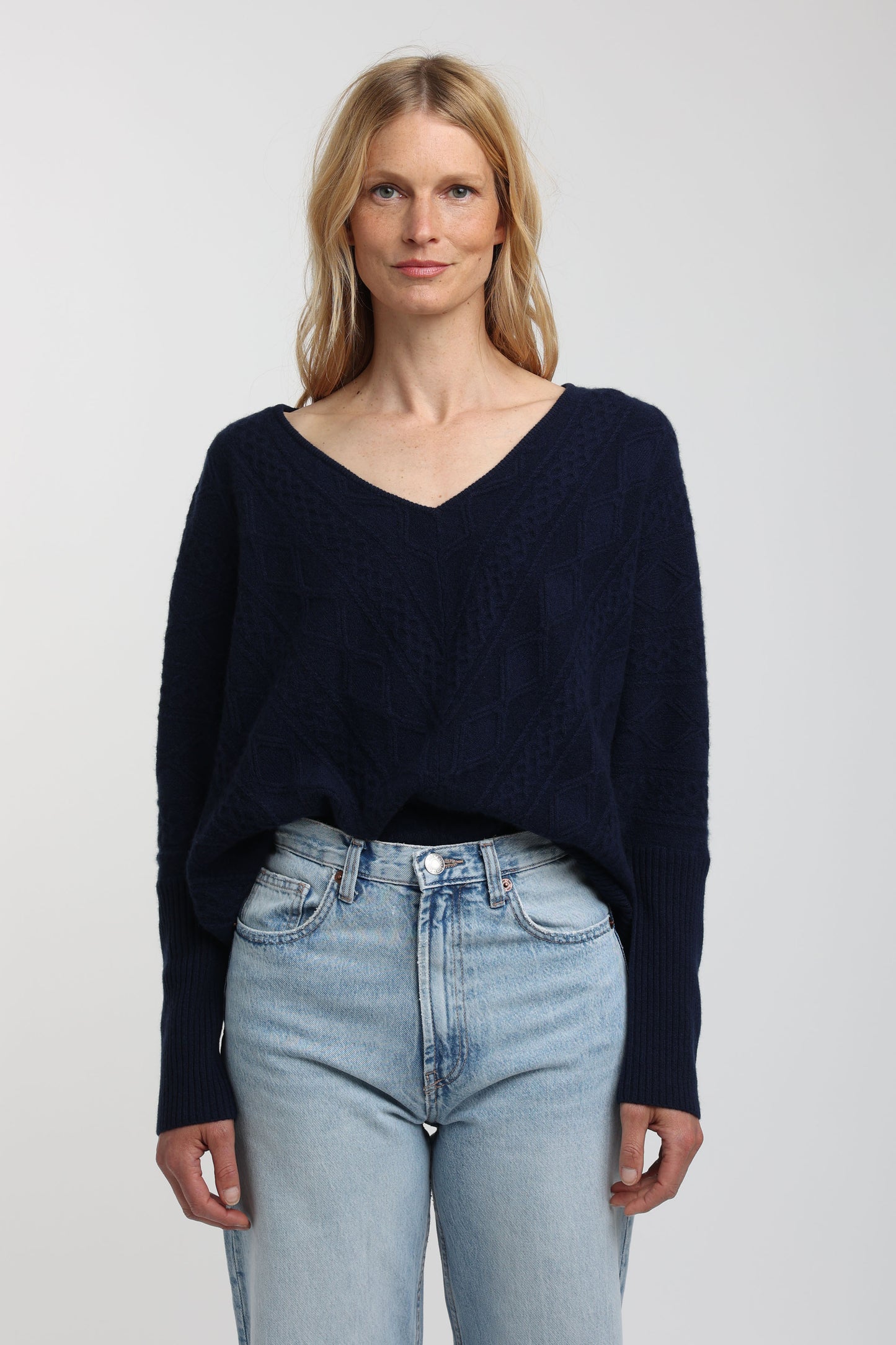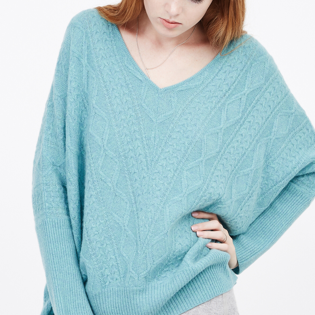 Indulge your senses in the soft cashmere fabric of this exquisite cable knit sweater. Boasting a drop shoulder and oversized design, this piece embodies effortless elegance and luxury, melding contemporary style with a timeless silhouette. Perfect for any occasion, this cashmere Cable Oversized Sweater is a must-have piece for your wardrobe.