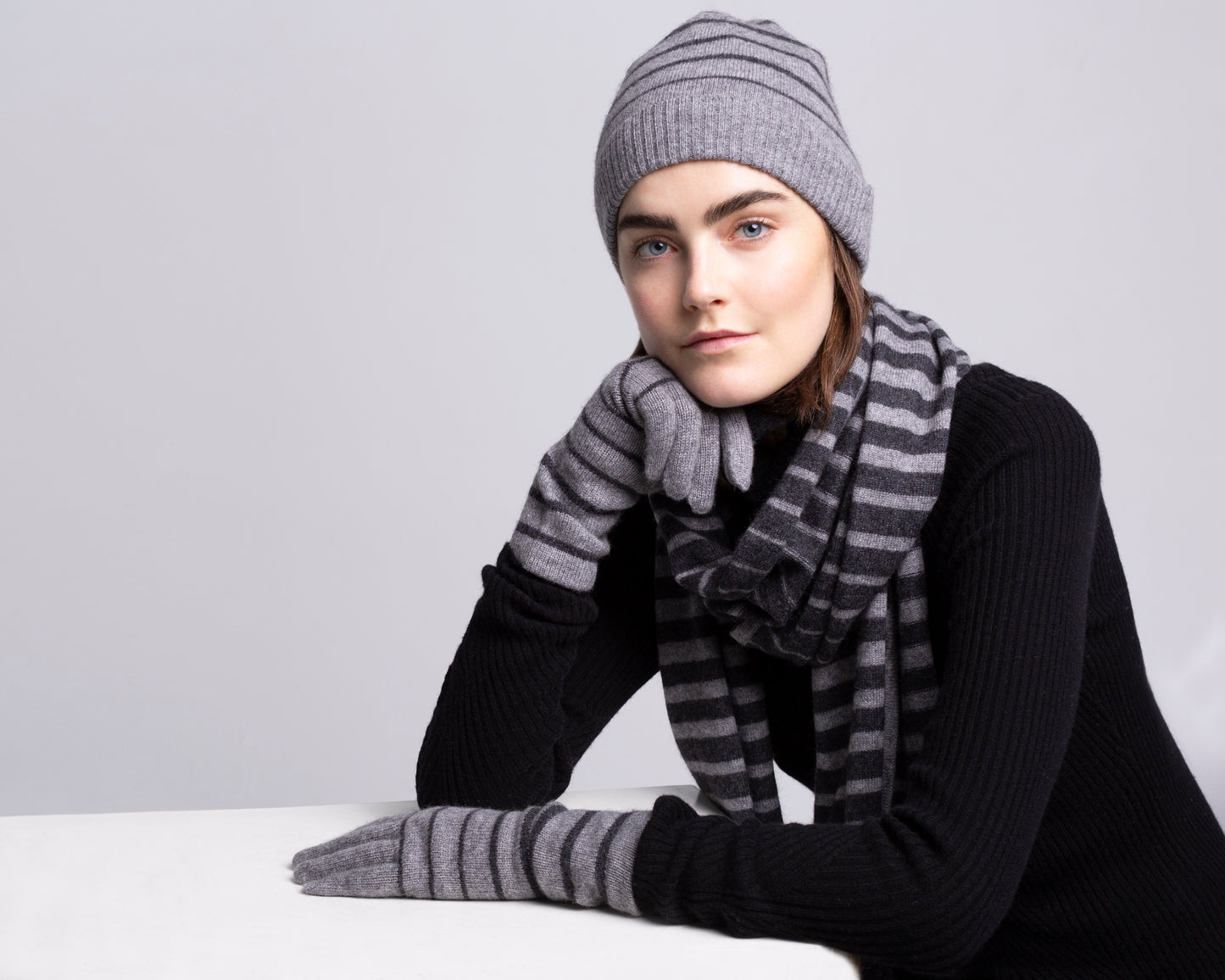 LUXURIOUS STRIPE HAT WITH ENGINEERED STRIPES WILL KEEP YOU WARM. FOLD OVER CUFF FOR MAXIMUM COZINESS! CAN BE WORN WITH MATCHING SCARF AND GLOVES.