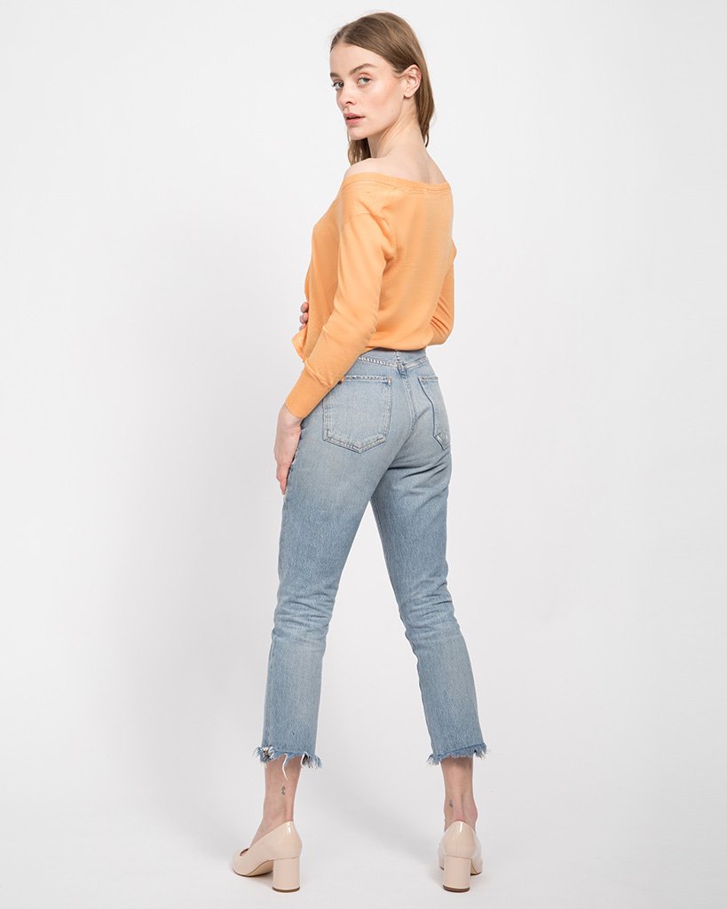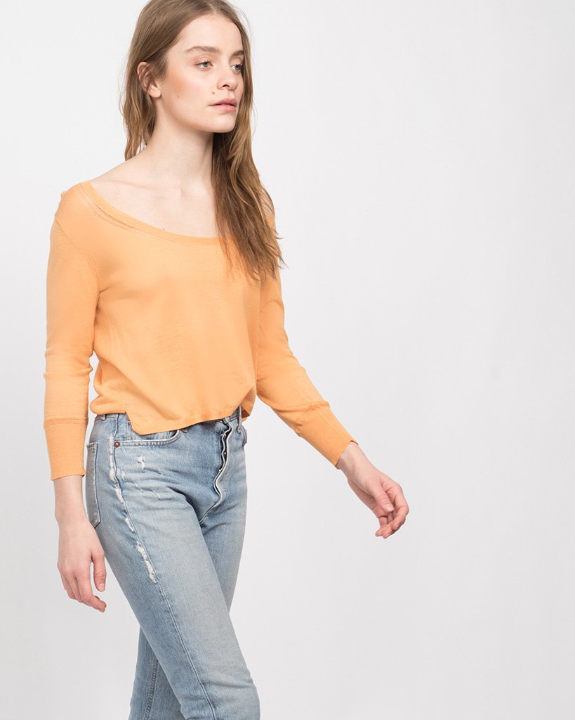 A soft, light weight, semi sheer knit sweater. An open boat neck and cropped fit give this simple top a retro look.