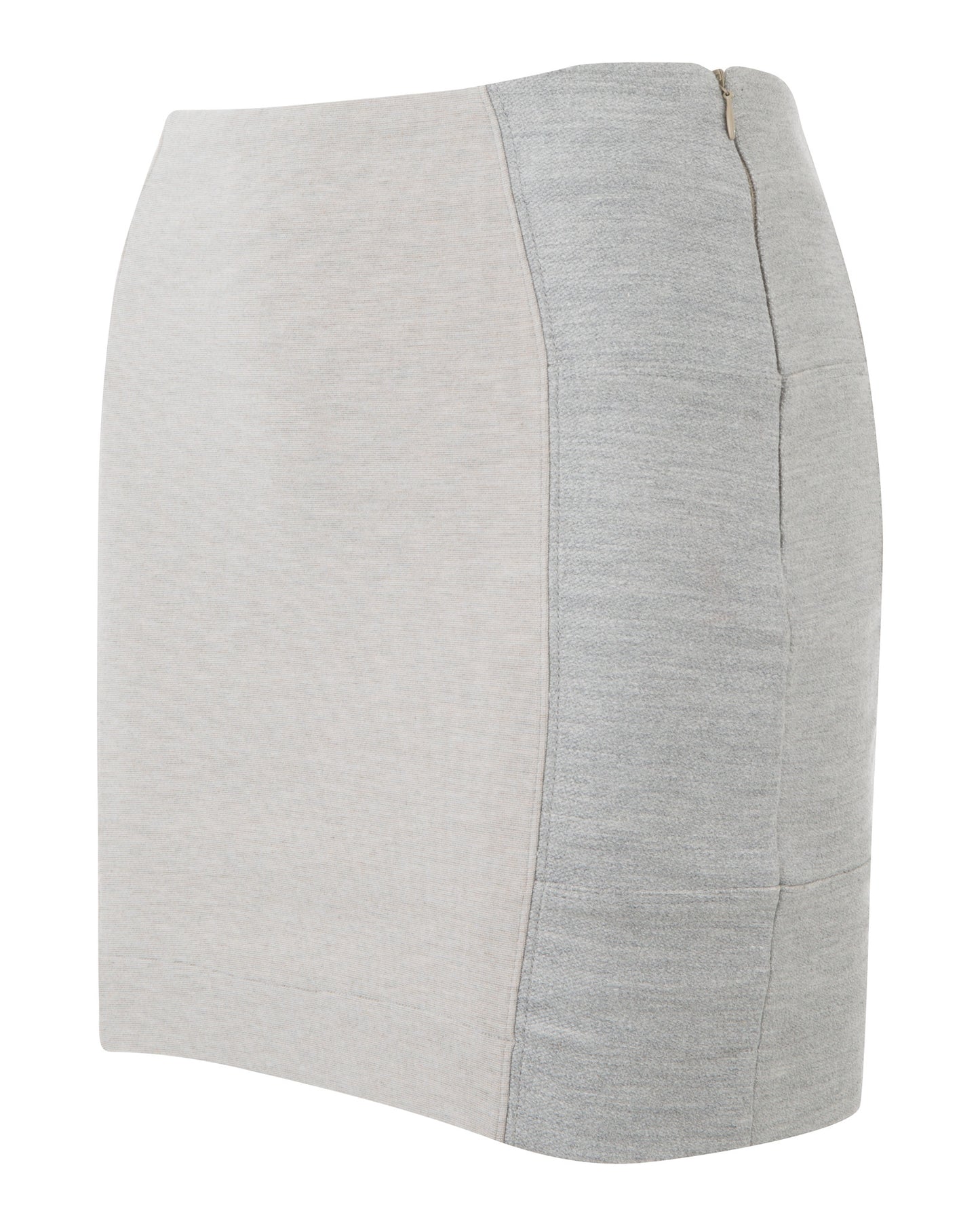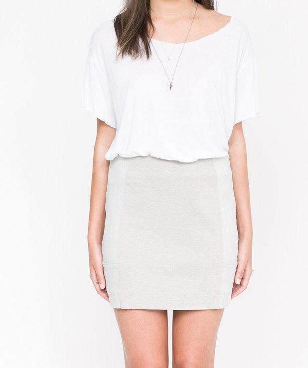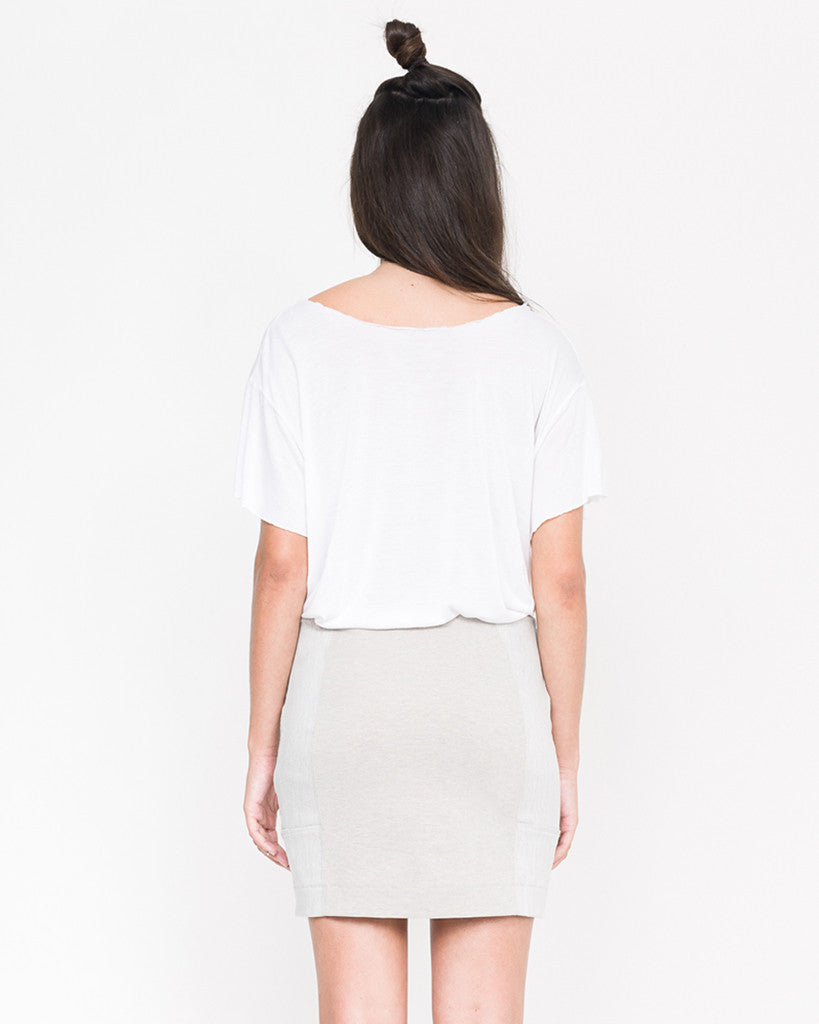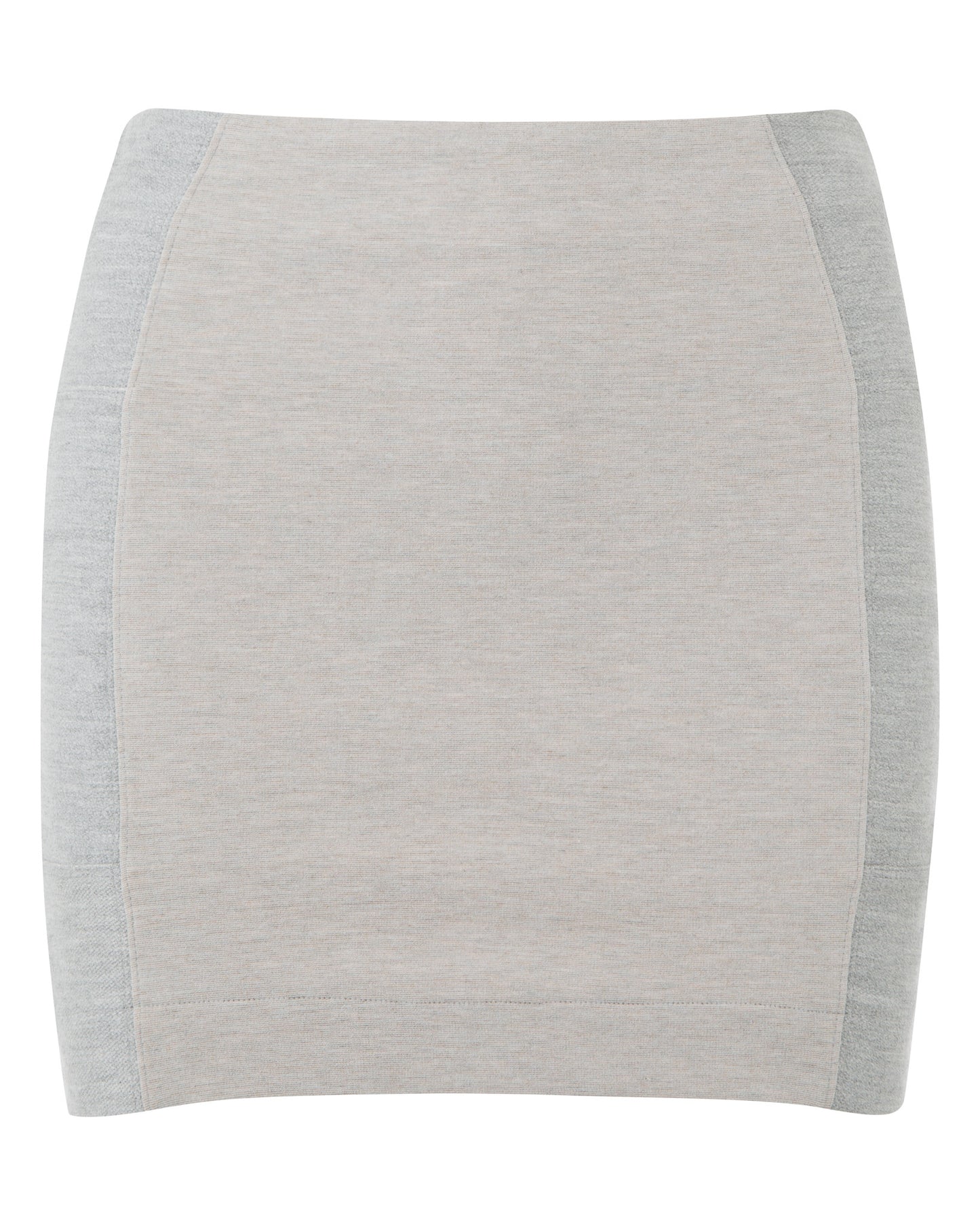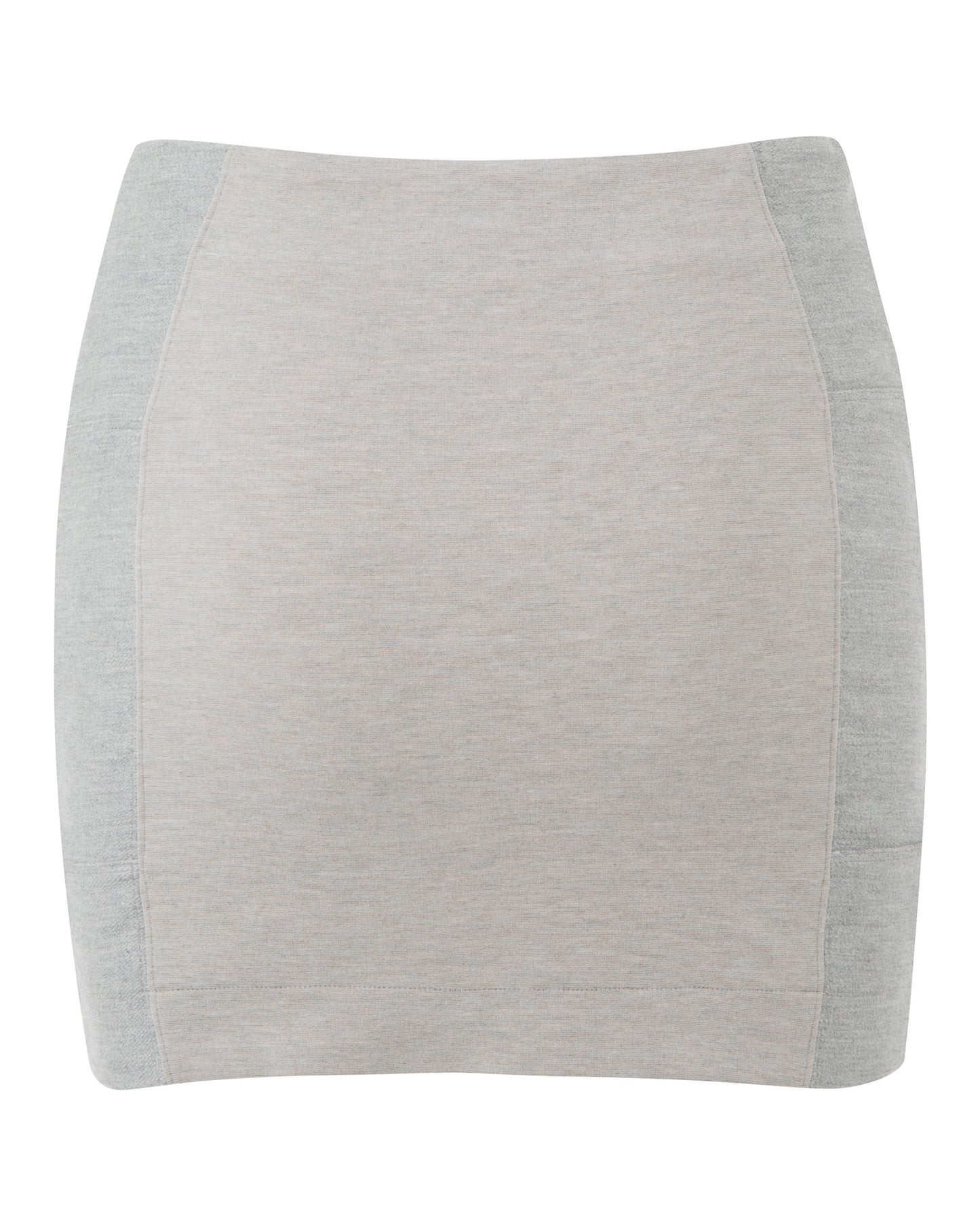 A mixed media, body-con skirt, sculpts every curve. Contrast panels at the hips create a clean silhouette. Pair with our favorite Nido Sweatshirt for a complete look.