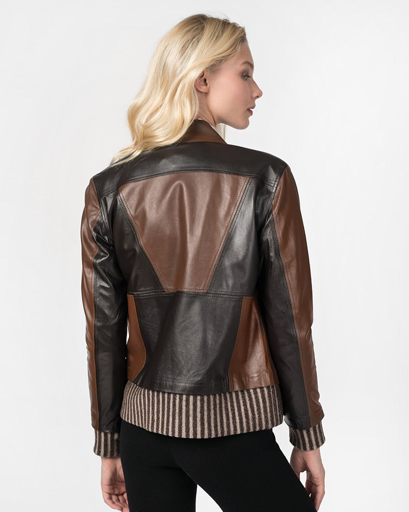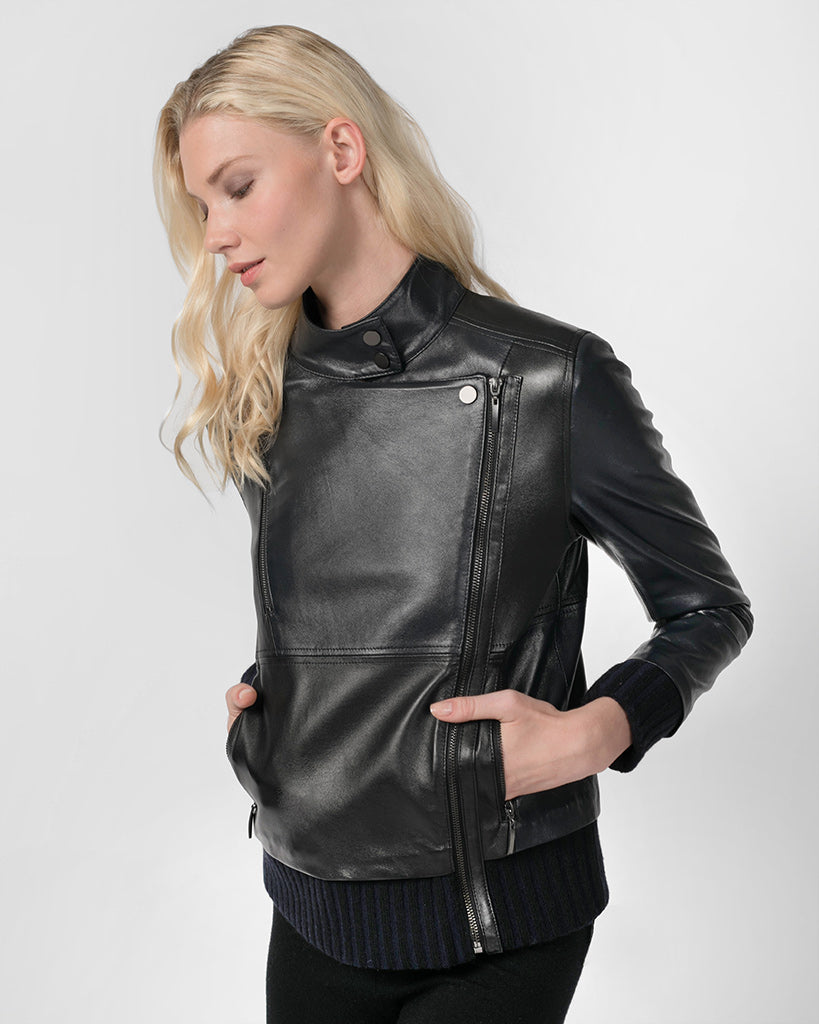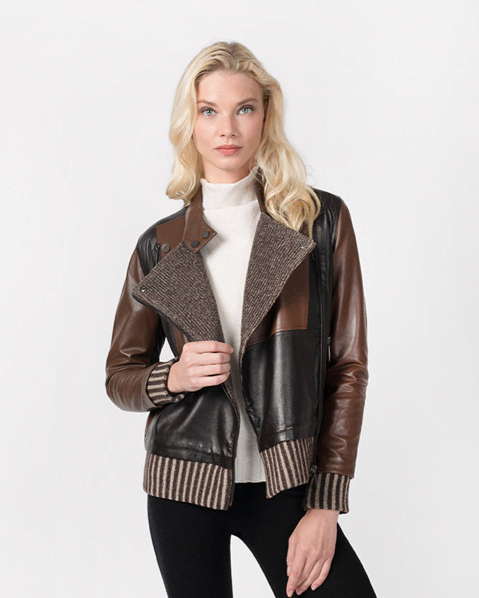 Elevate your style with our leather moto jacket, where modern meets timeless. Featuring color-blocked leather, bonded cashmere paneling, and an edgy asymmetrical zipper closure, this jacket is a bold fashion statement. Inside, you'll discover the cozy comfort of shaker-stitched cashmere, adding warmth and luxury to your look.