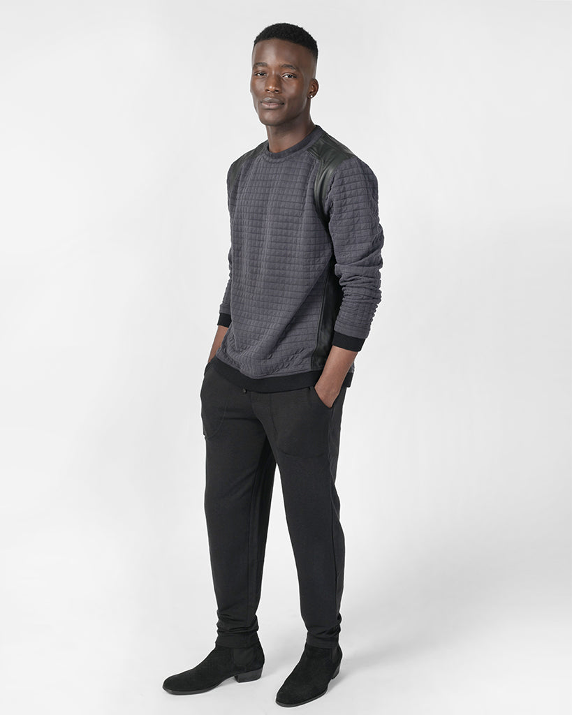 A mixed-media sweatshirt in a textured cubist pattern. Contrast trims add to the designer details in the most stylish way.