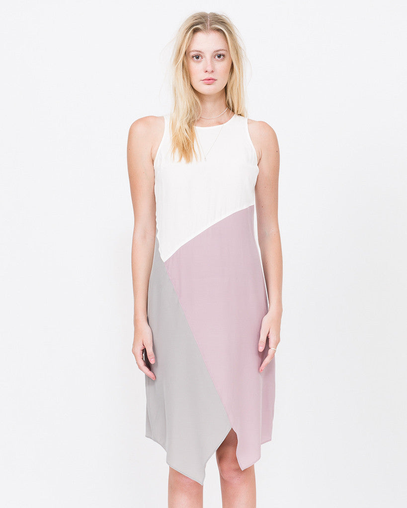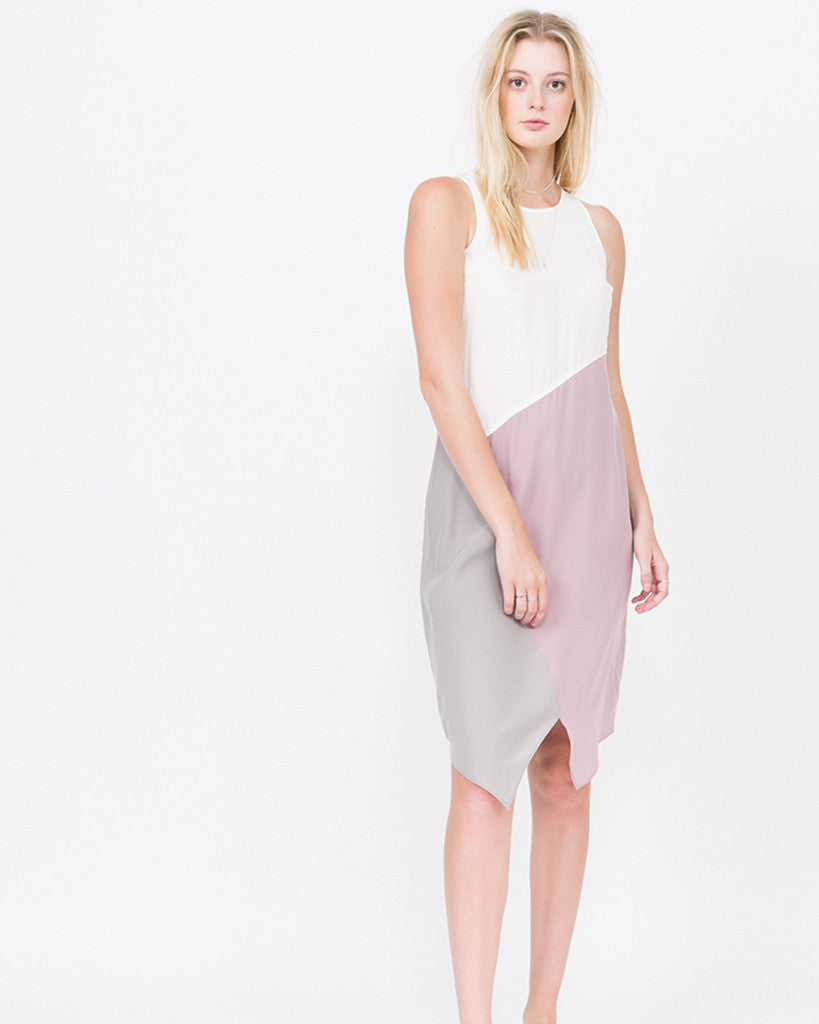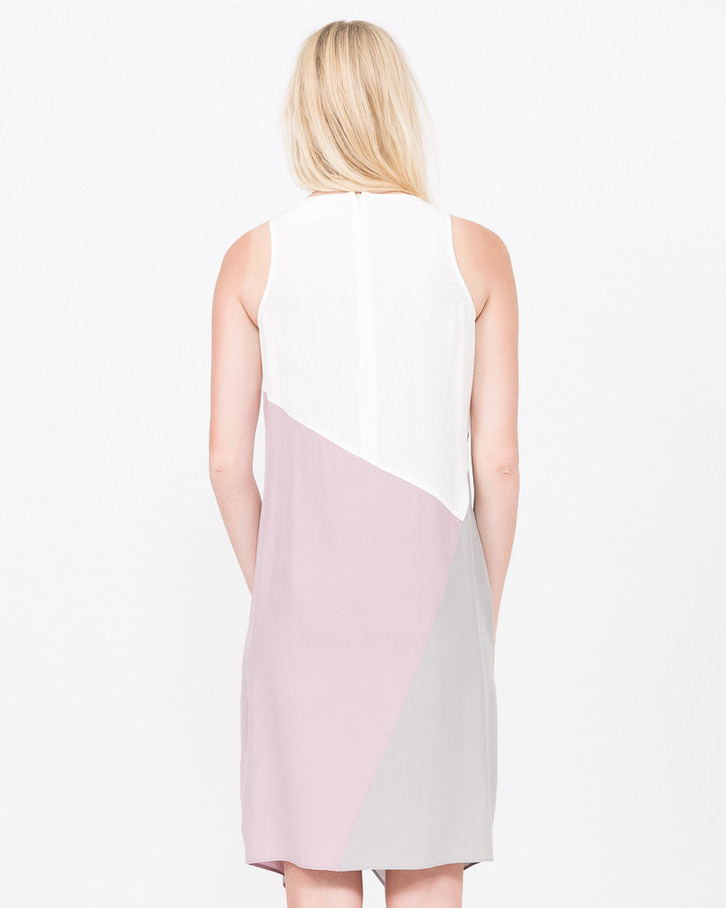 Get the angles! Engineered sleeveless dress with asymmetrical hem perfectly coordinated in pink ,grey and white.. Softest satin silk for an easy fit.