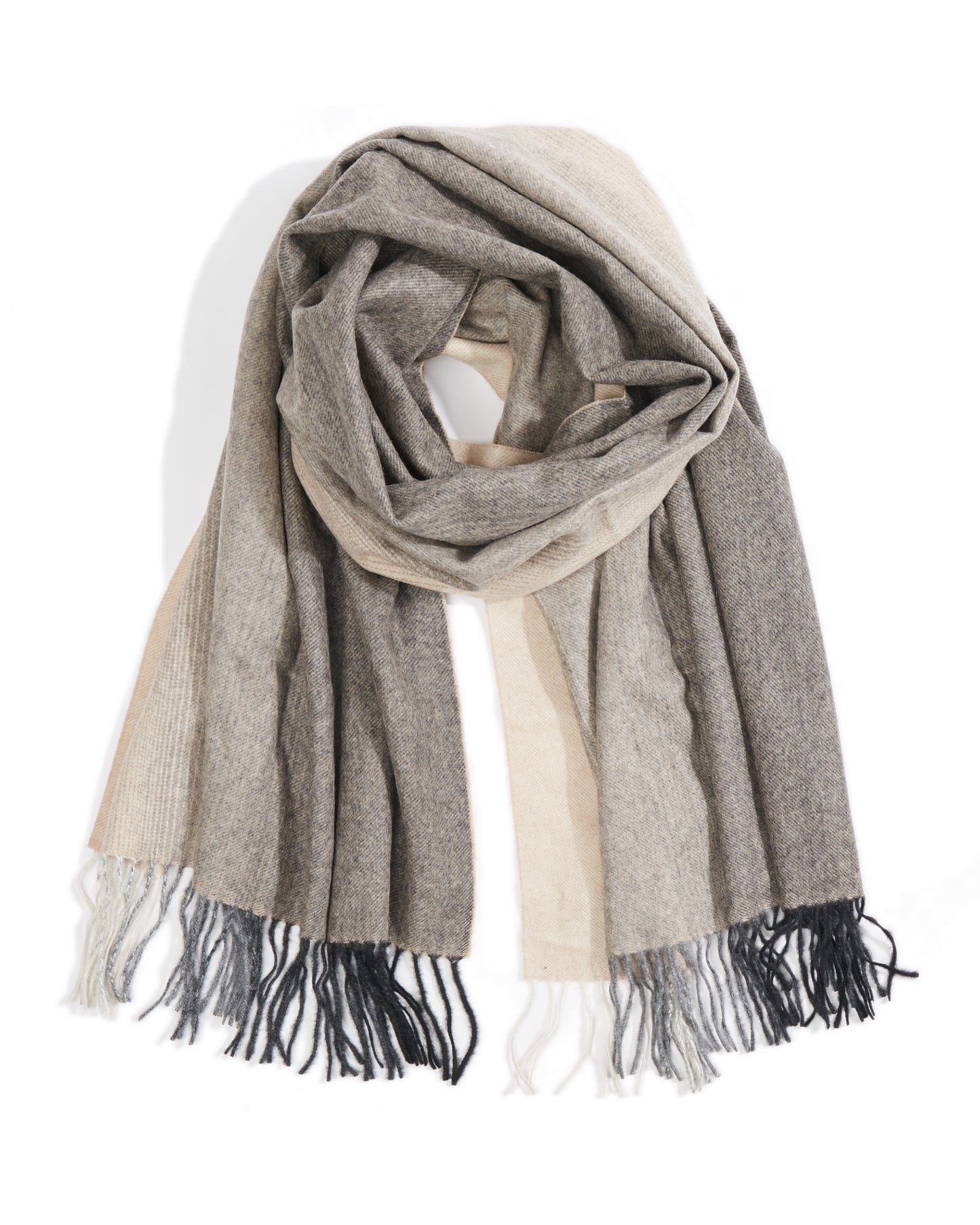 LUXE oversized woven scarf in ombre color combo. Fringe bottom. Shades of light camel to taupe and shades of light grey to charcoal. Great for men or women as colors are neutral.