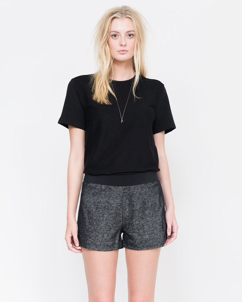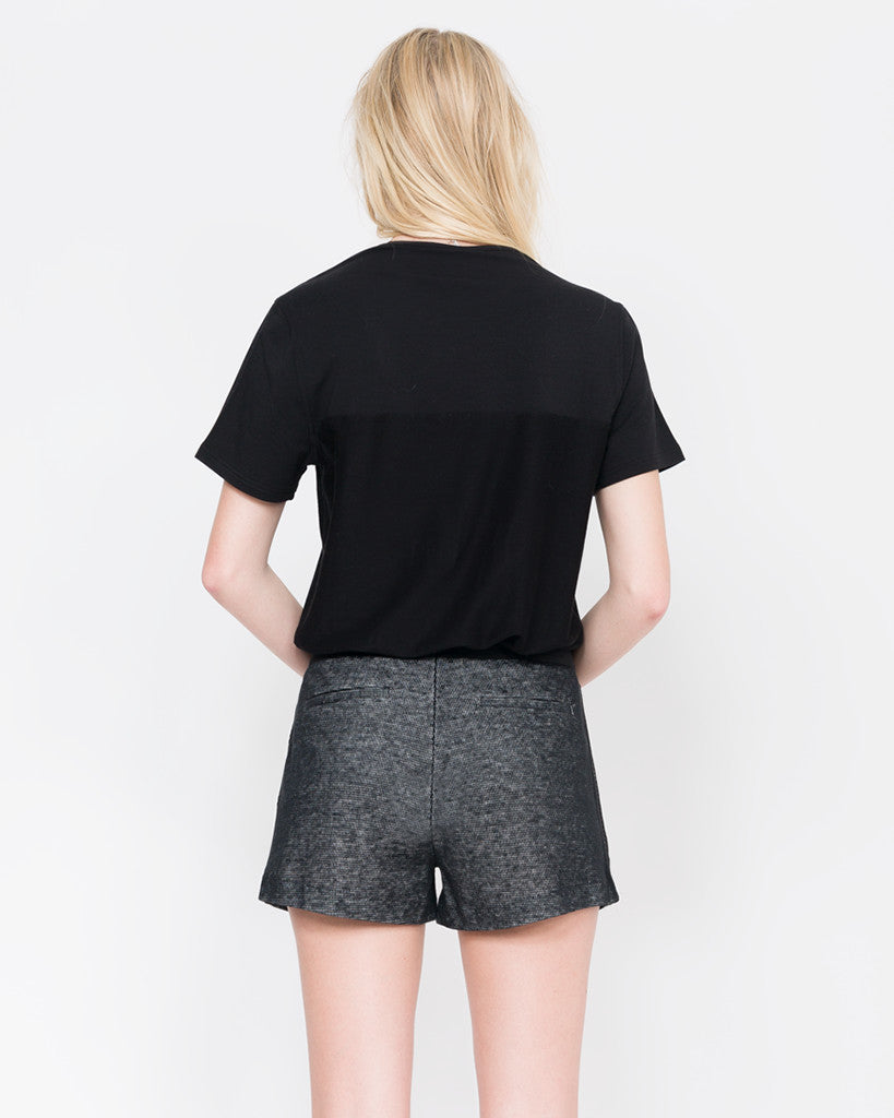 A short story - these shorts are a cool mixture of linen jersey and silk. The added side chain detail gives a discrete edge to a sweet short.