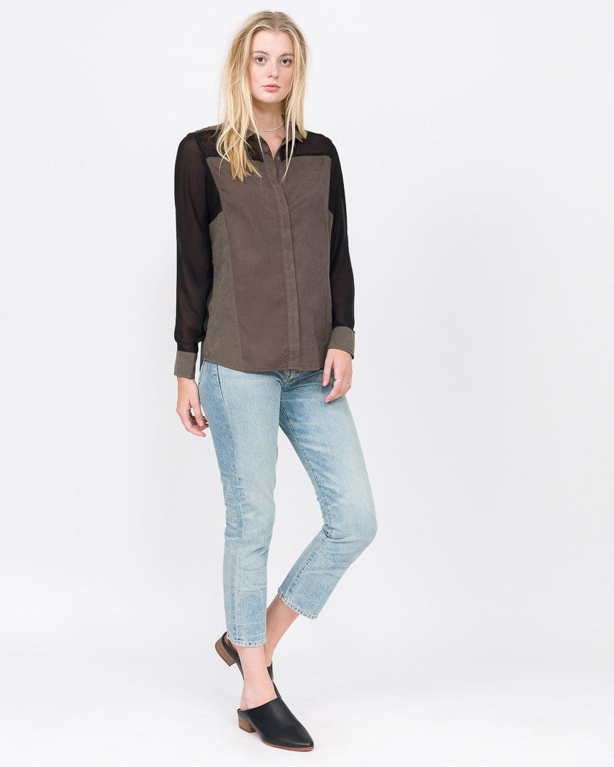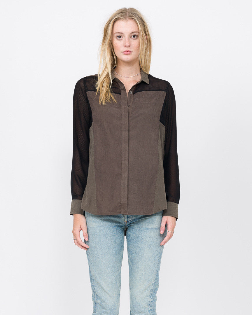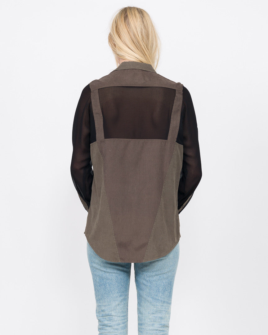 Utilitarian meets sexy. This button down incorporates design elements such as color blocking and sheer paneling for an unexpected peek of skin.