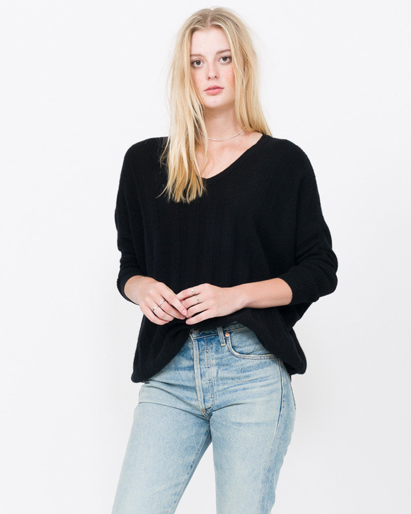 Keep it simple and cozy with a luxurious cashmere oversized V-neck pullover. Knit with dropped shoulders and elongated ribbed sleeves. The stitch is feminine and flattering. A closet staple for those lazy weekends.