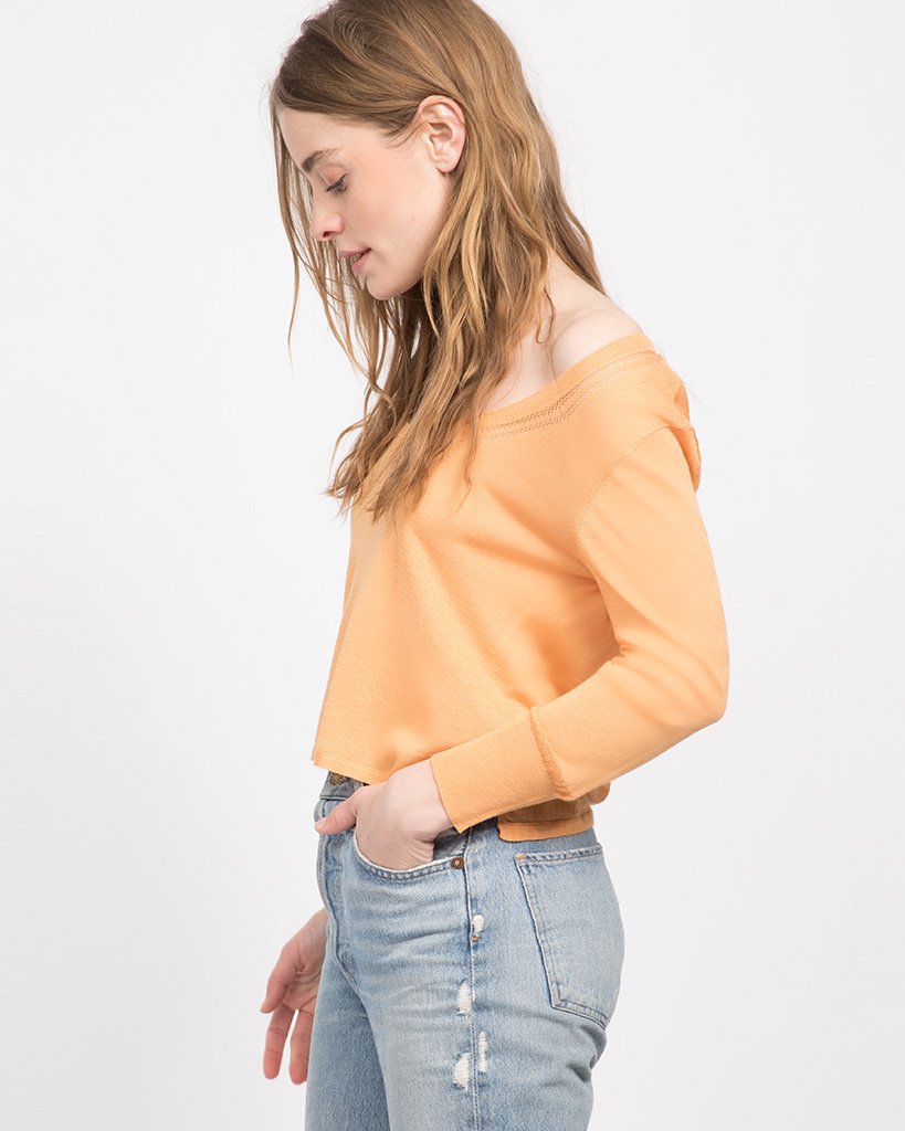 A soft, light weight, semi sheer knit sweater. An open boat neck and cropped fit give this simple top a retro look.