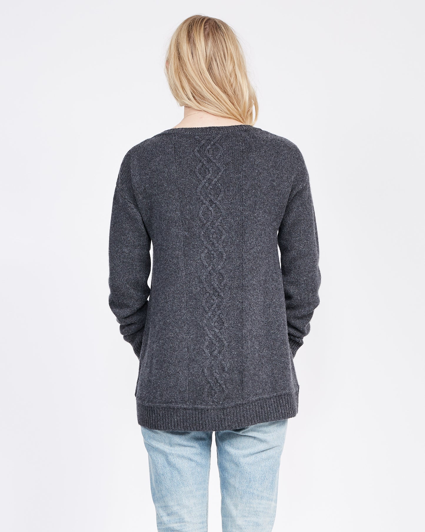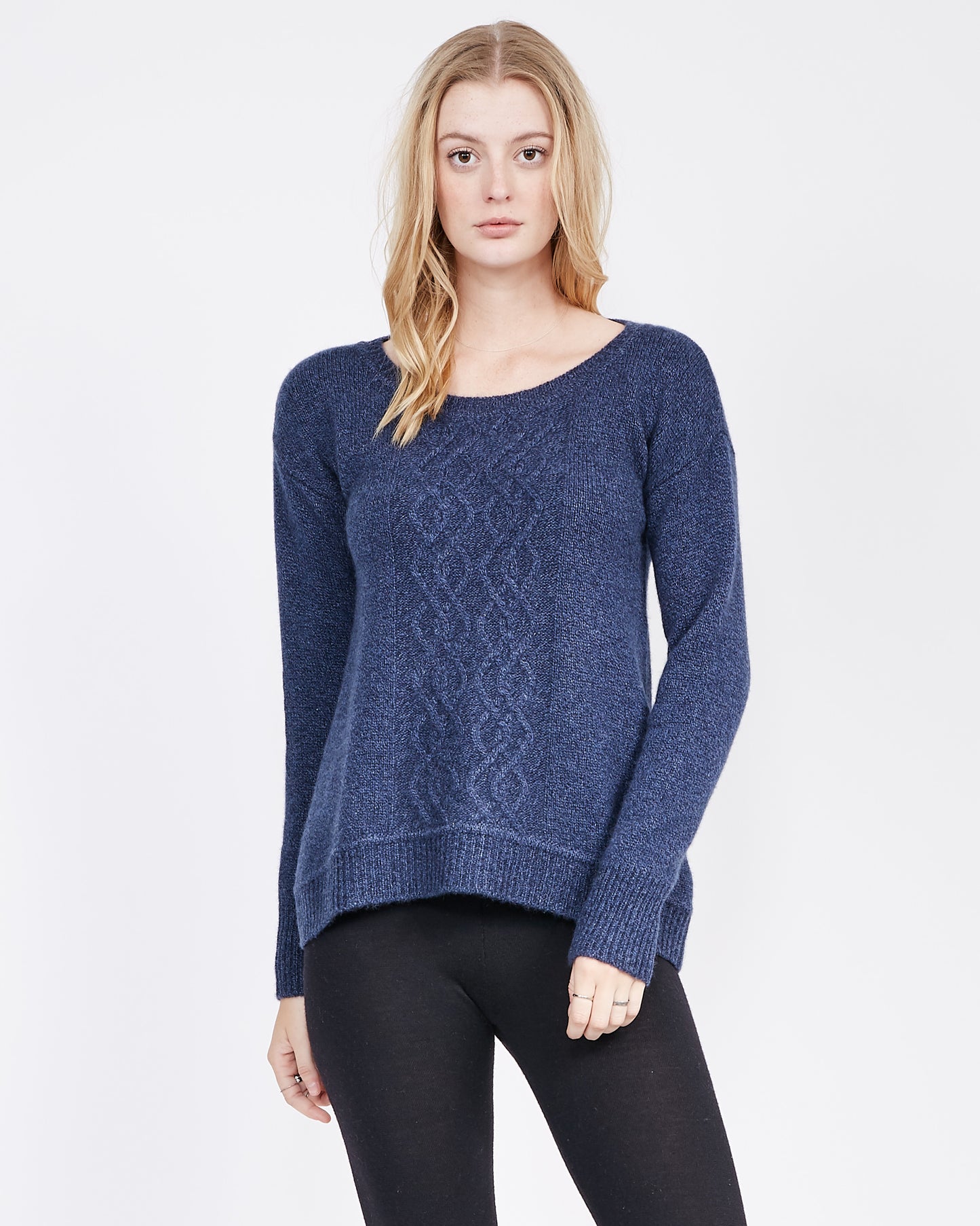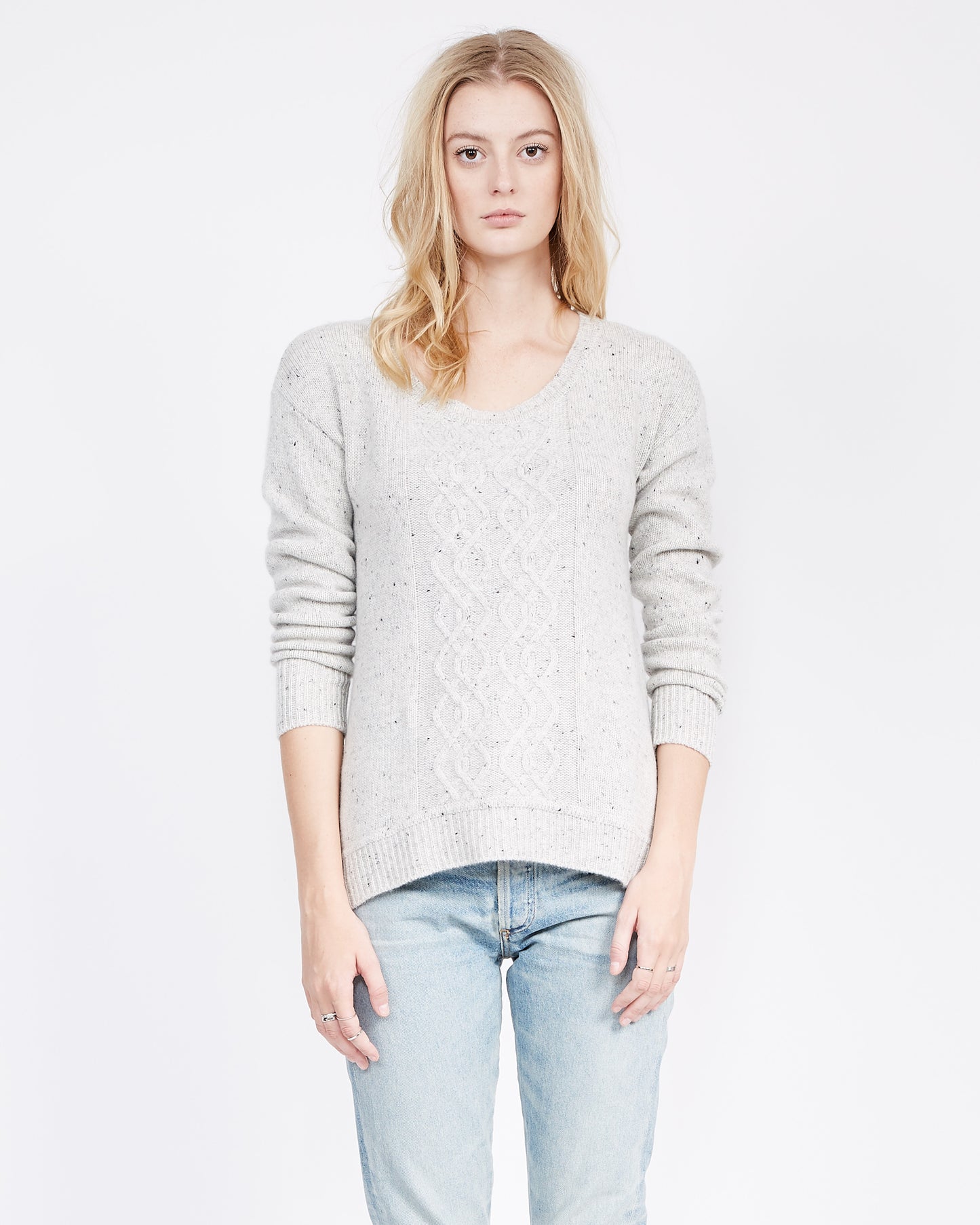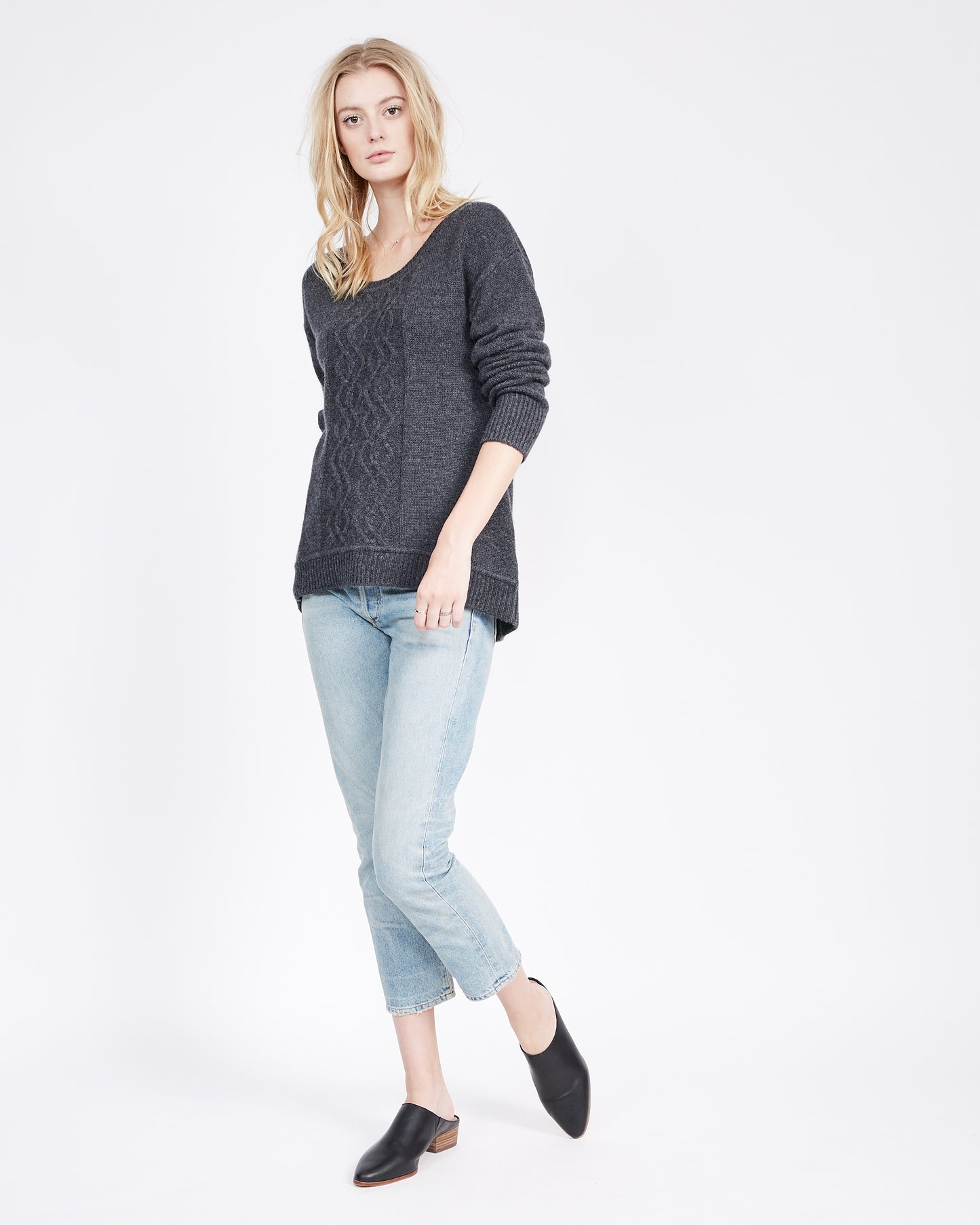 Everyone's favorite cable knit sweater. Scoop neck and a slight hi-low hem which makes it easy for tucking it. Super luxe!