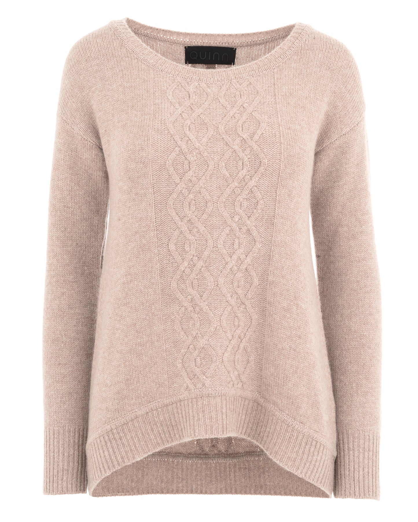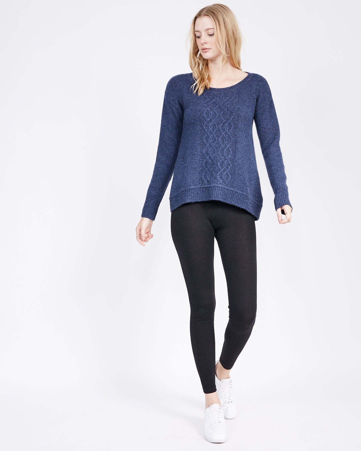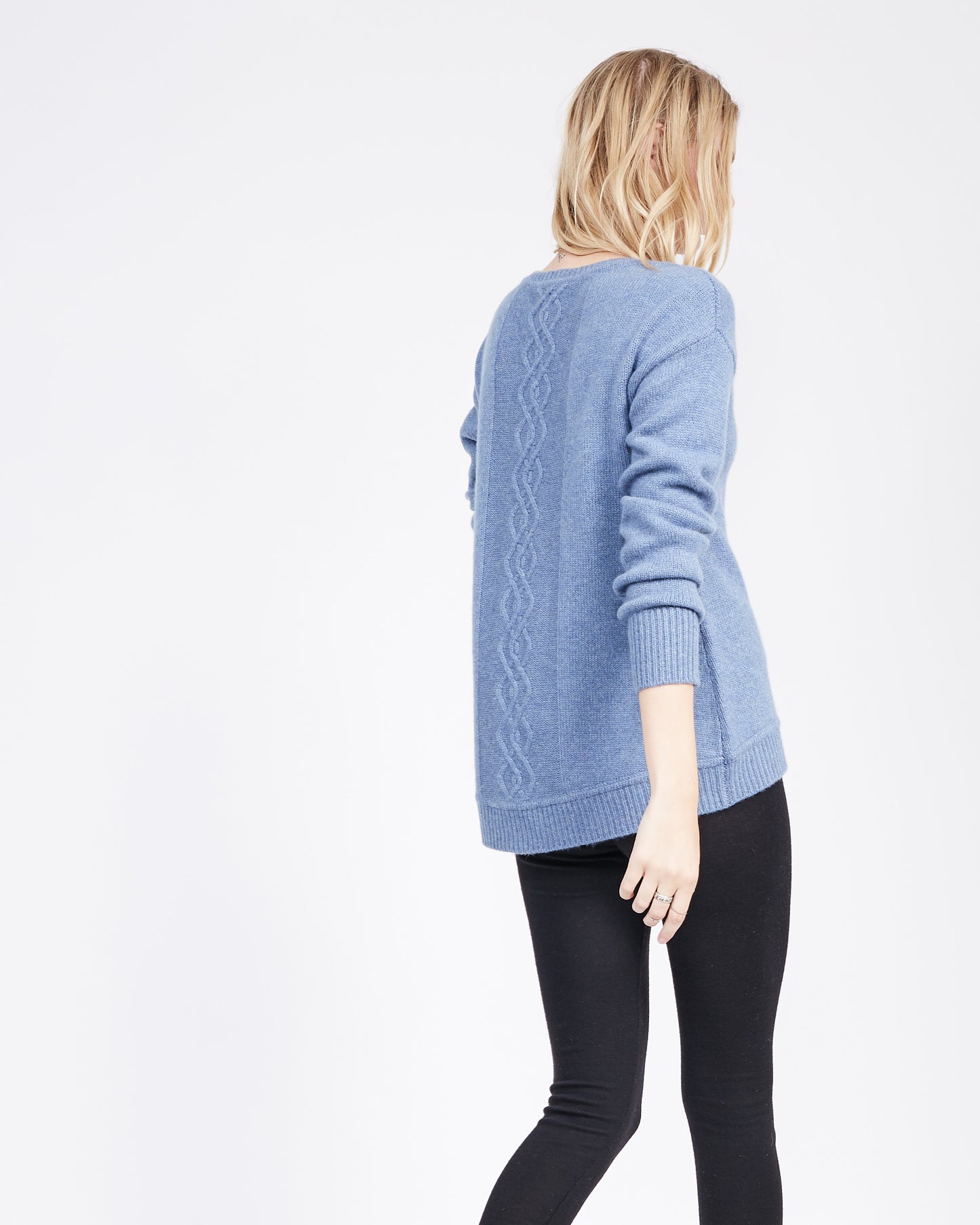 Everyone's favorite cable knit sweater. Scoop neck and a slight hi-low hem which makes it easy for tucking it. Super luxe!