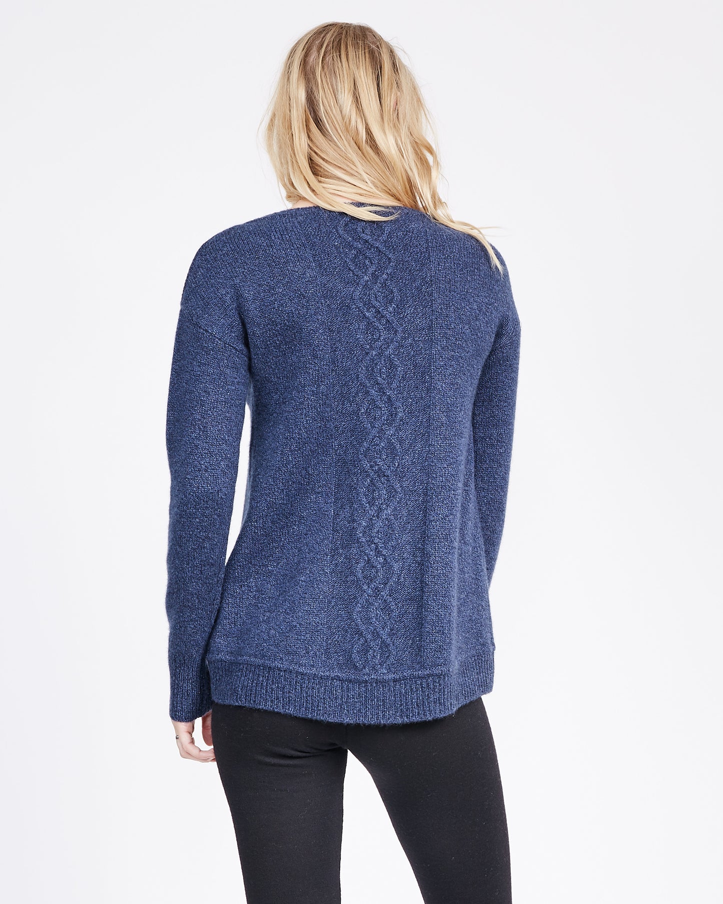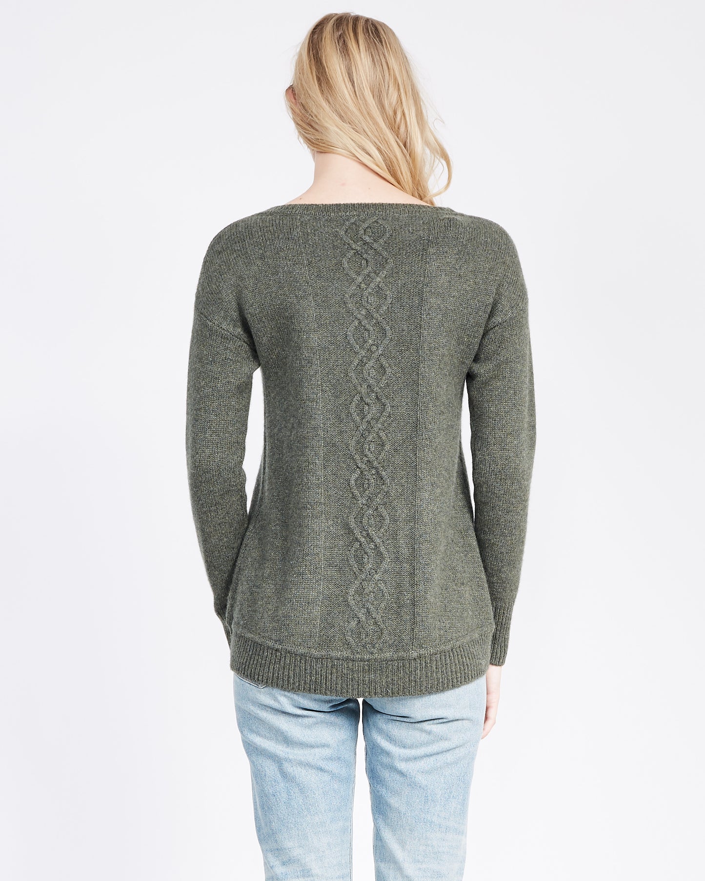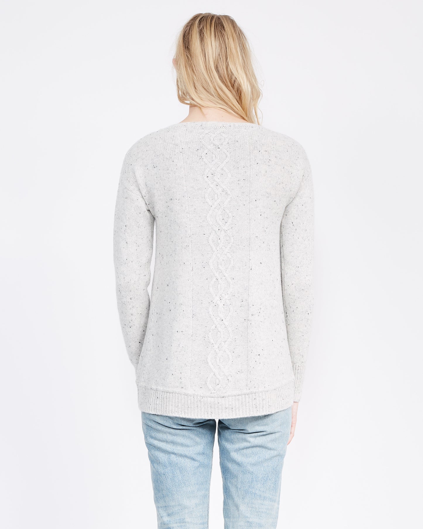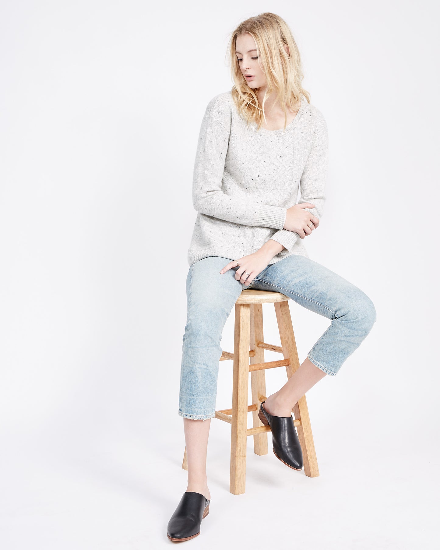 Everyone's favorite cable knit sweater. Scoop neck and a slight hi-low hem which makes it easy for tucking it. Super luxe!