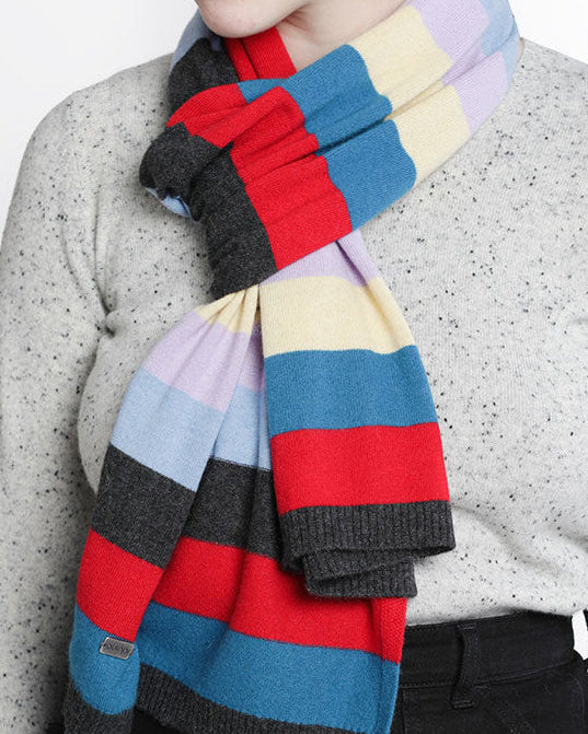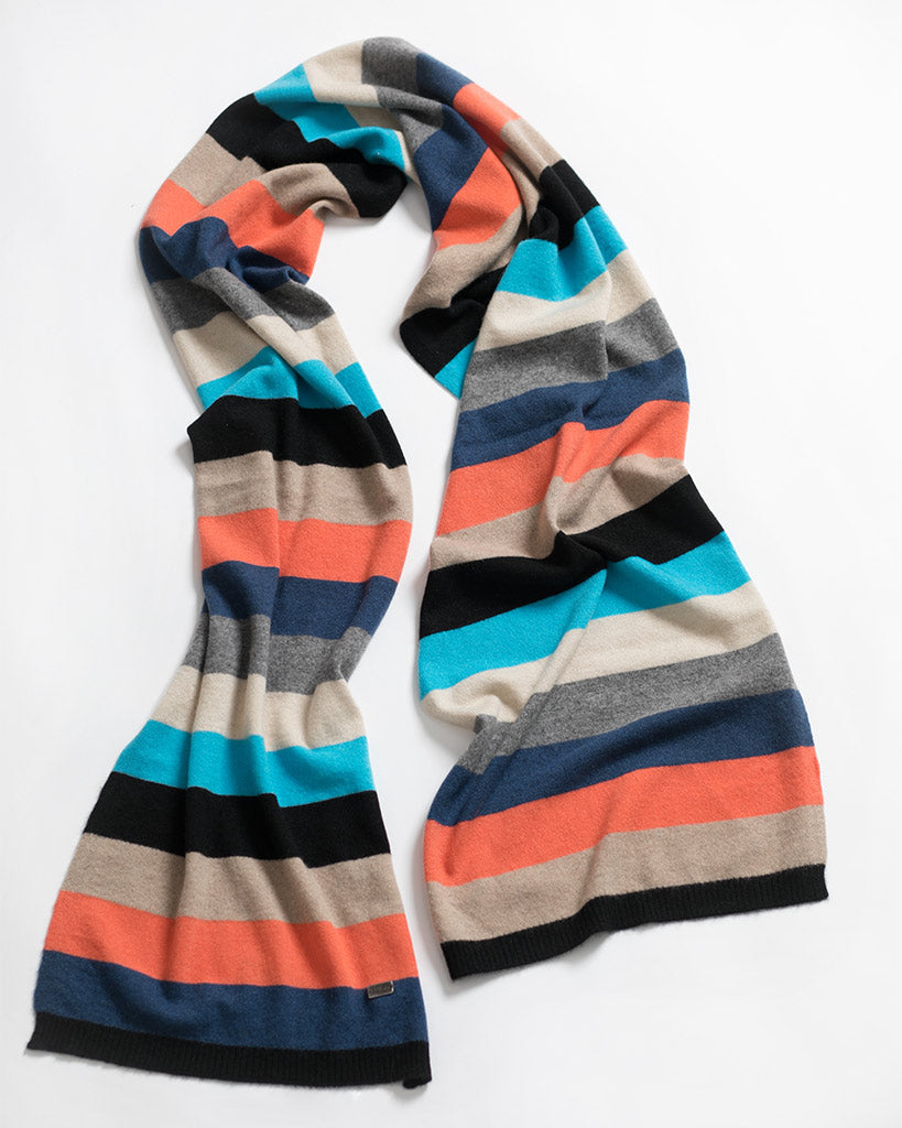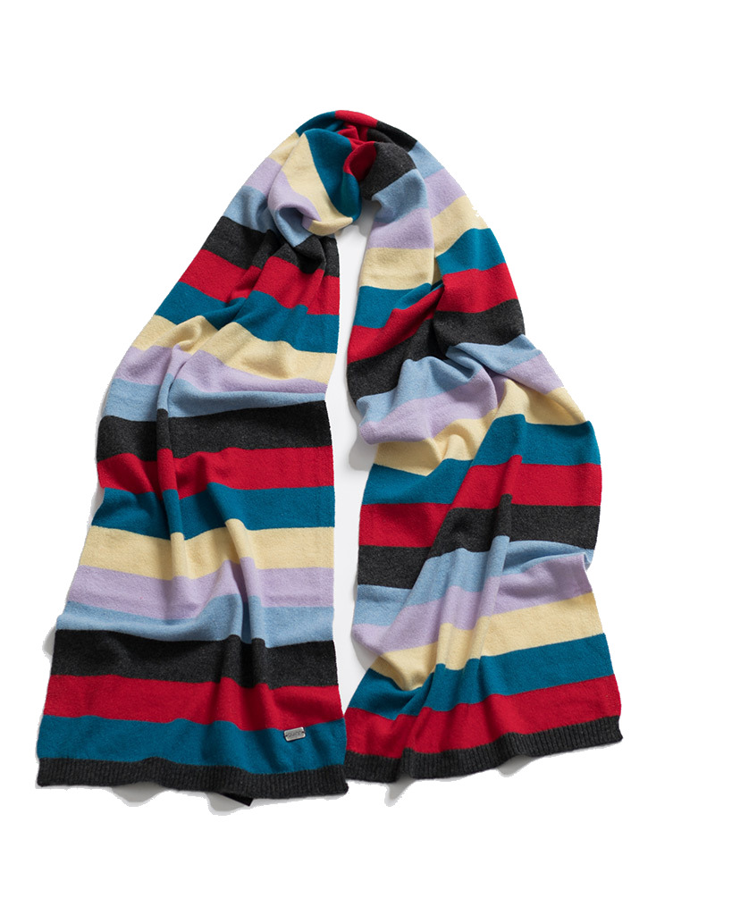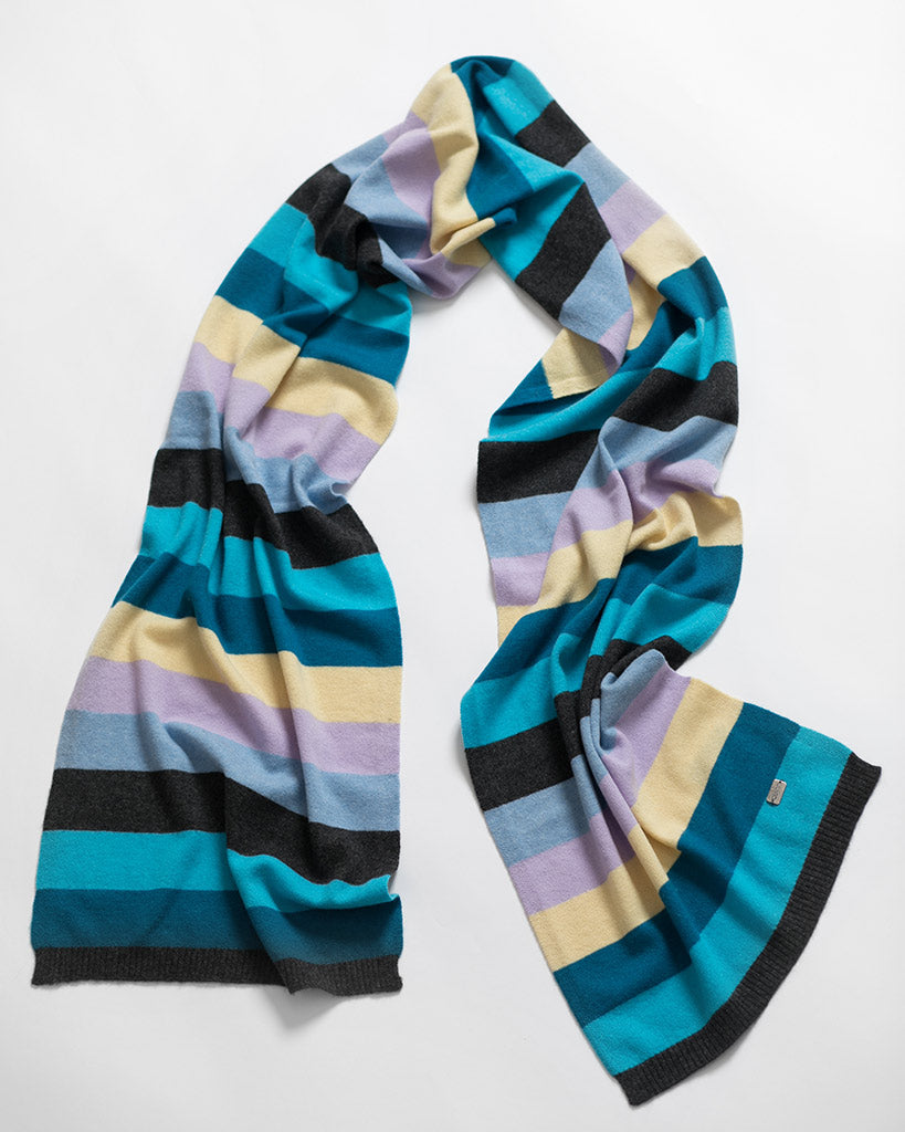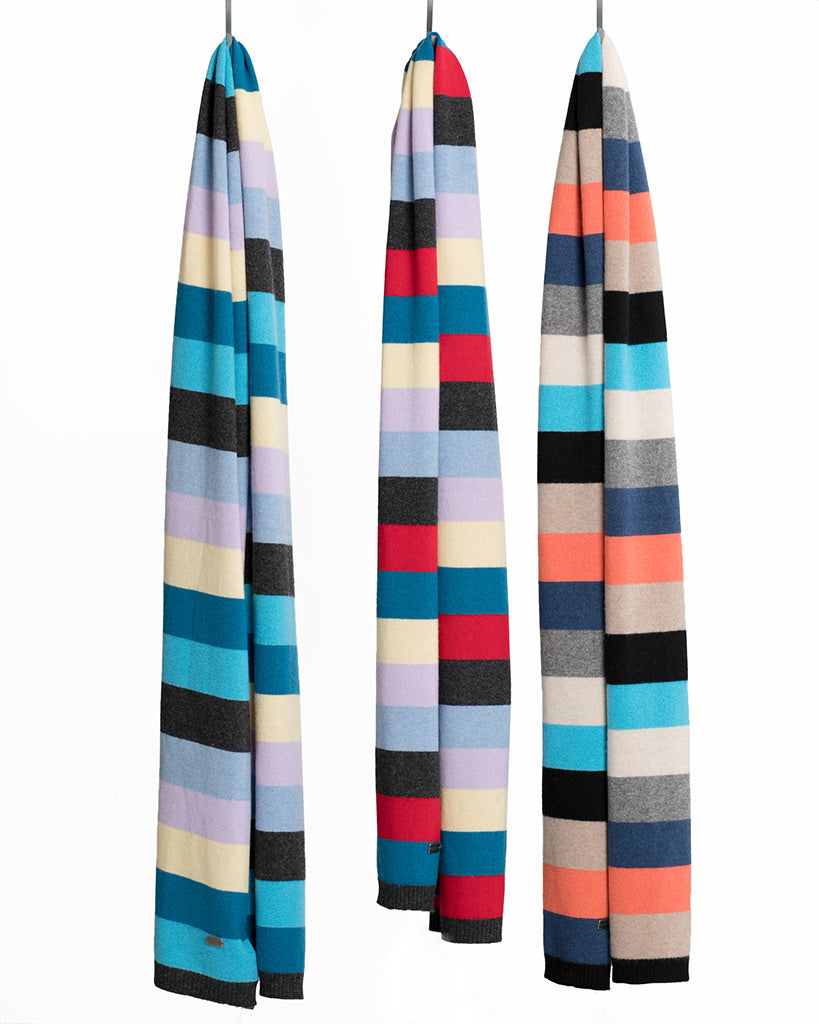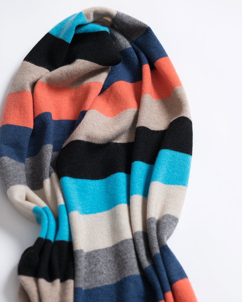 We took our old fabric swatches, deconstructed them, then reconstructed and recycled them into this soft, multi-colored, 1 inch striped, jersey scarf