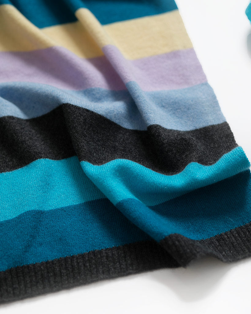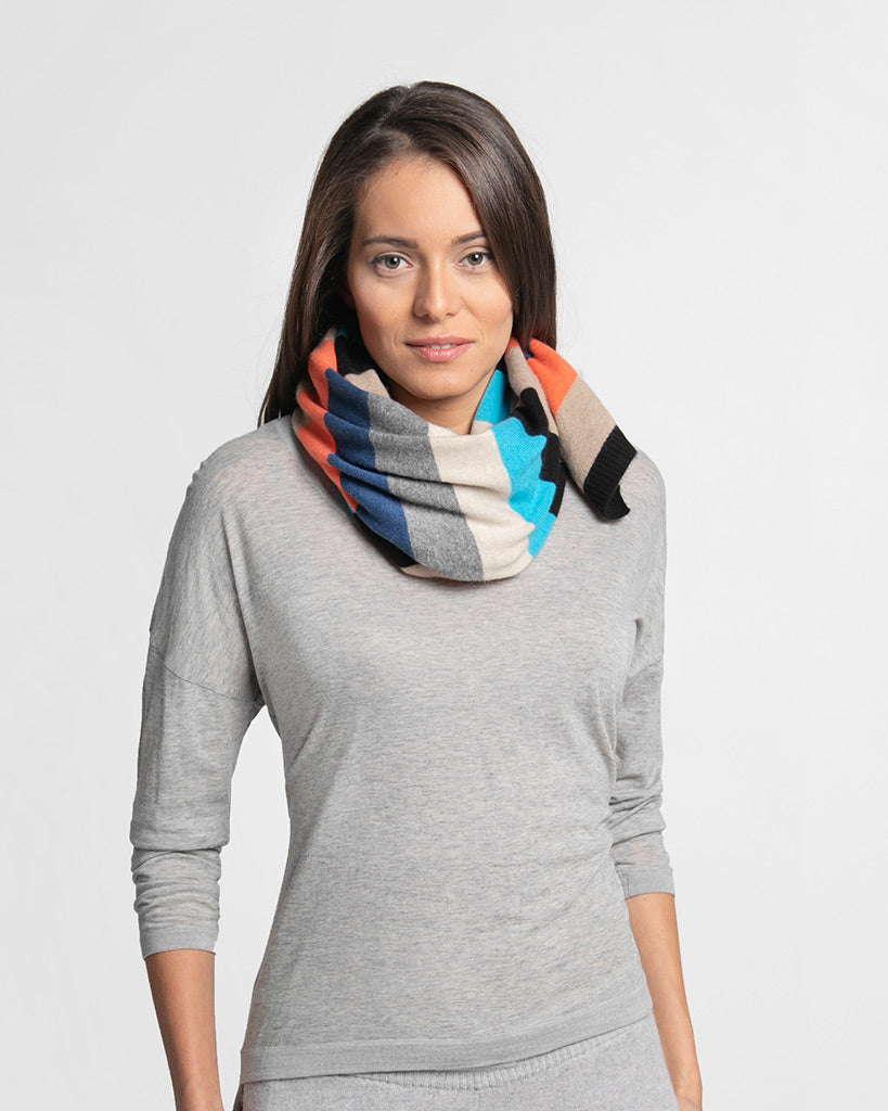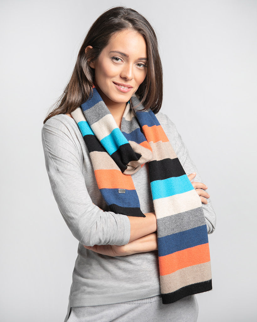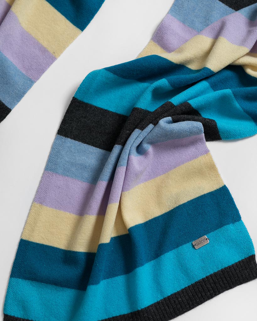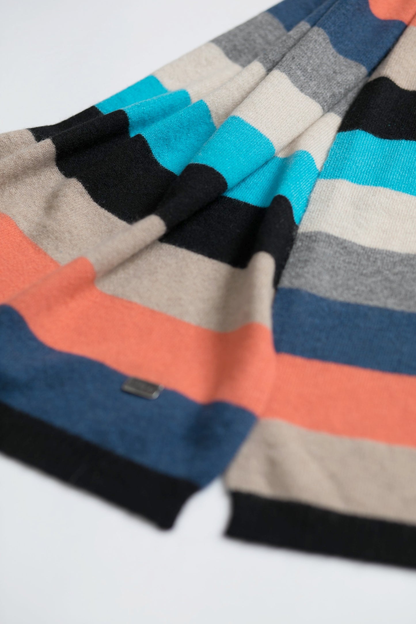 We took our old fabric swatches, deconstructed them, then reconstructed and recycled them into this soft, multi-colored, 1 inch striped, jersey scarf