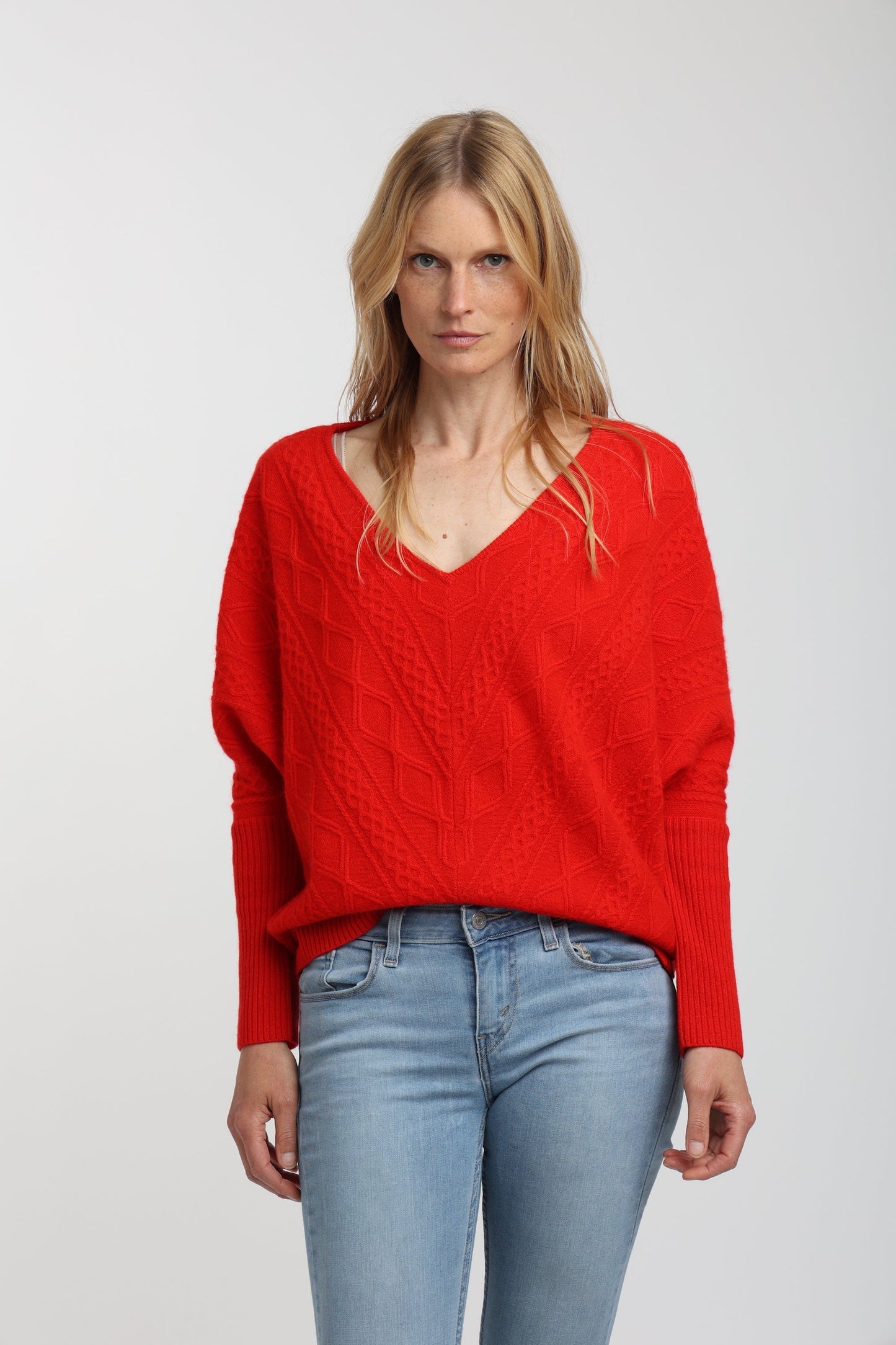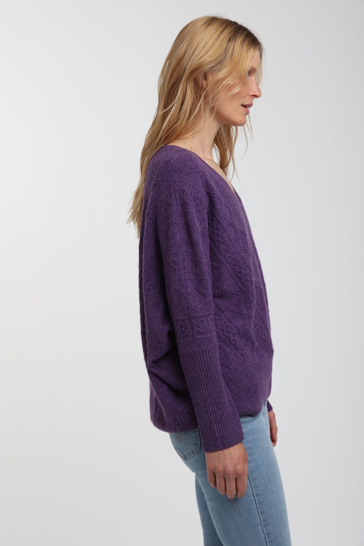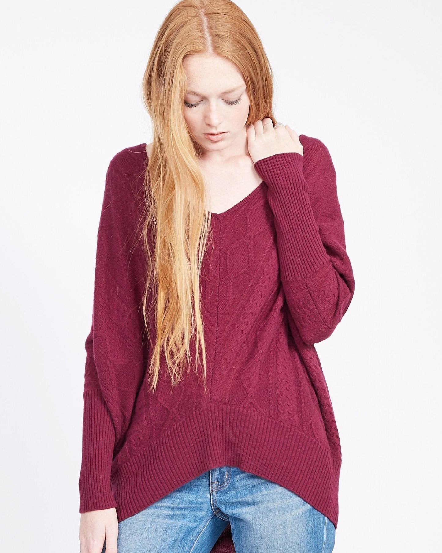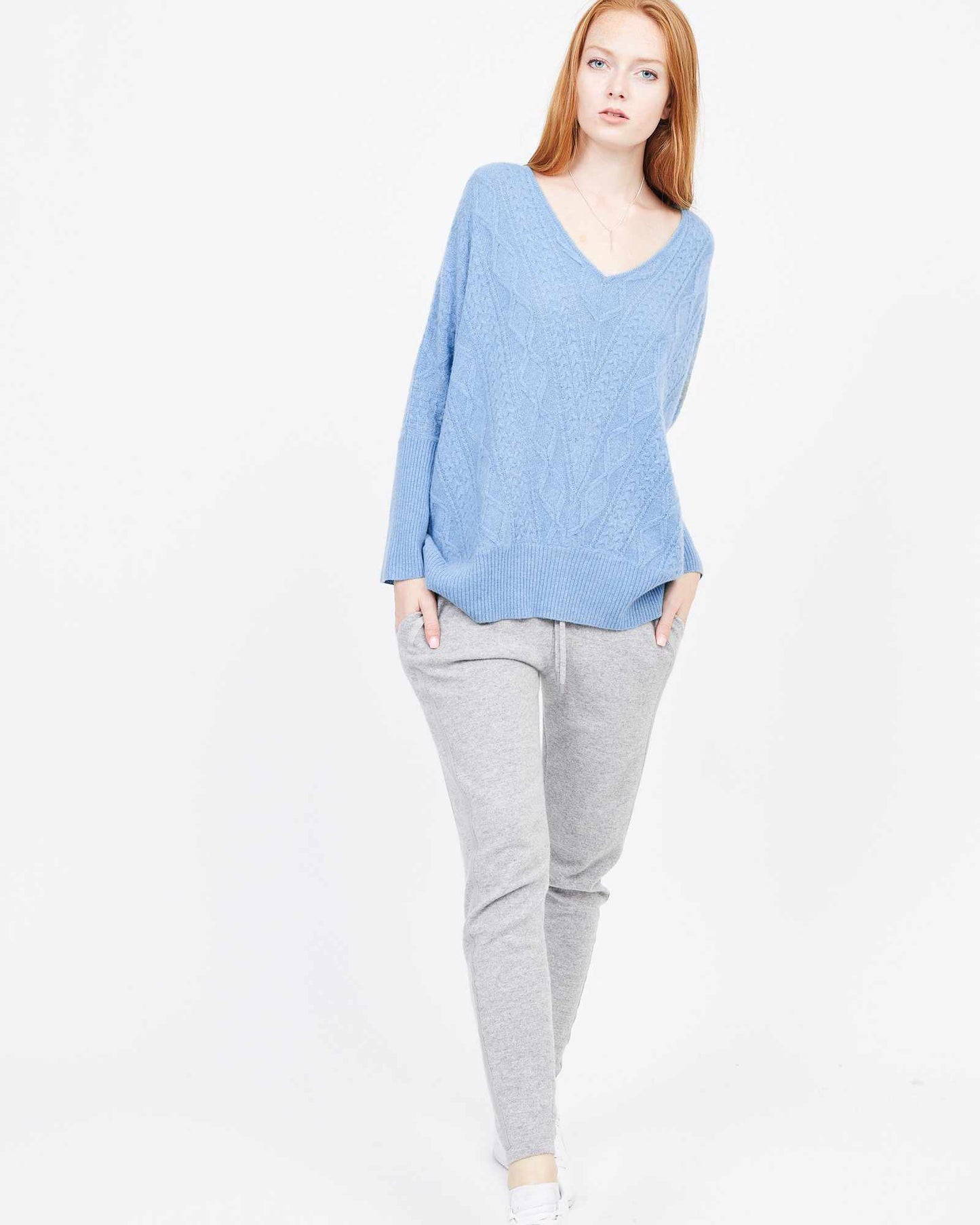 Indulge your senses in the soft cashmere fabric of this exquisite cable knit sweater. Boasting a drop shoulder and oversized design, this piece embodies effortless elegance and luxury, melding contemporary style with a timeless silhouette. Perfect for any occasion, this cashmere Cable Oversized Sweater is a must-have piece for your wardrobe.