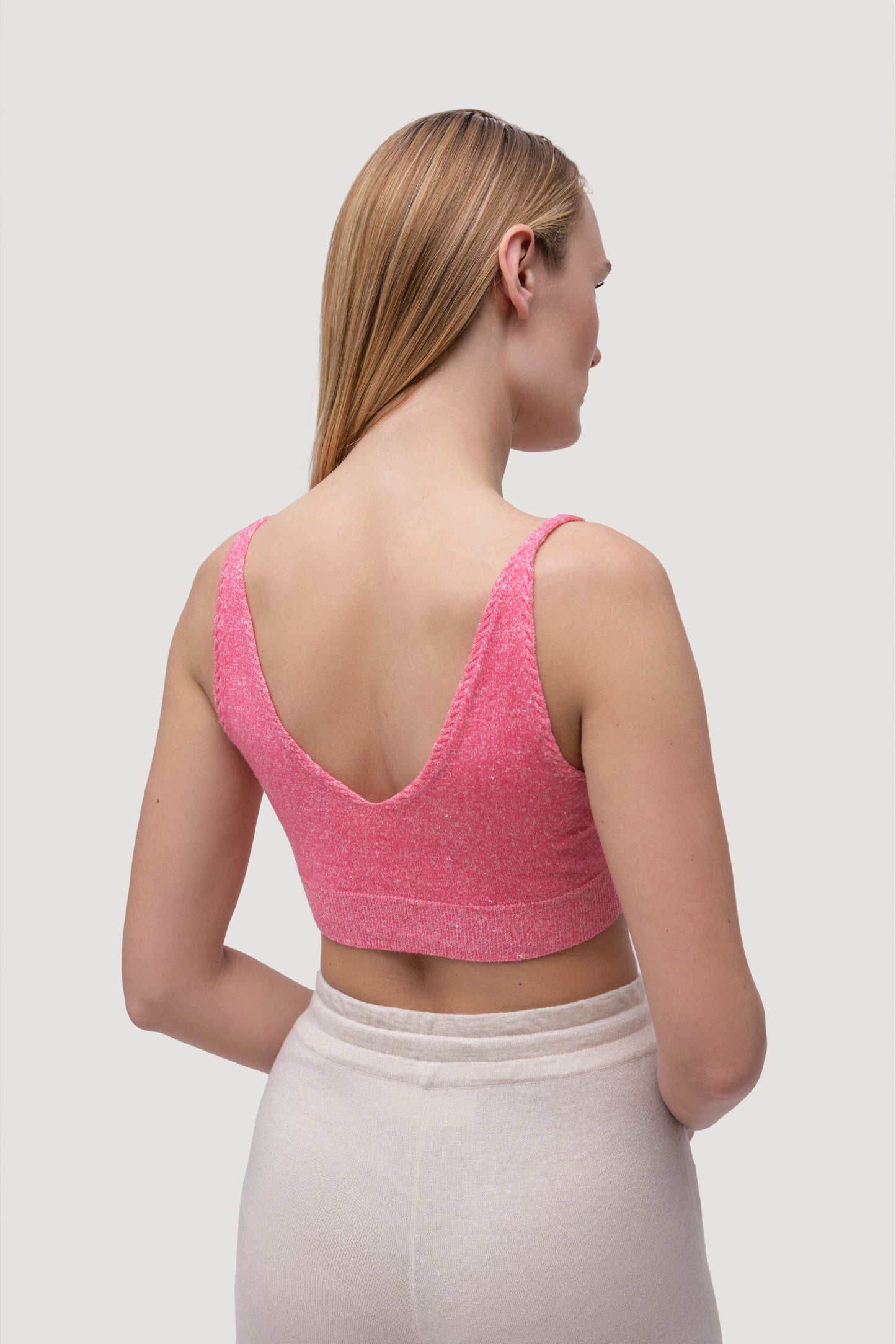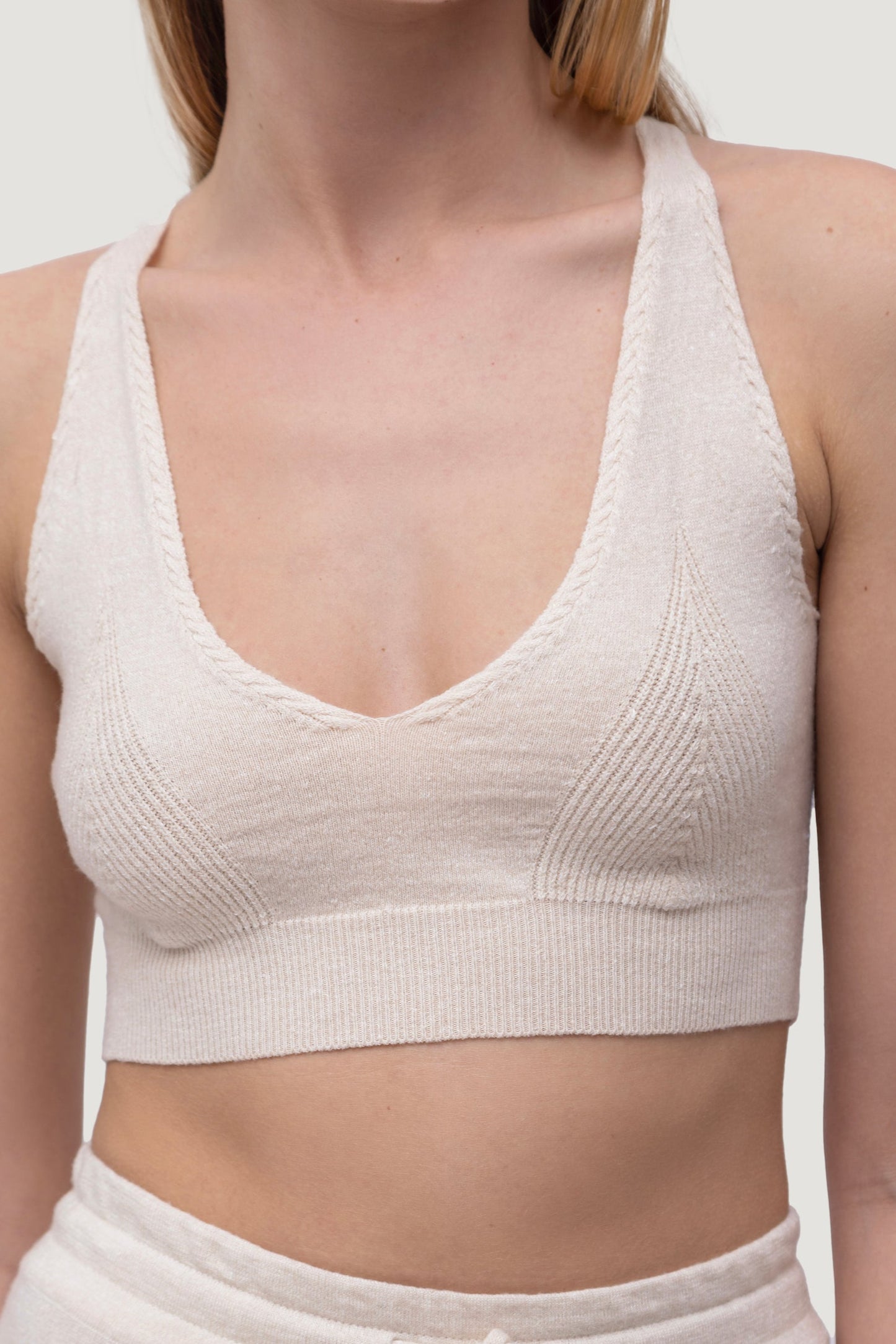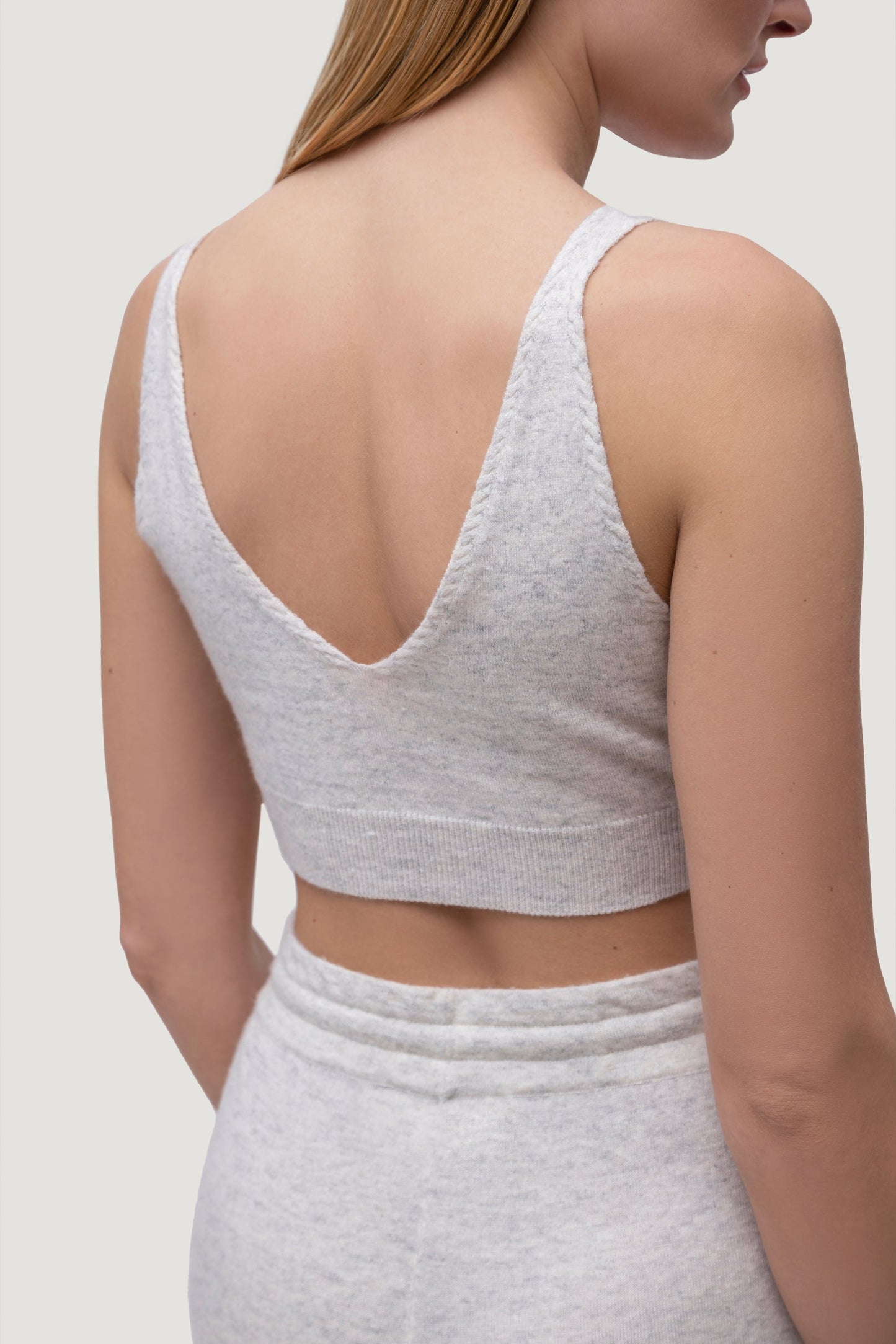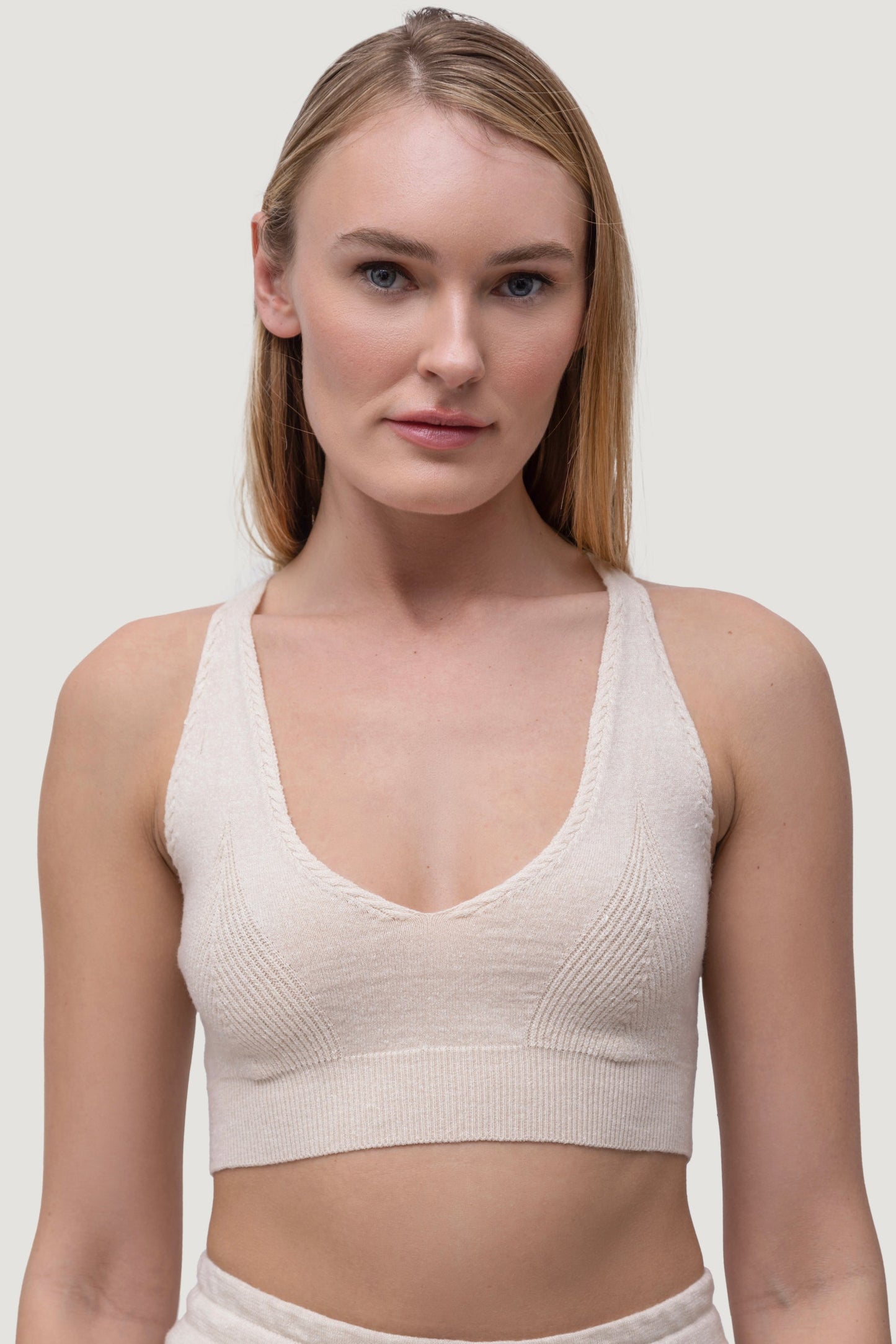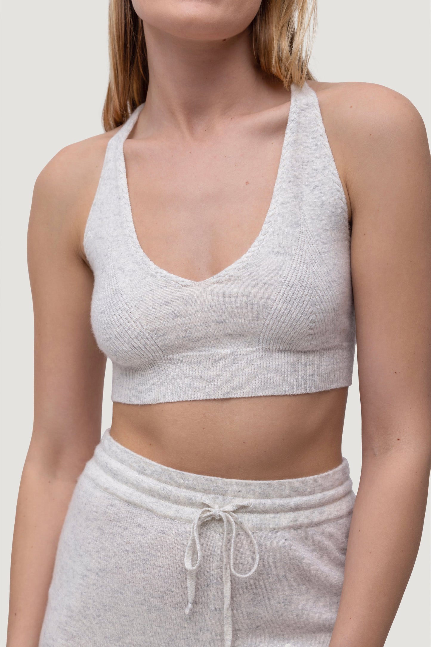 The cashmere and linen blend bralette top is a soft texture that feels incredible against your skin. The lightweight design allows for optimal breathability, keeping you cool and comfortable all day long. Get a cause and comfy look by pairing with our Wide Leg Cashmere & Linen blend pant.