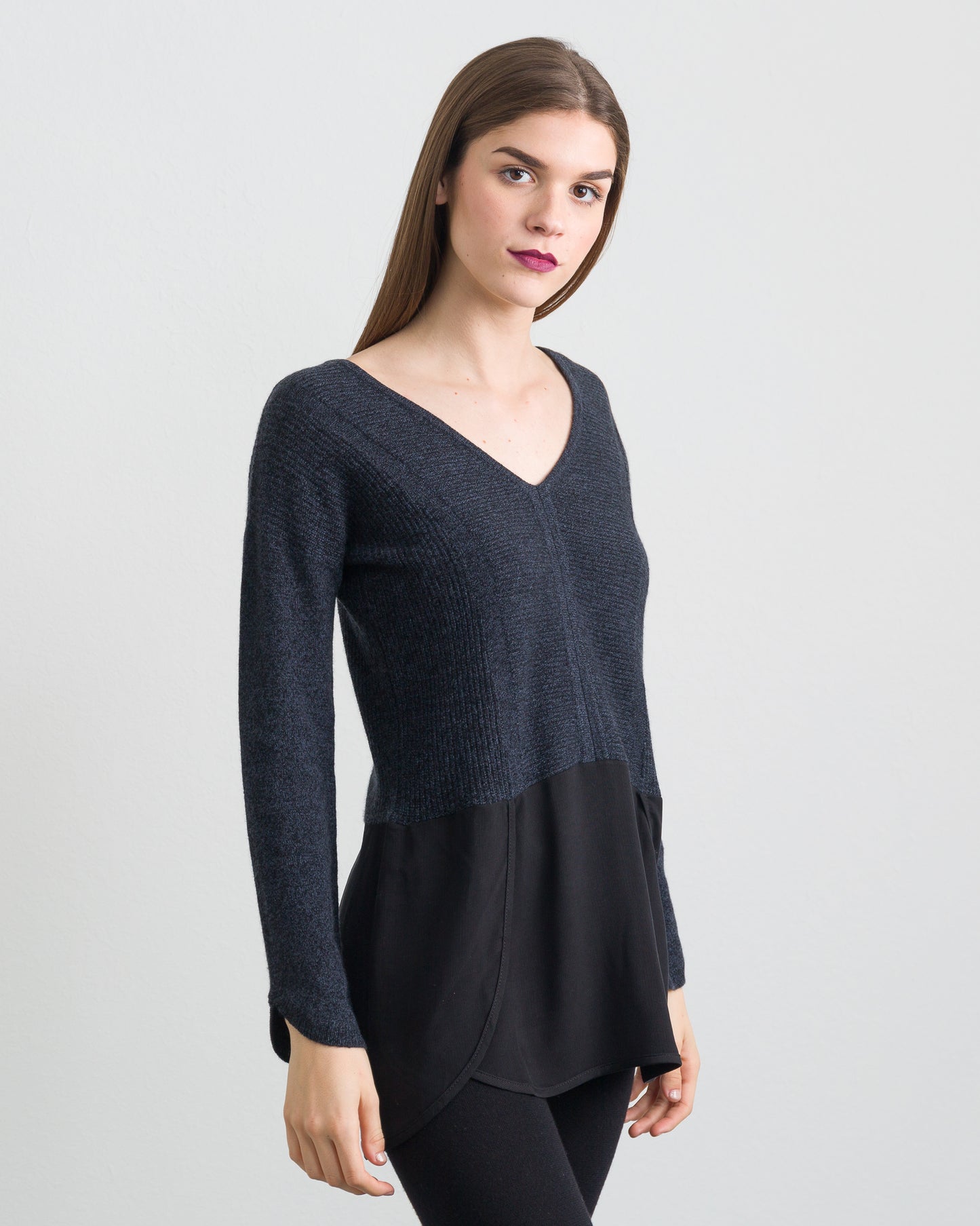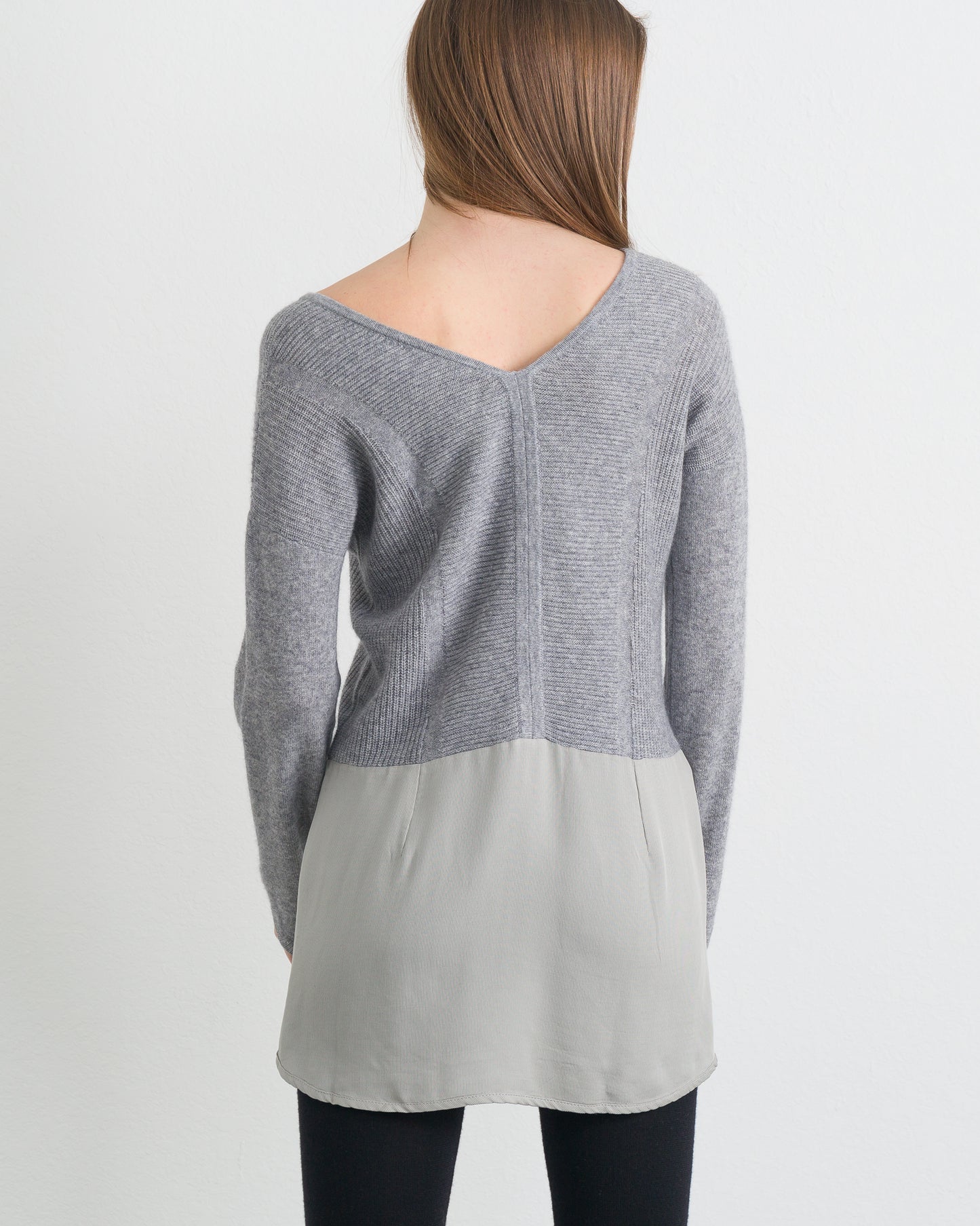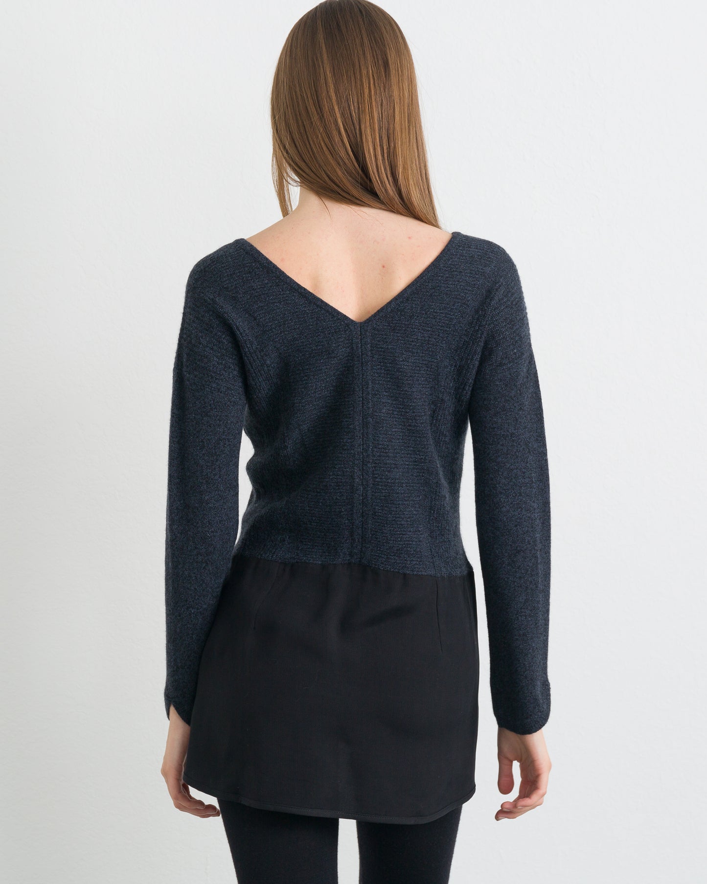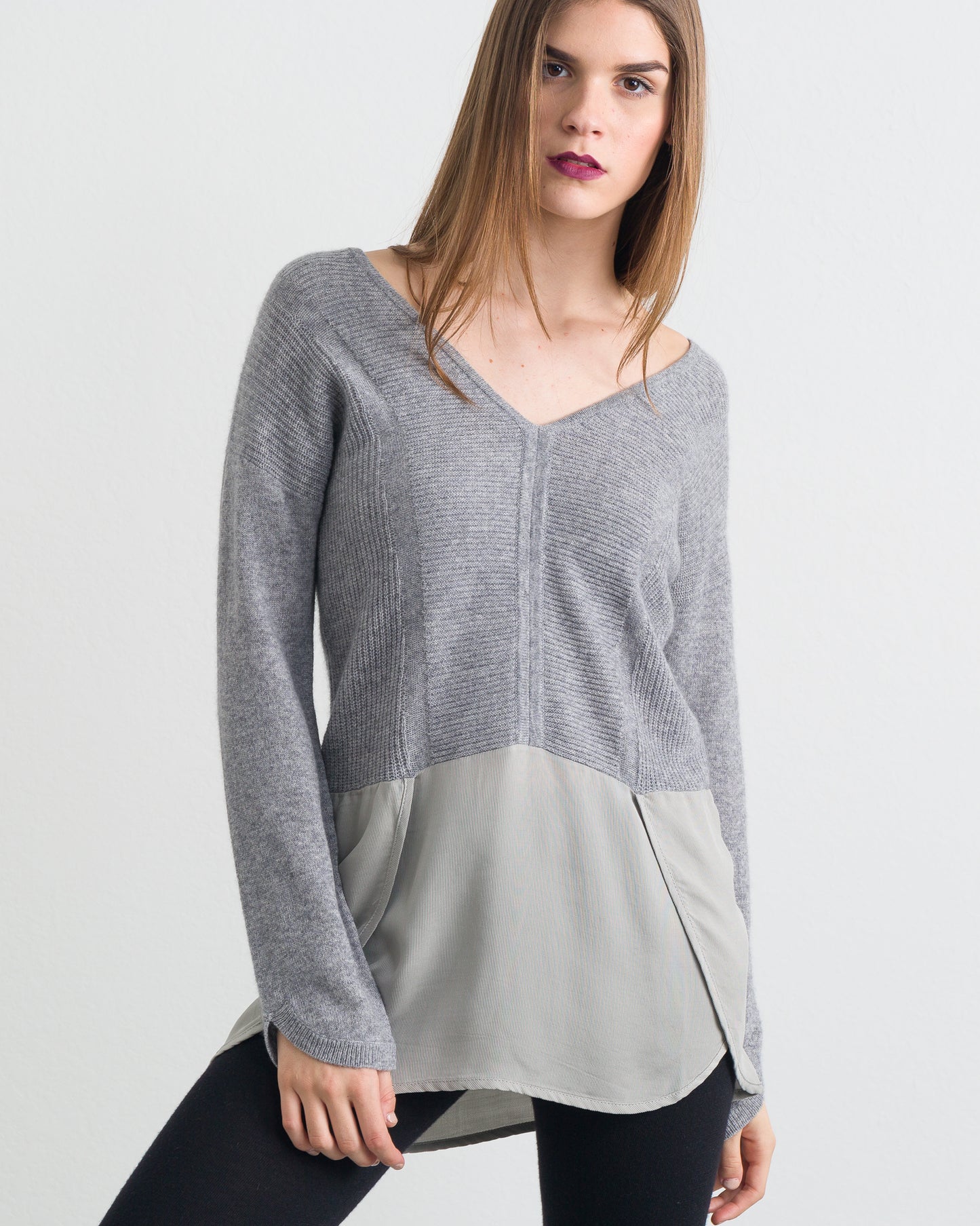 A versatile sweater you can dress up or down. Relaxed fit with cupro woven shirt hem bottom.
