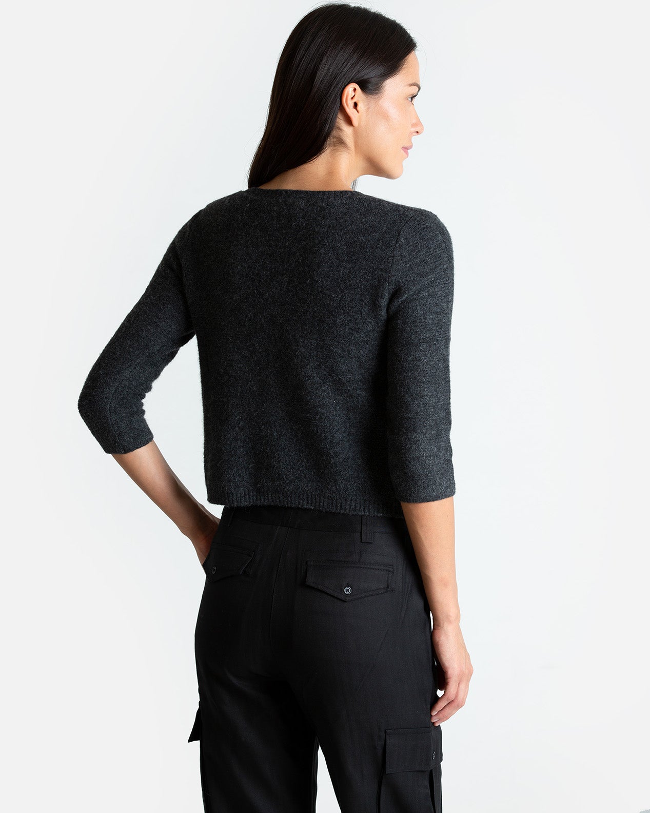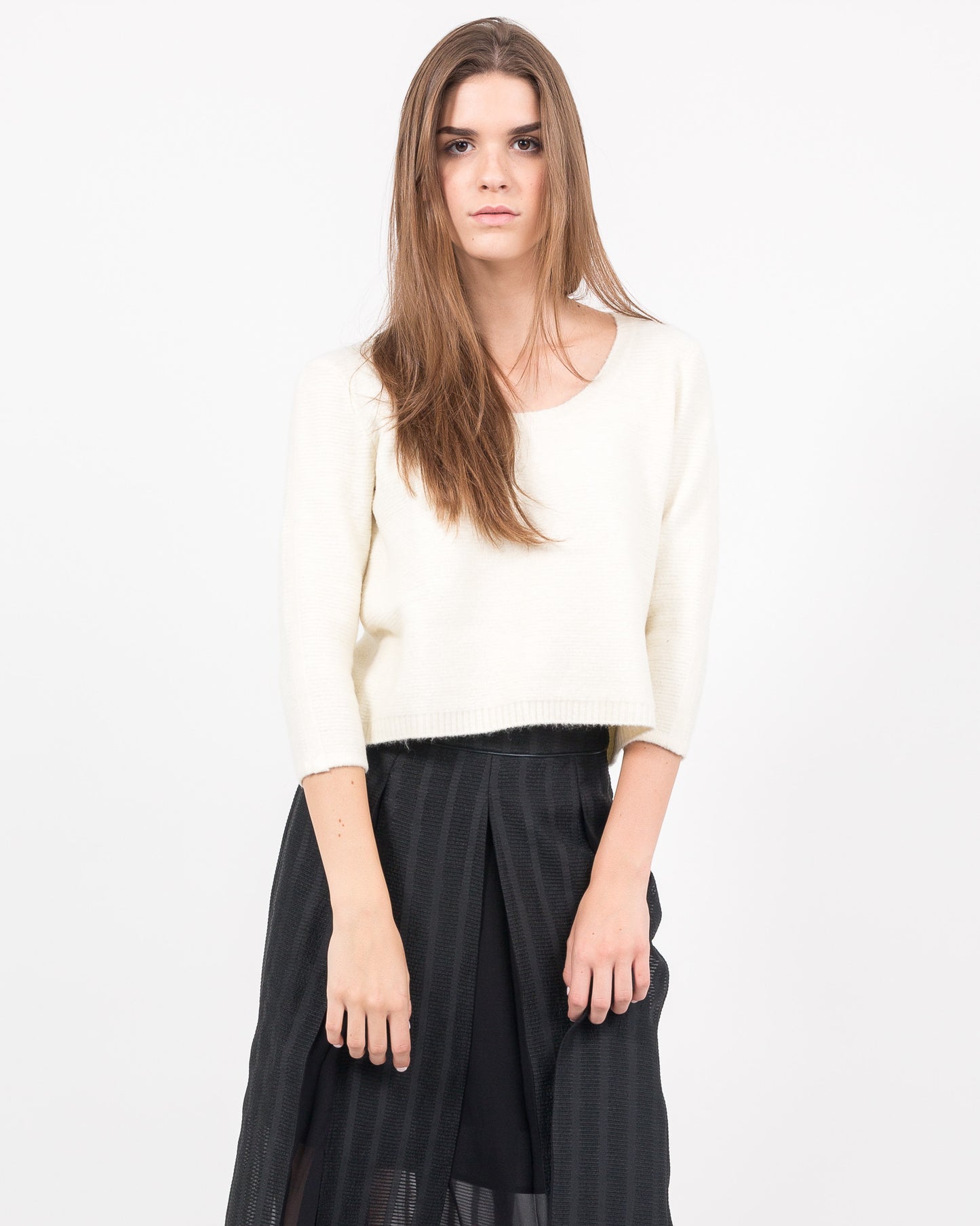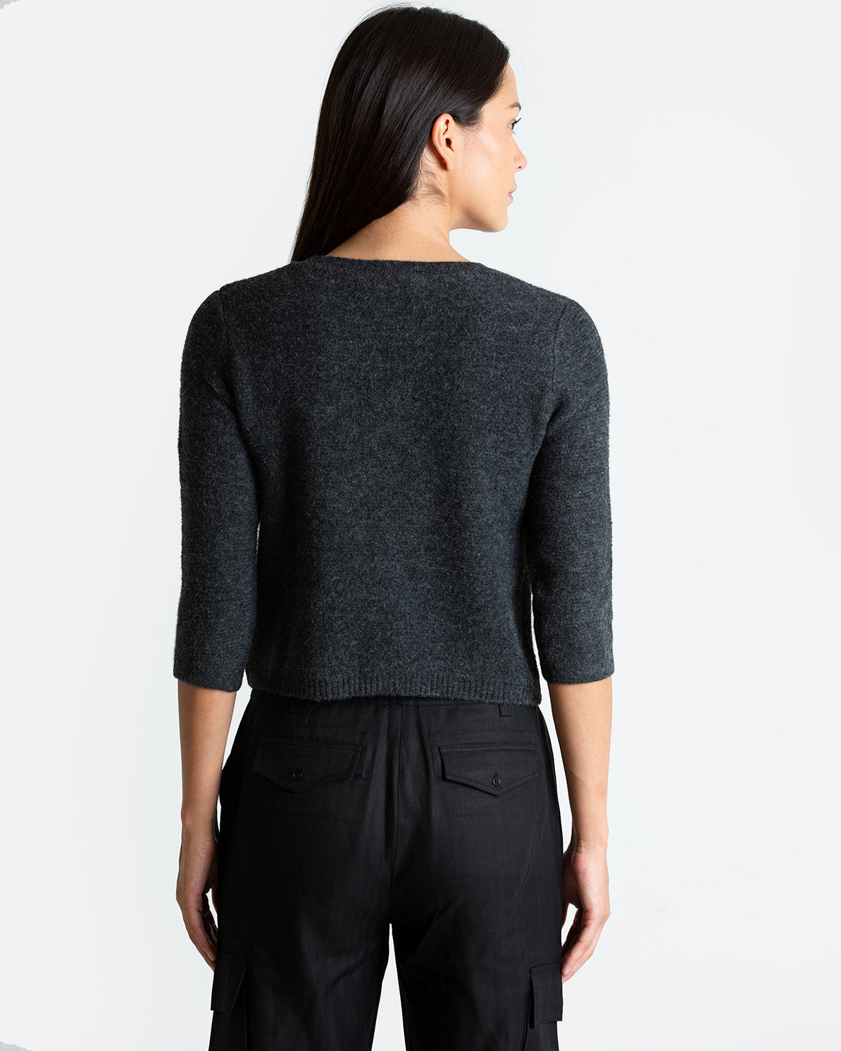 Three-quarter sleeves perfectly balance the cropped silhouette of a horizontal ribbed pullover. Knit from a soft felted yarn blend.