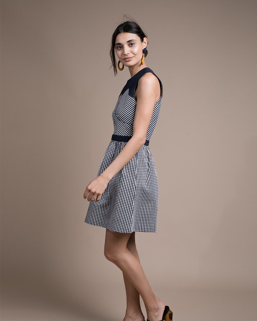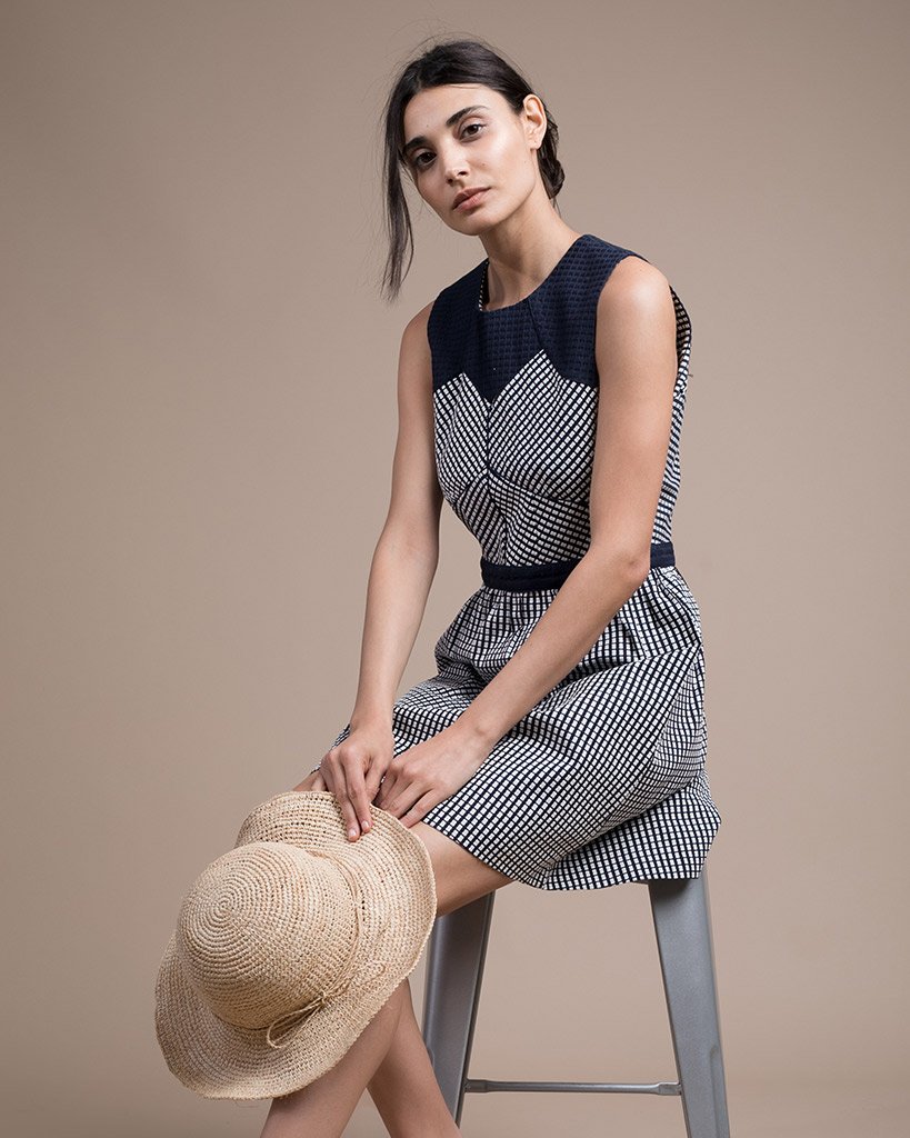Finely woven navy and white jacquard sleeveless dress with a contrasting modern yoke and waistband. Exposed zipper back detail.