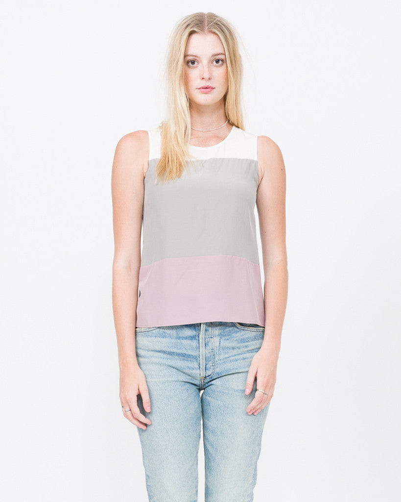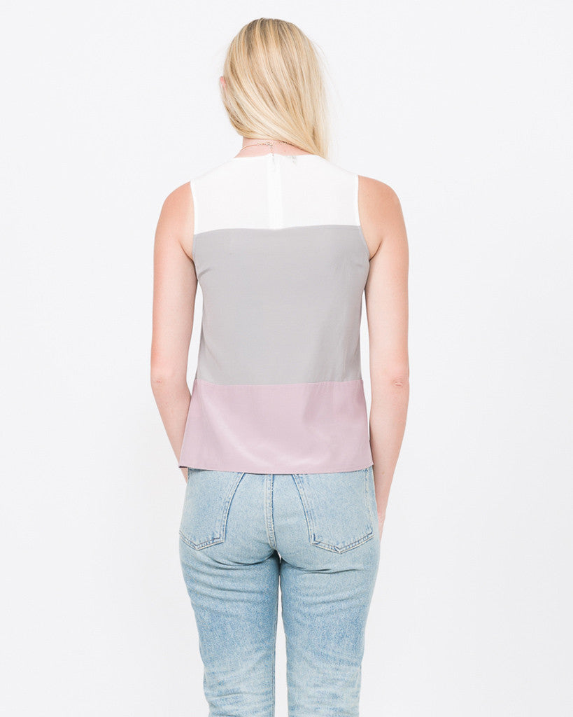 Loose silk blend tank with color blocked panels of pink, grey and white--