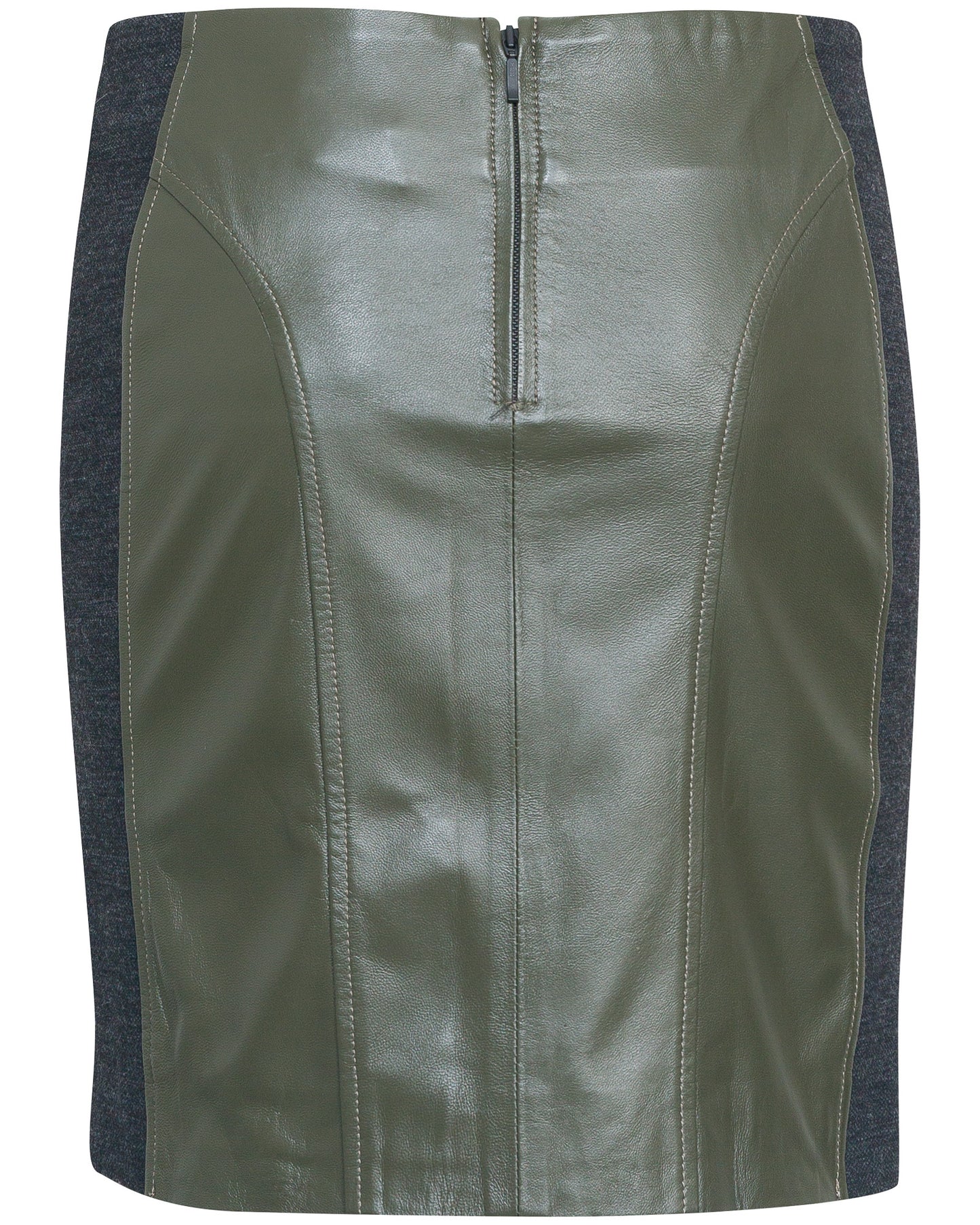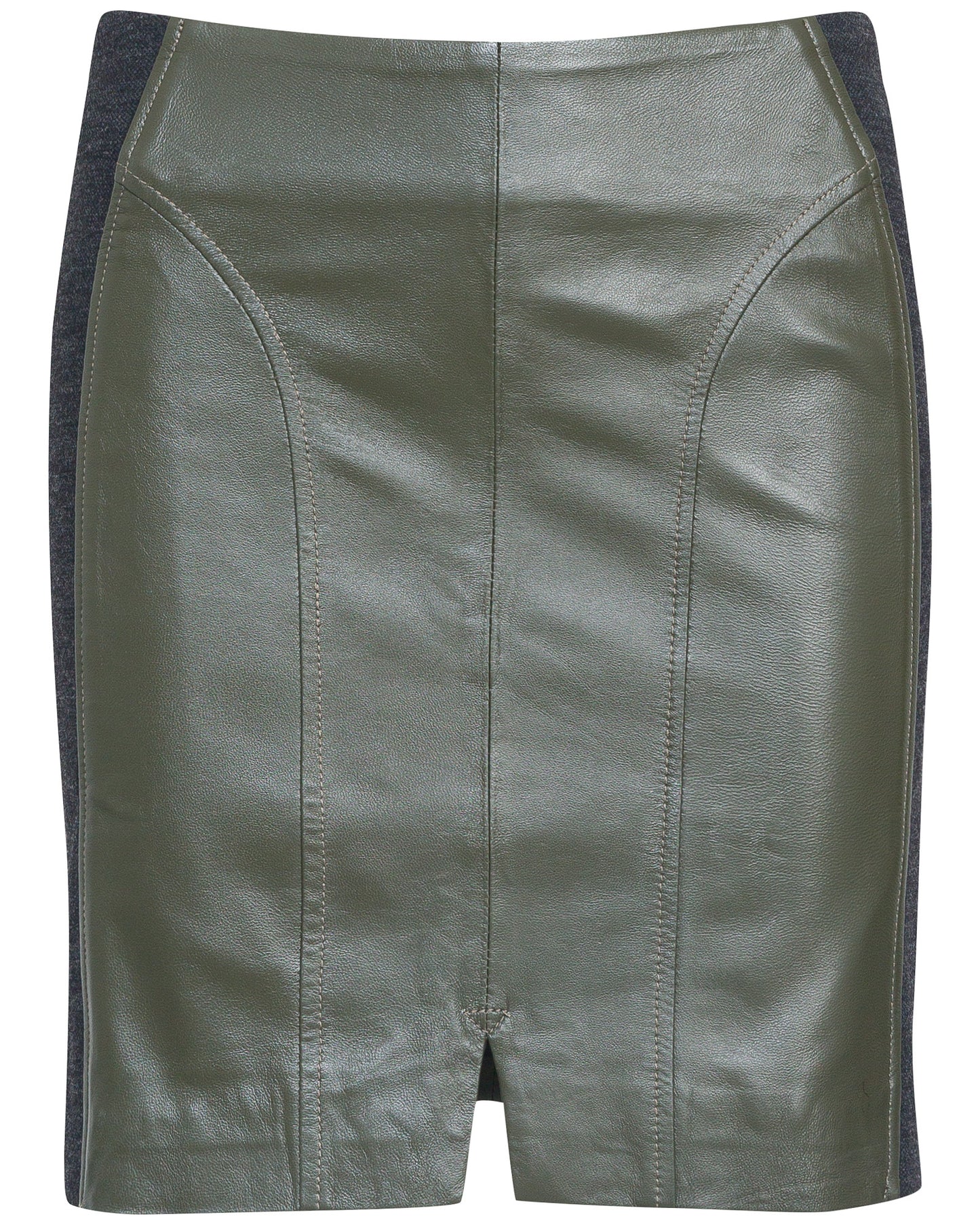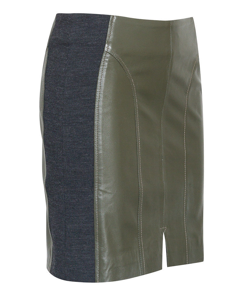 Sleek leather and jersey paneling make this skirt flattering (and chic) for every occasion. Slightly above the knee.