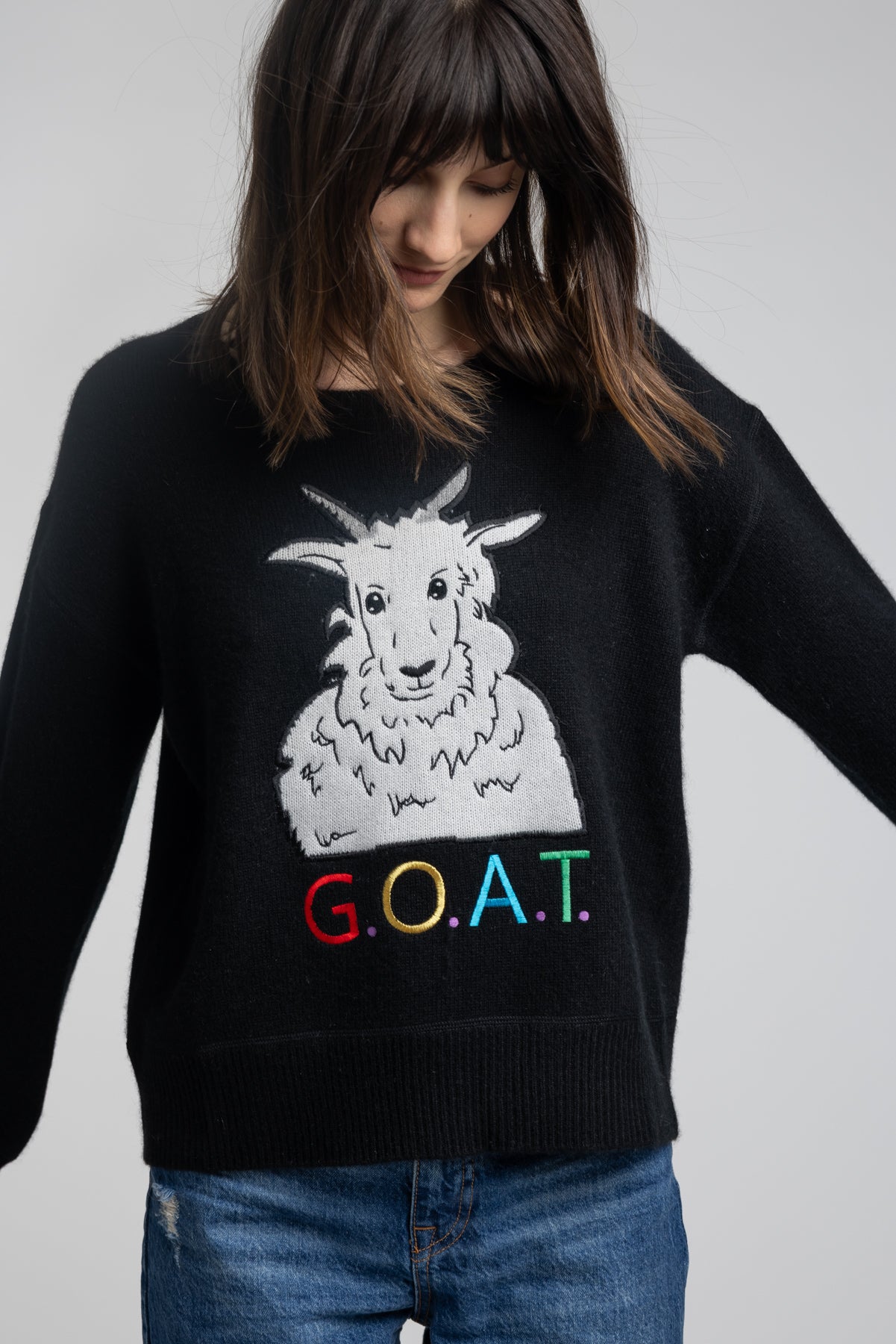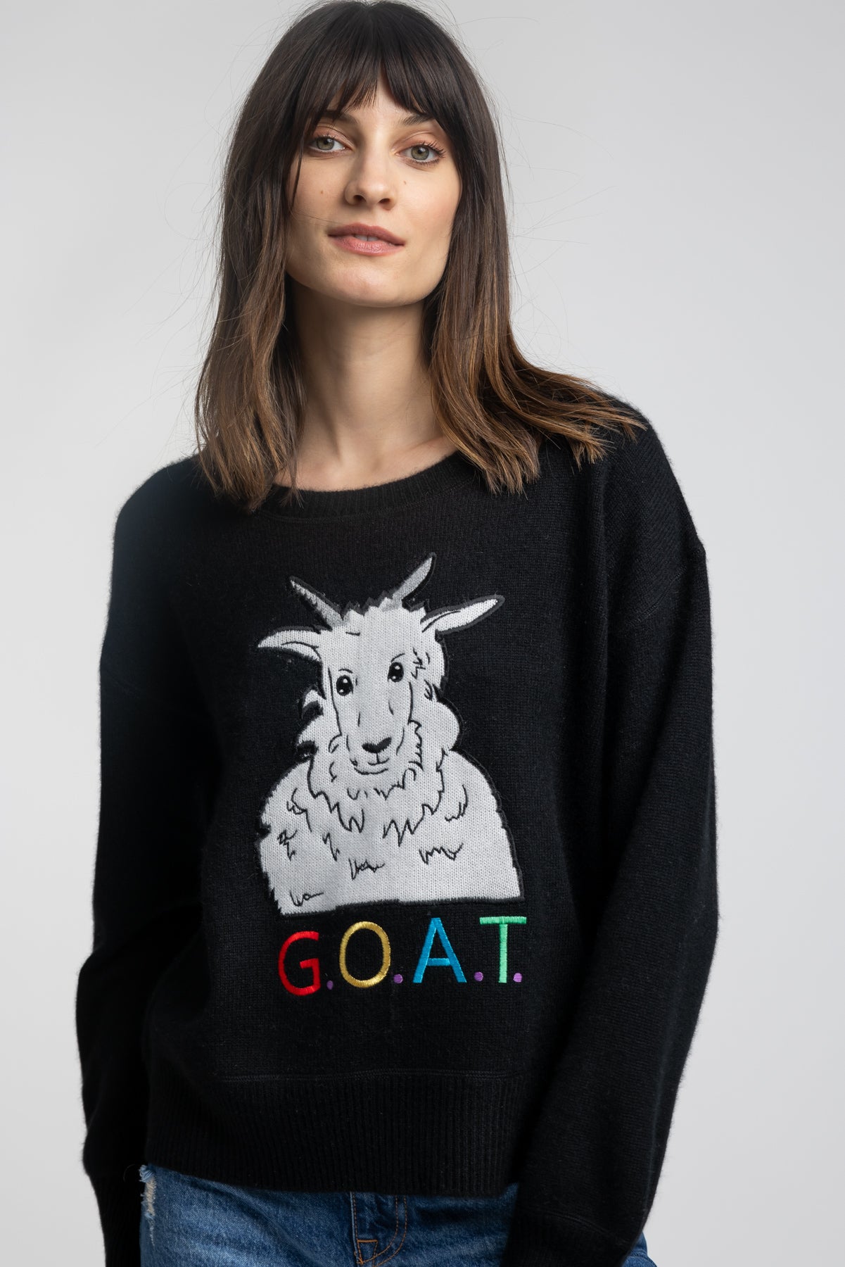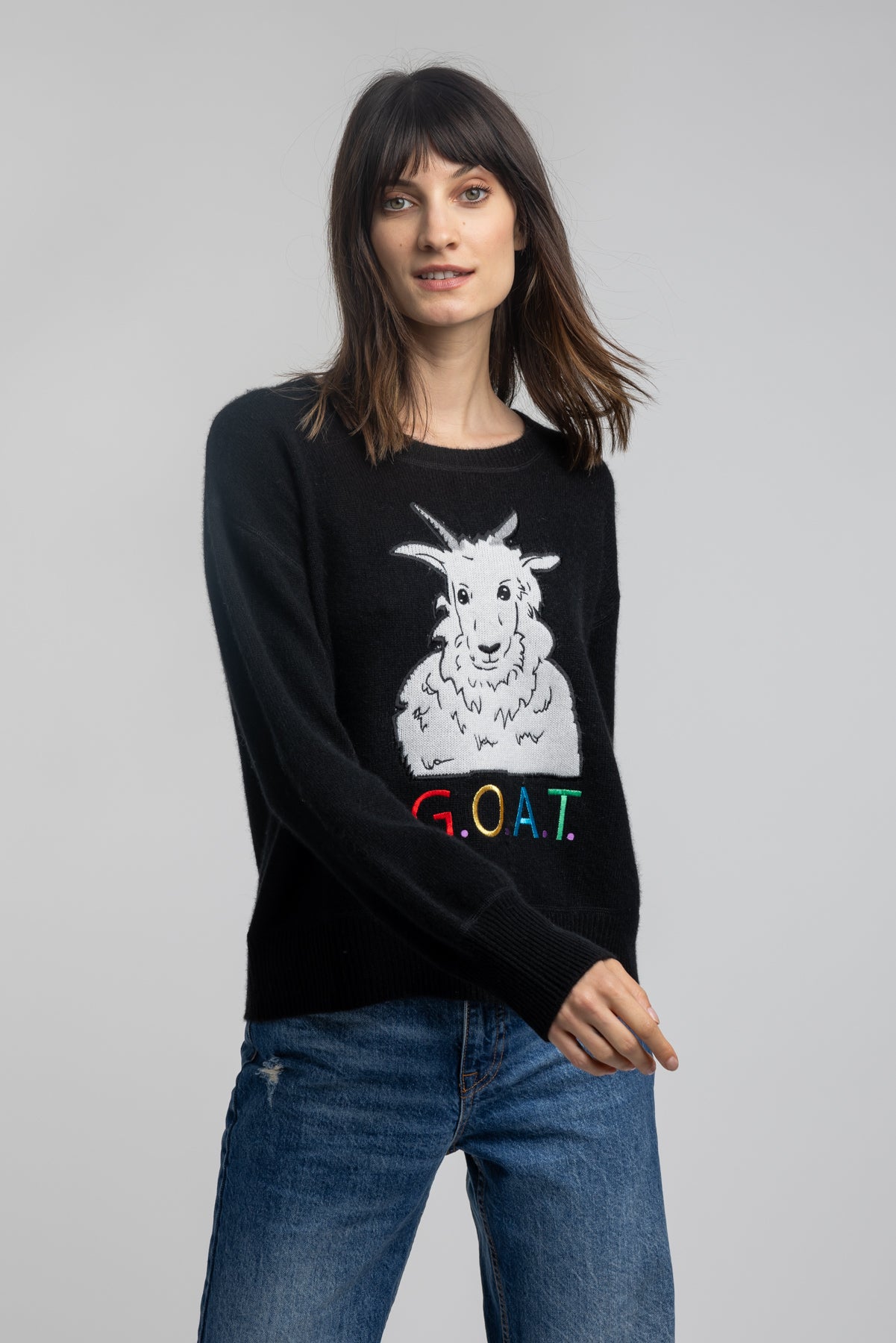 Greatest Of All Time! Quinn's icon Goat in luxe cashmere, this sweater is the pinnacle of softness. Intricate intarsia stitching showcases a mix of colors, lifting your look and bringing a splash of cheer to your ensemble. We celebrate the goats who supply our beautiful raw material and produces our quality sweaters.