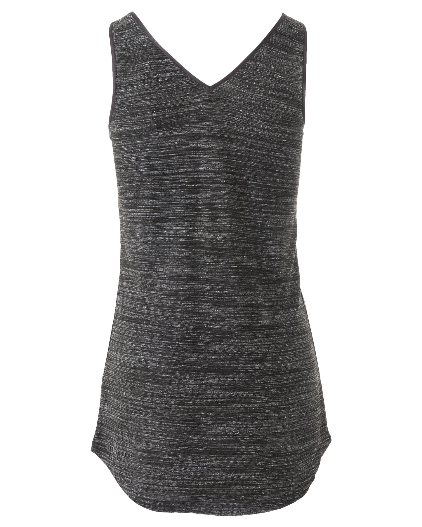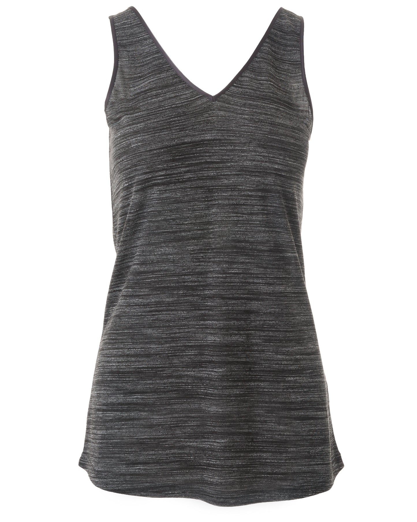 A versatile v neck tank with just enough coverage. All bindings sewn in satin trim, for upgraded design. Longer body measurements and shaped bottom hem.