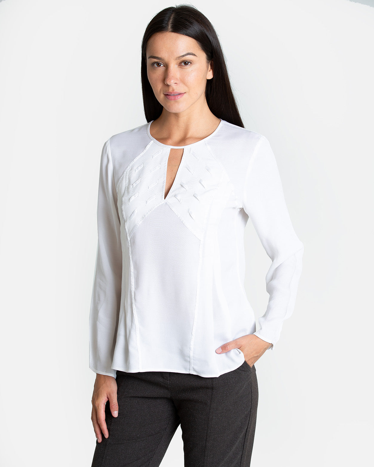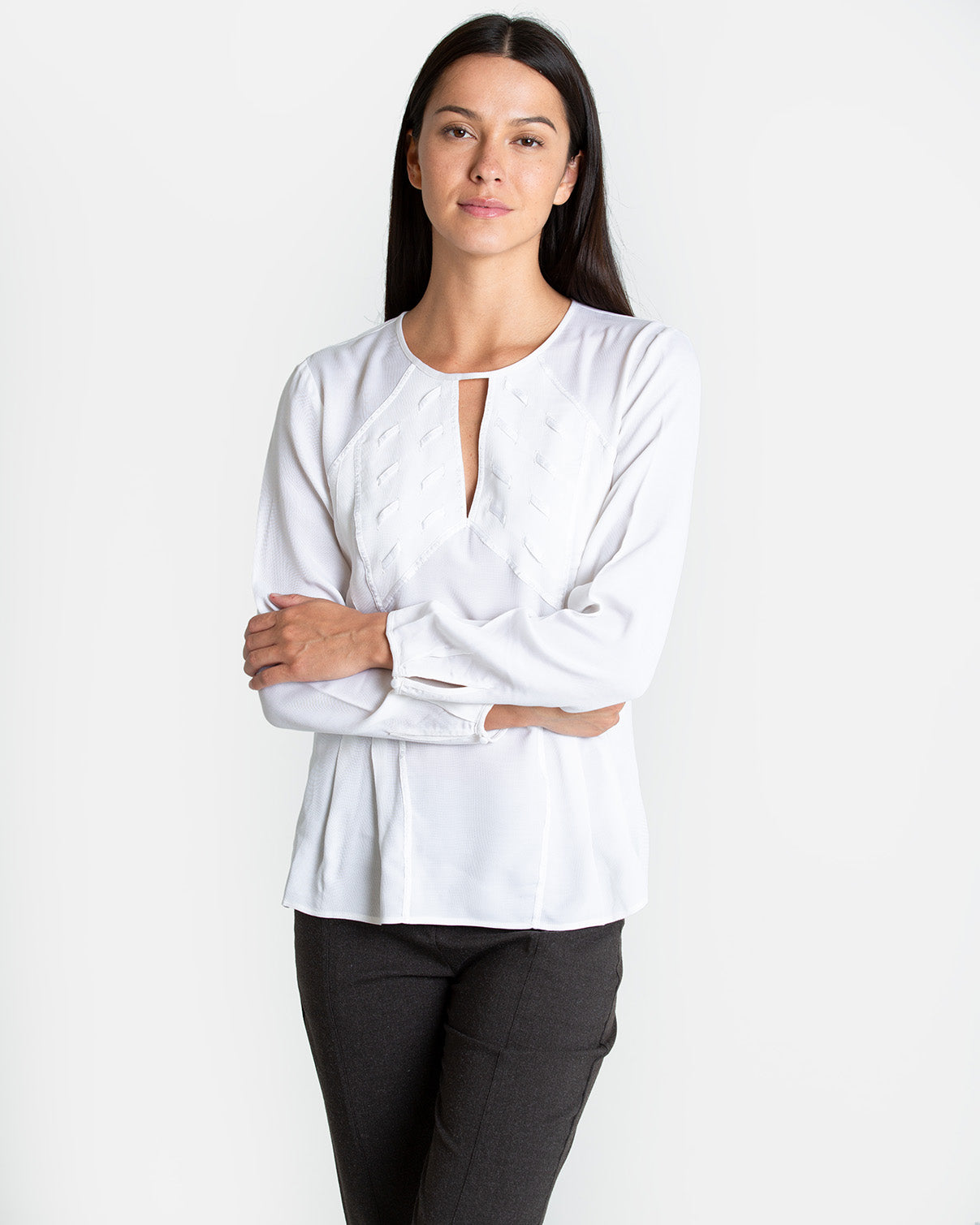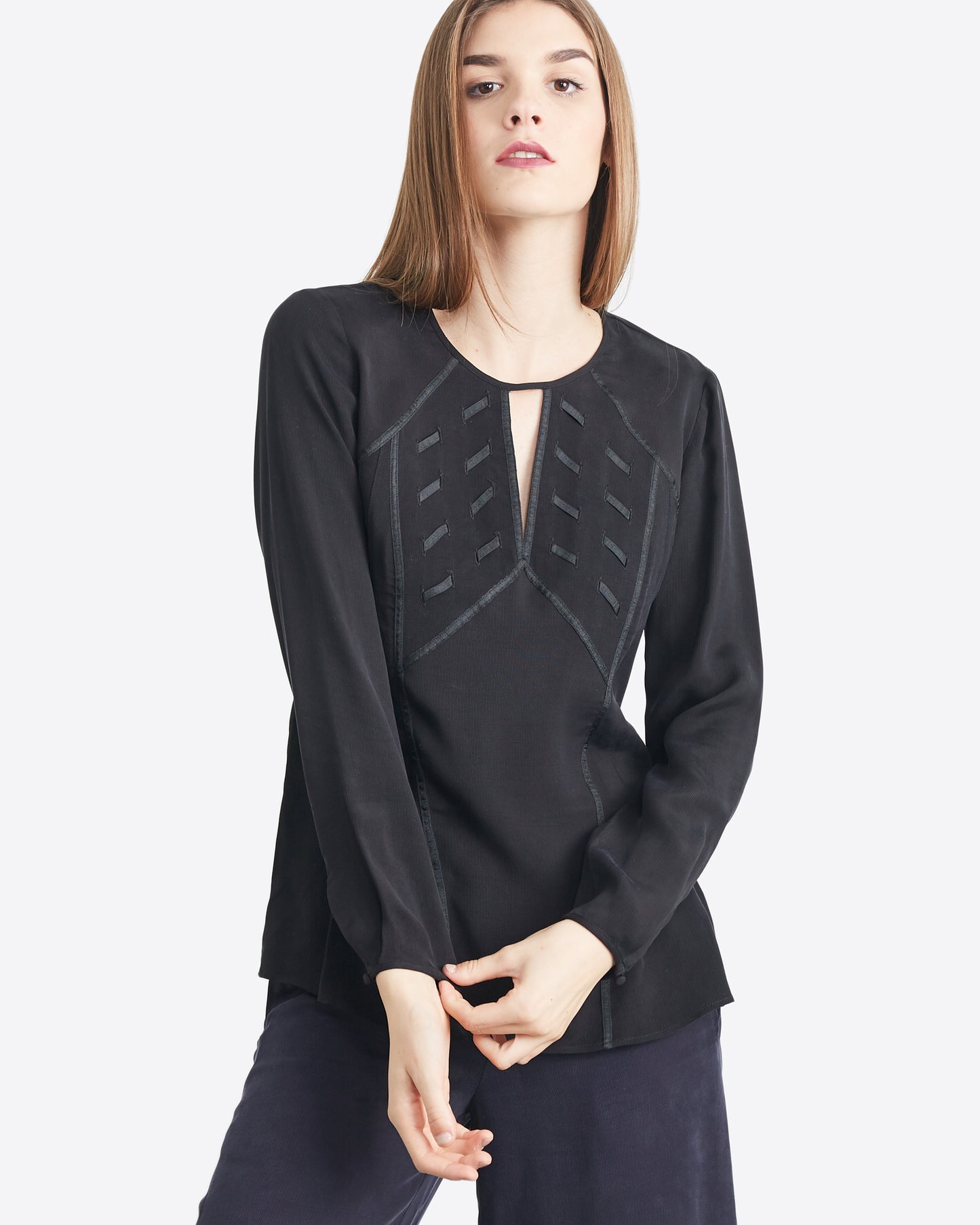 This keyhole blouse will take you from a day at the office to a night out on the town...just add heels. Easy fit- Designer ribbon detail make this unique.