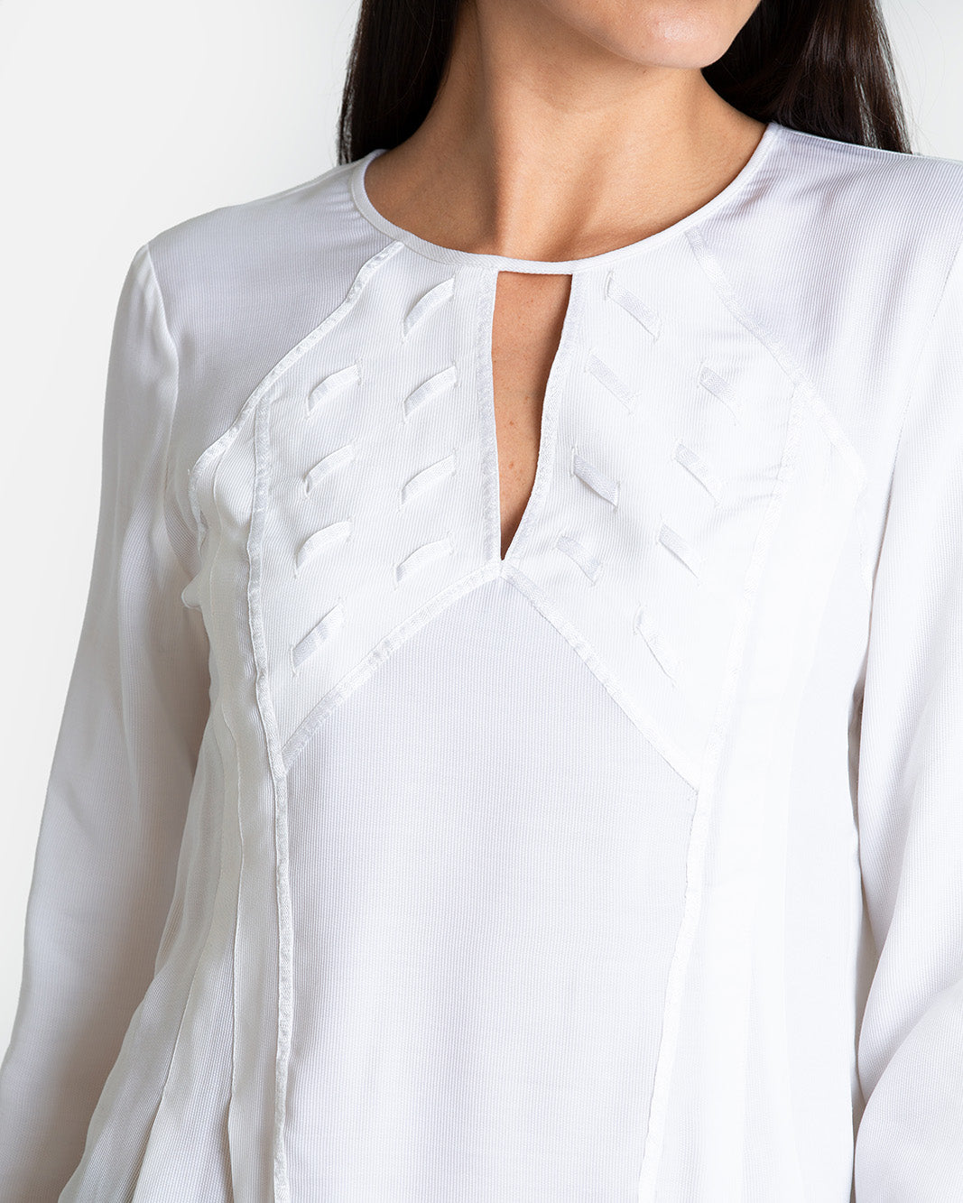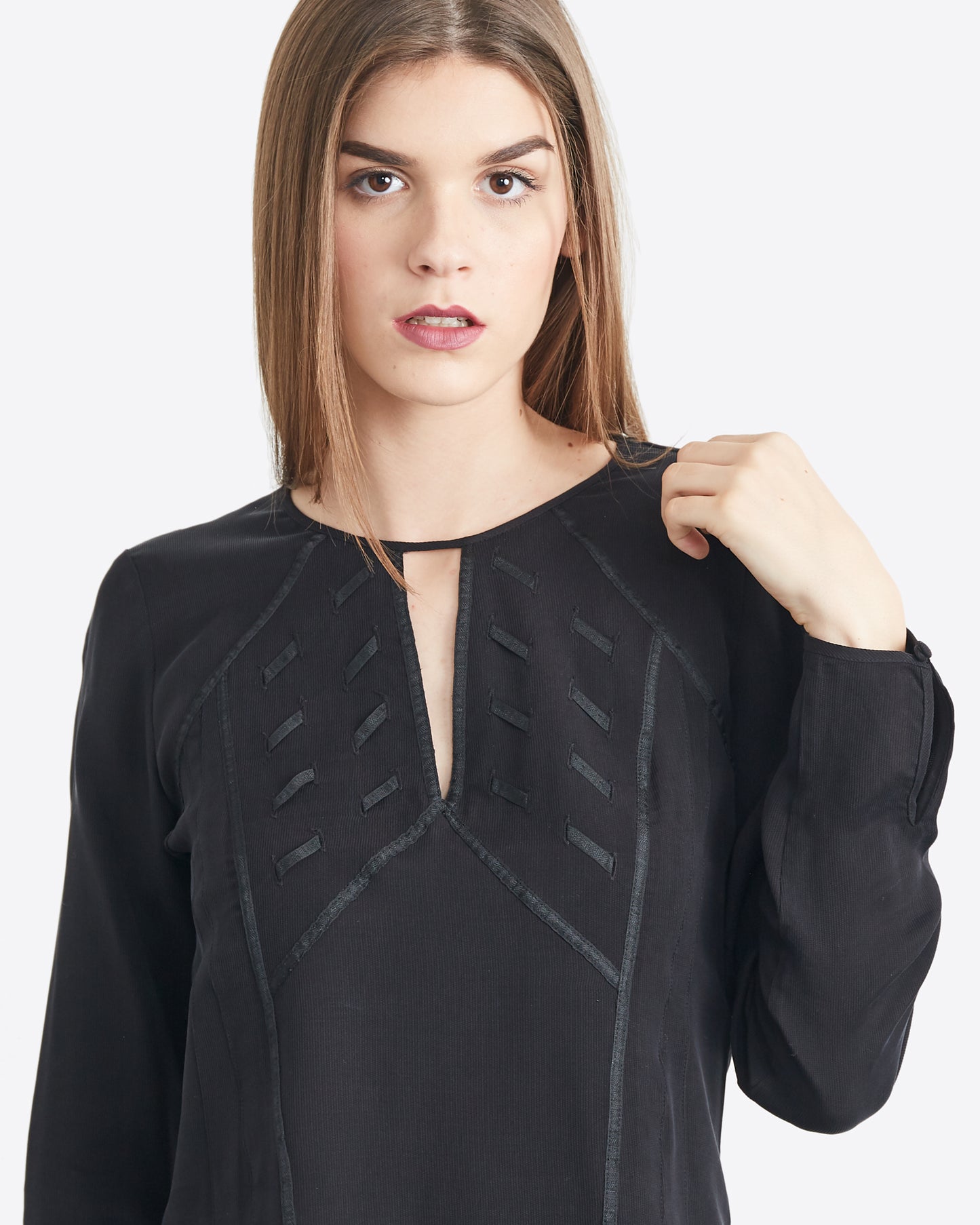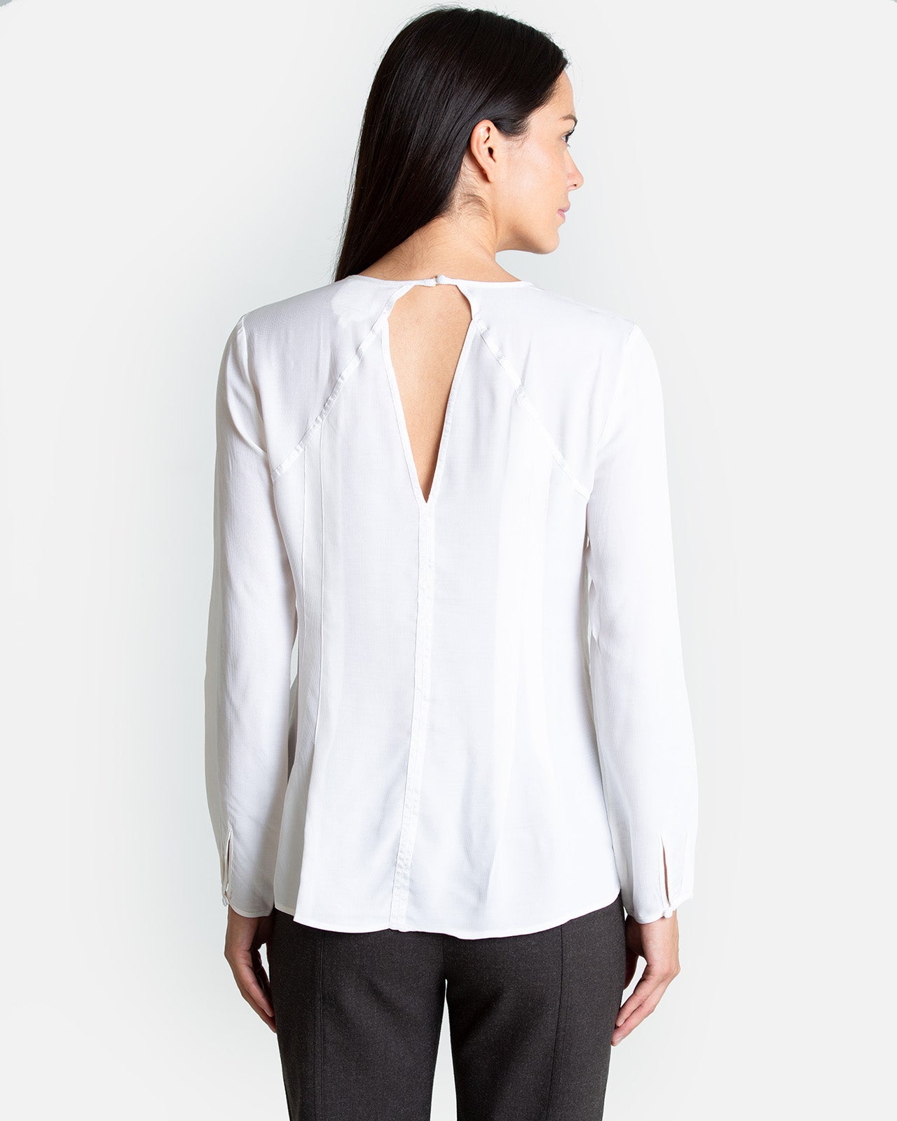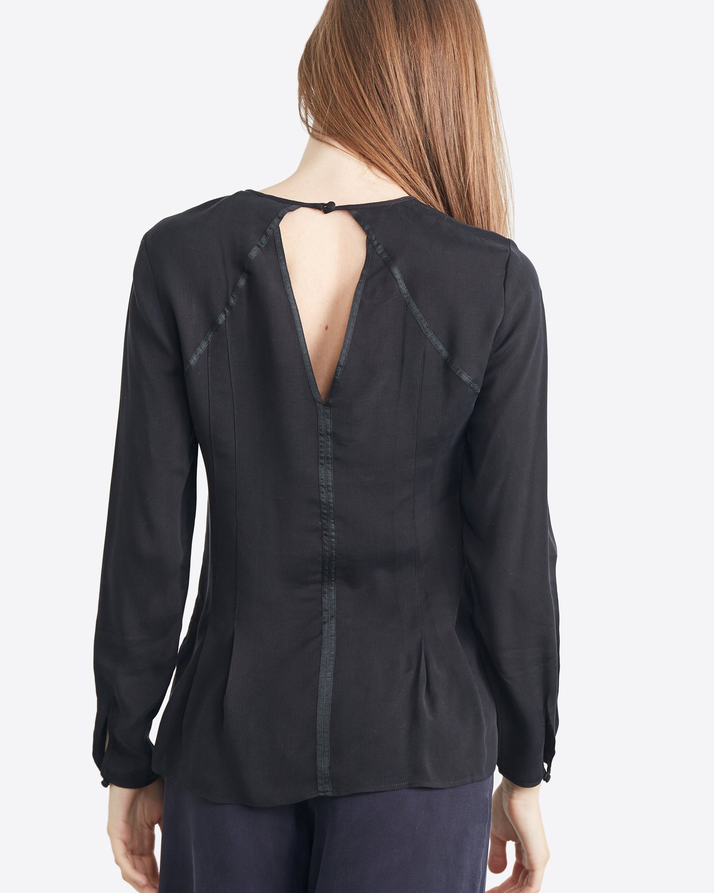 This keyhole blouse will take you from a day at the office to a night out on the town...just add heels. Easy fit- Designer ribbon detail make this unique.