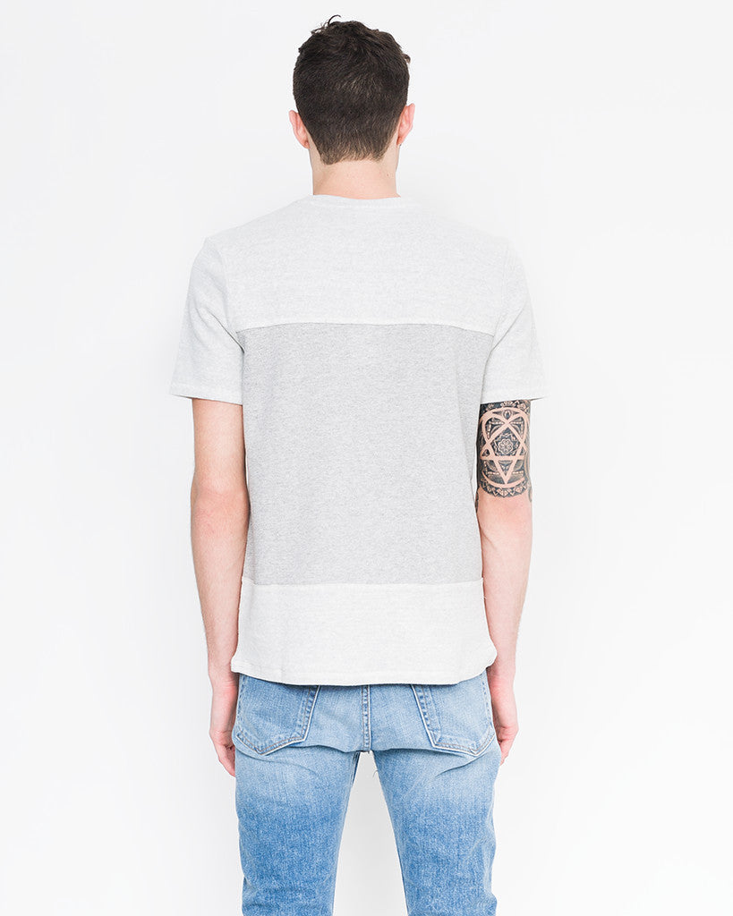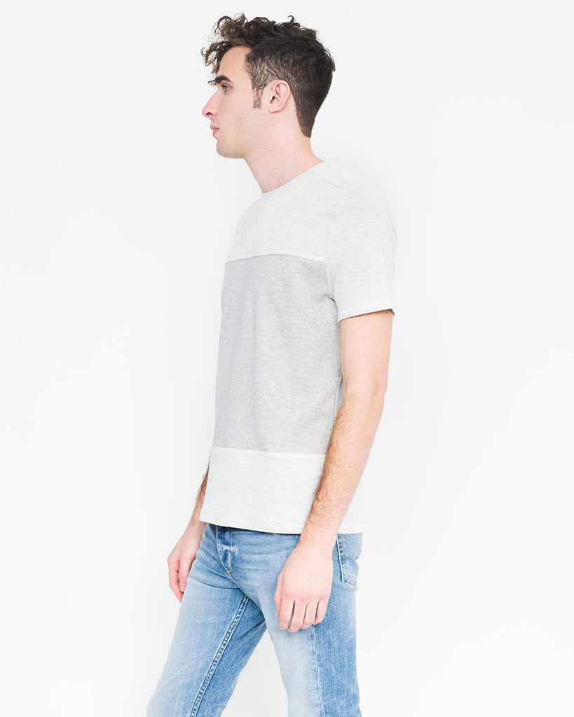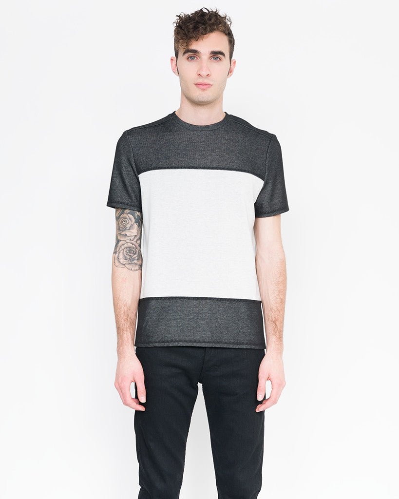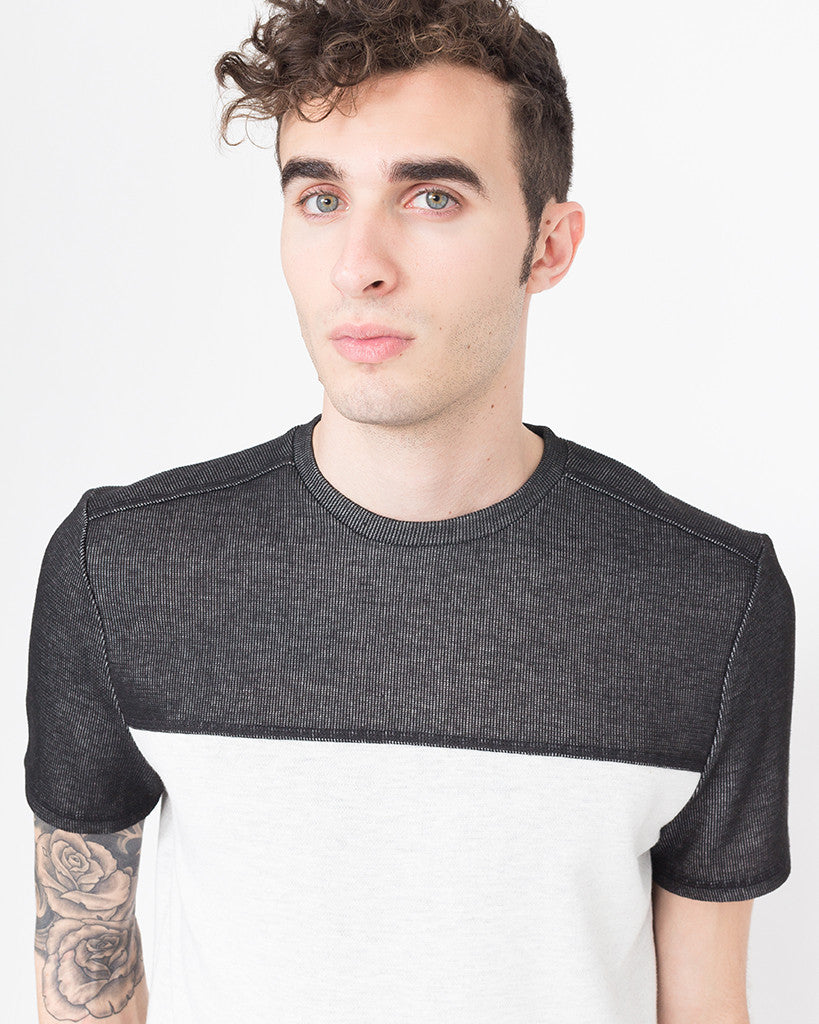 A classic crew neck t-shirt with mixed fabrics including double faced jersey.