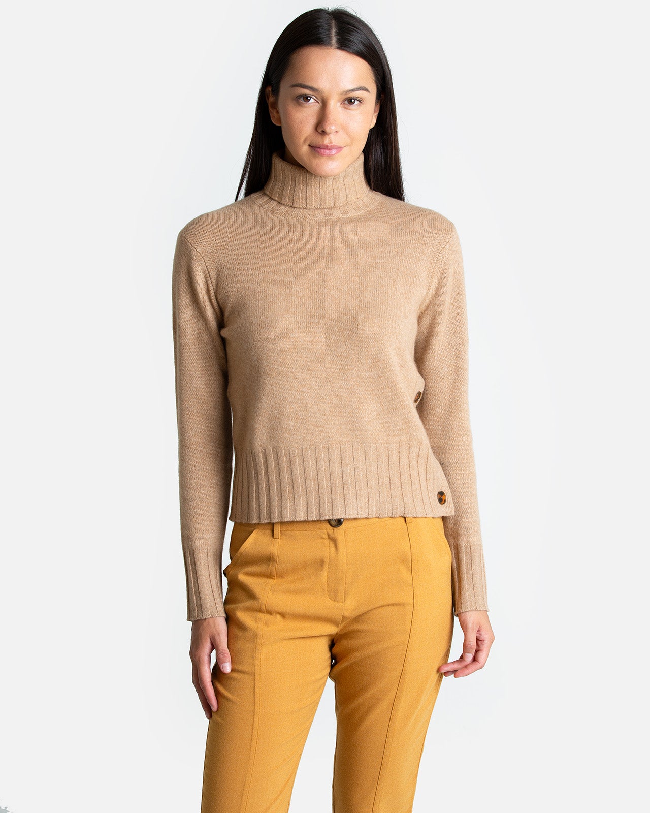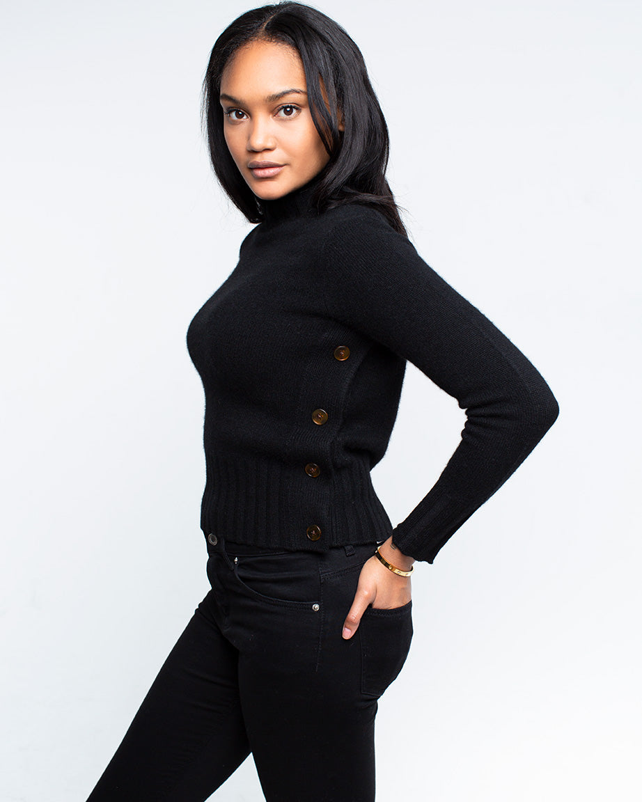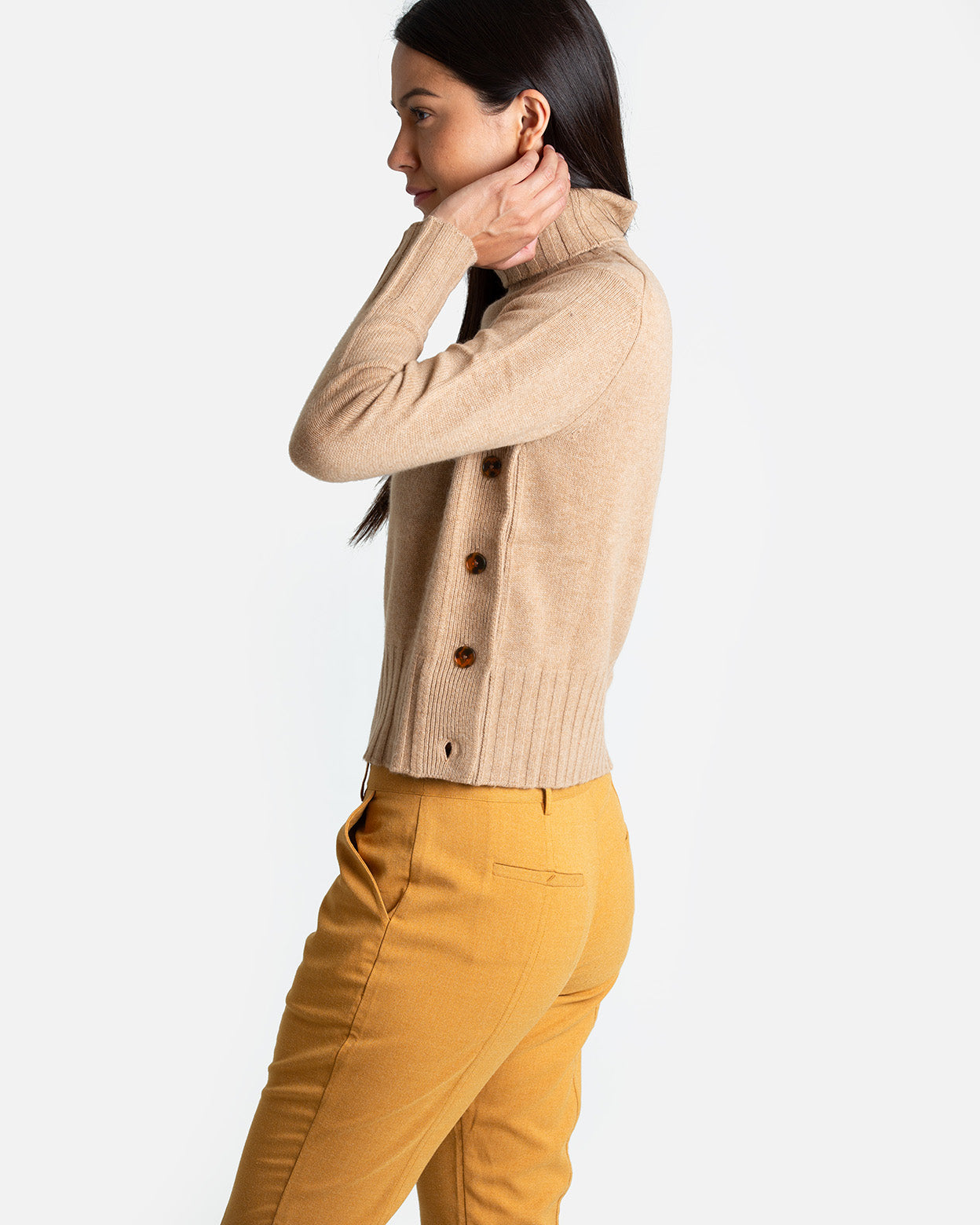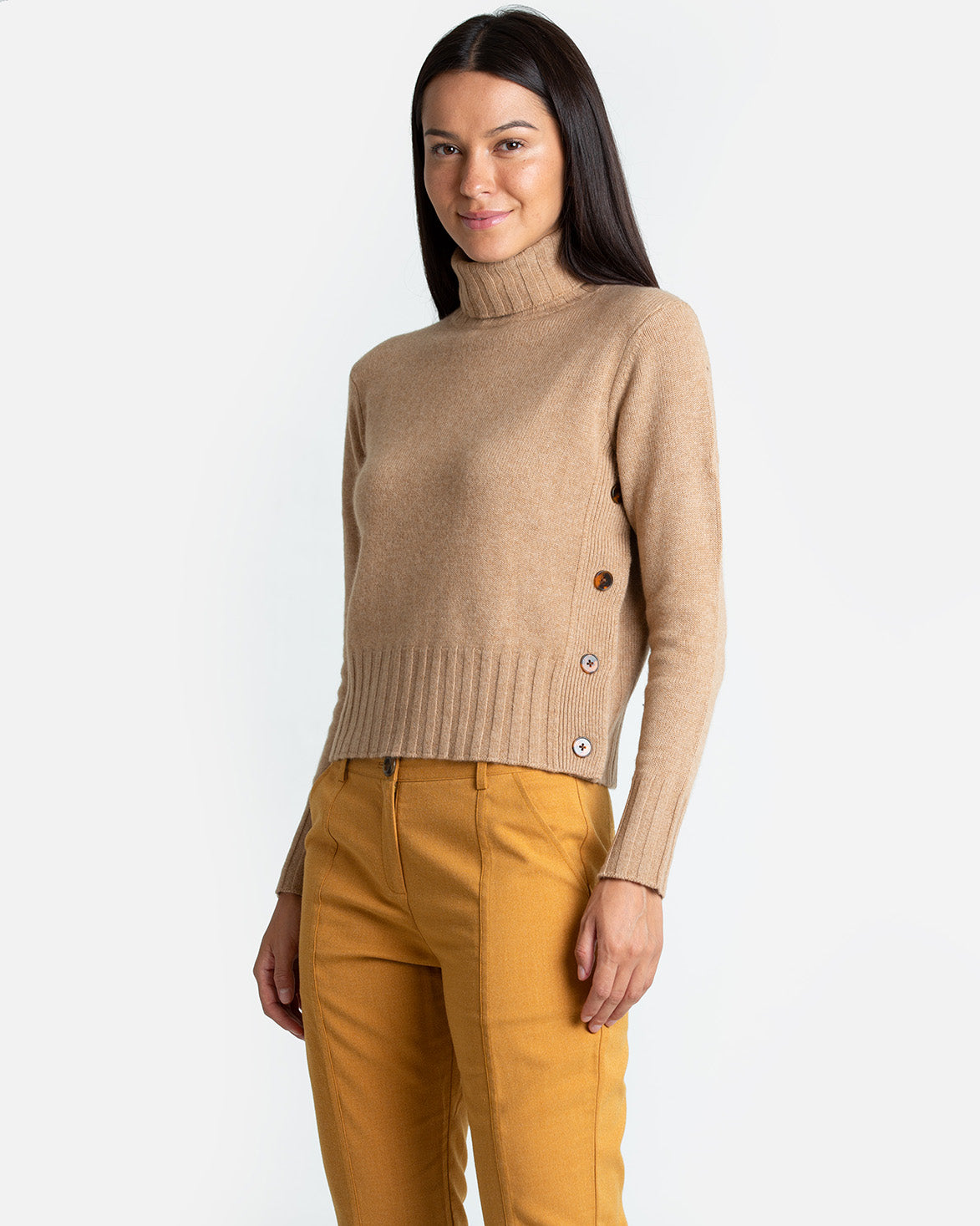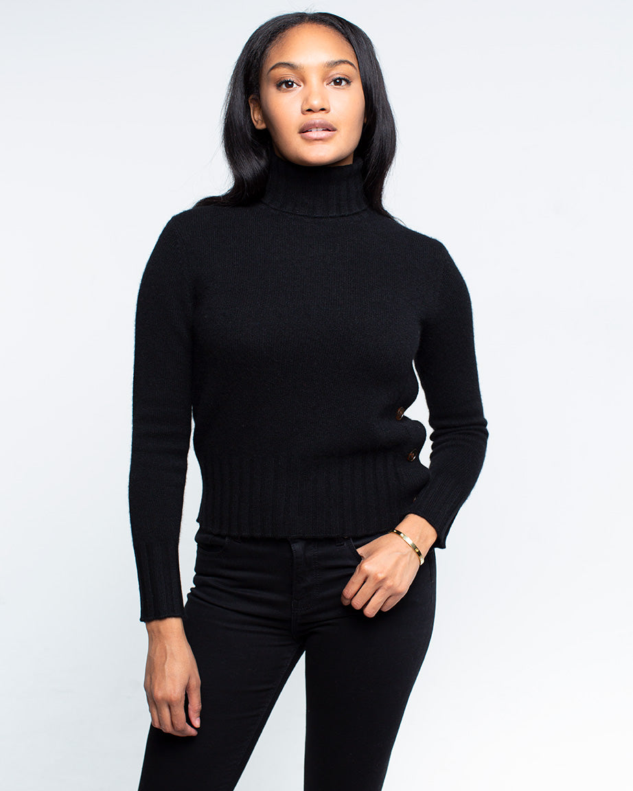 The new spin on a Classic! Functional side buttons add style and ease to this basic Turtleneck sweater. Open a button or 2 to show off your layers. Pair it with your high waisted Jeans.