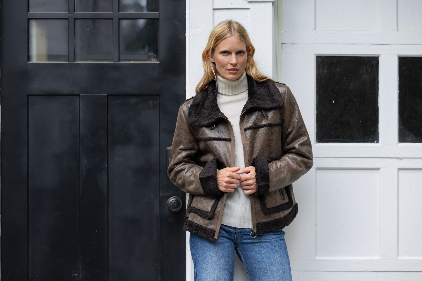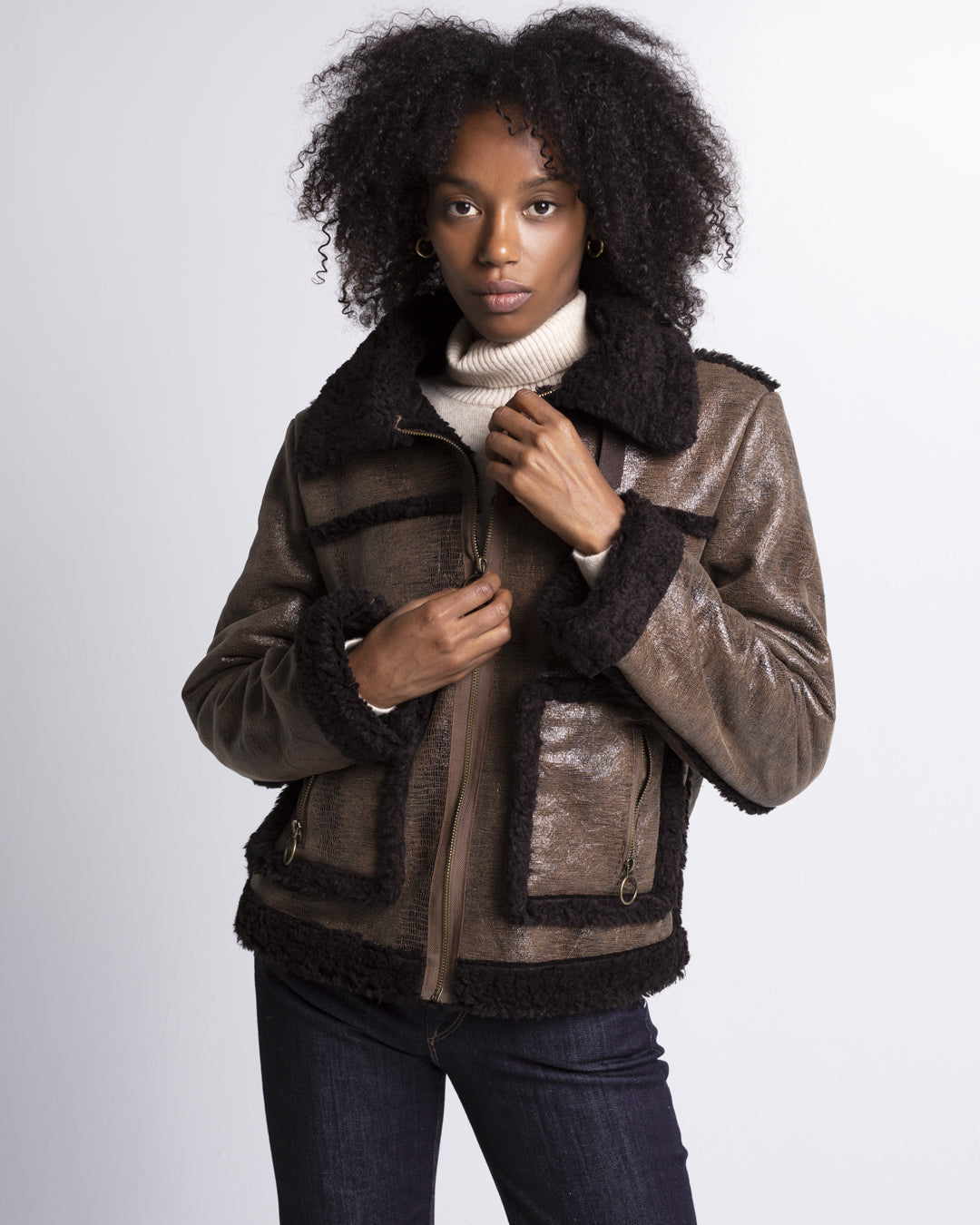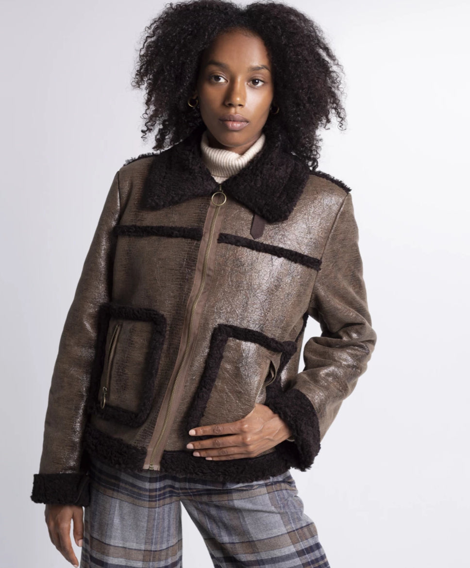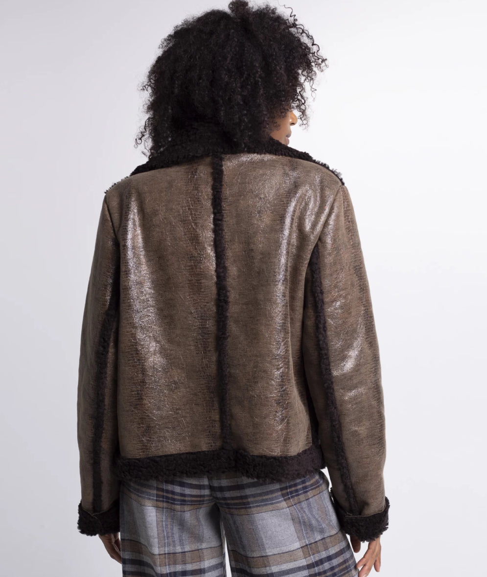 INNOVATIVE IMPORTED DOUBLE FACED FABRIC - ONE SIDE FAUX SHERPA THE OTHER EMBOSSED FAUX LEATHER. ZIP FRONT AND OVERSIZED POCKETS MAKE THIS YOUR FALL FAVORITE.