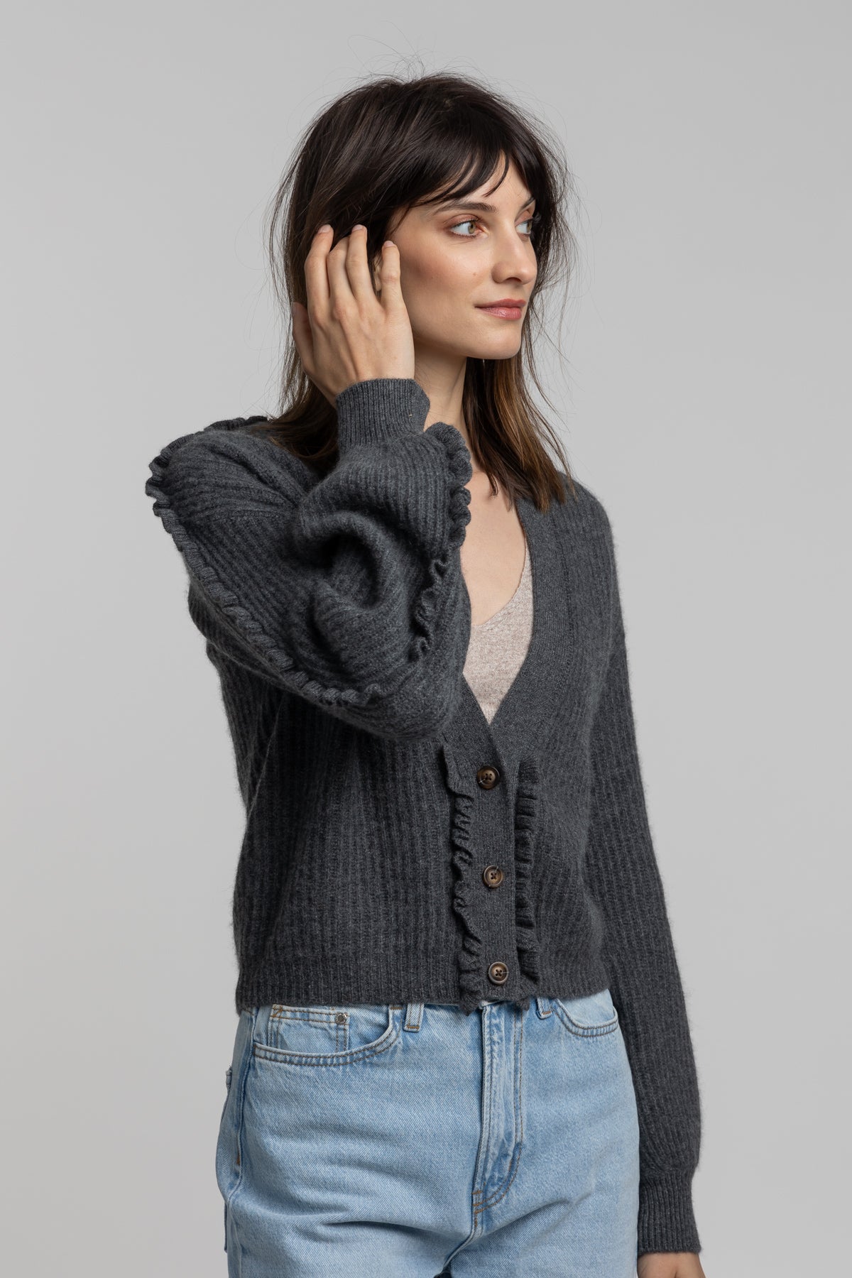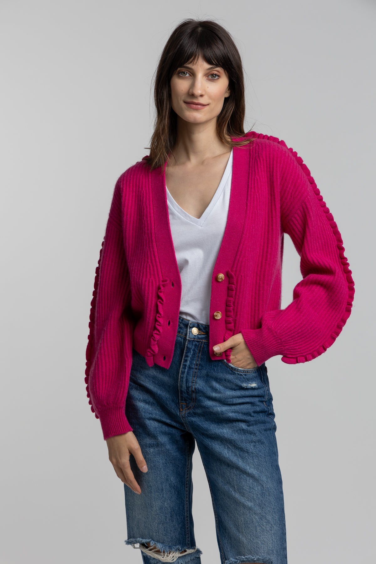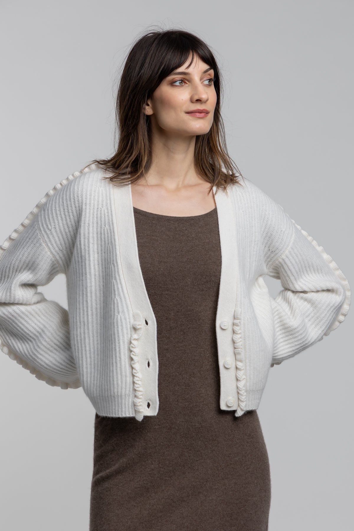 Our immaculately-crafted cashmere ruffle cardigan is a timeless must-have. Its intricate edging transitions elegantly from the crew neckline to the hem, highlighted by sophisticated mother of pearl buttons for an elevated look.