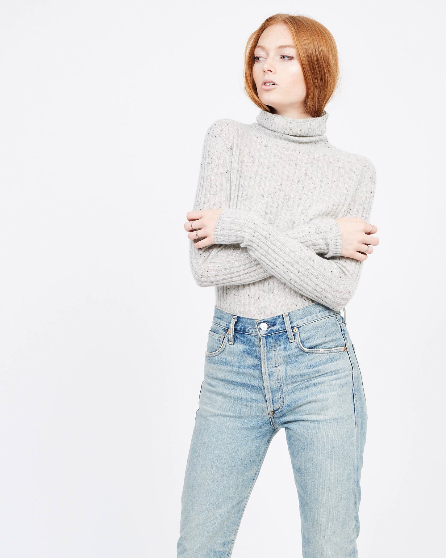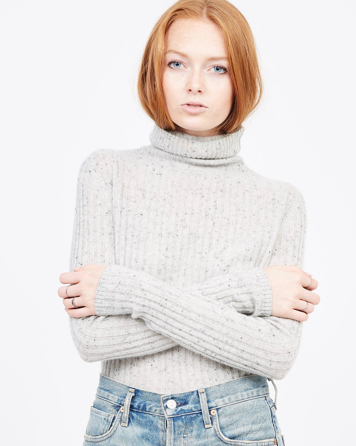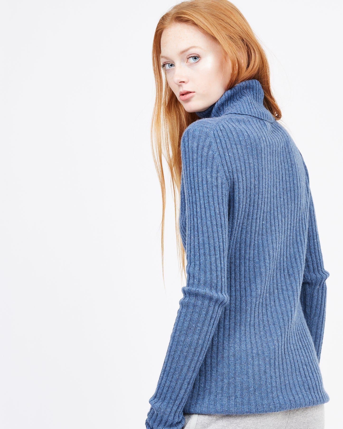 This ribbed turtle neck is the perfect layering piece for any outfit. The donegal flecks throughout the yarn gives it a tweed-like look and the ribs are so 70's..