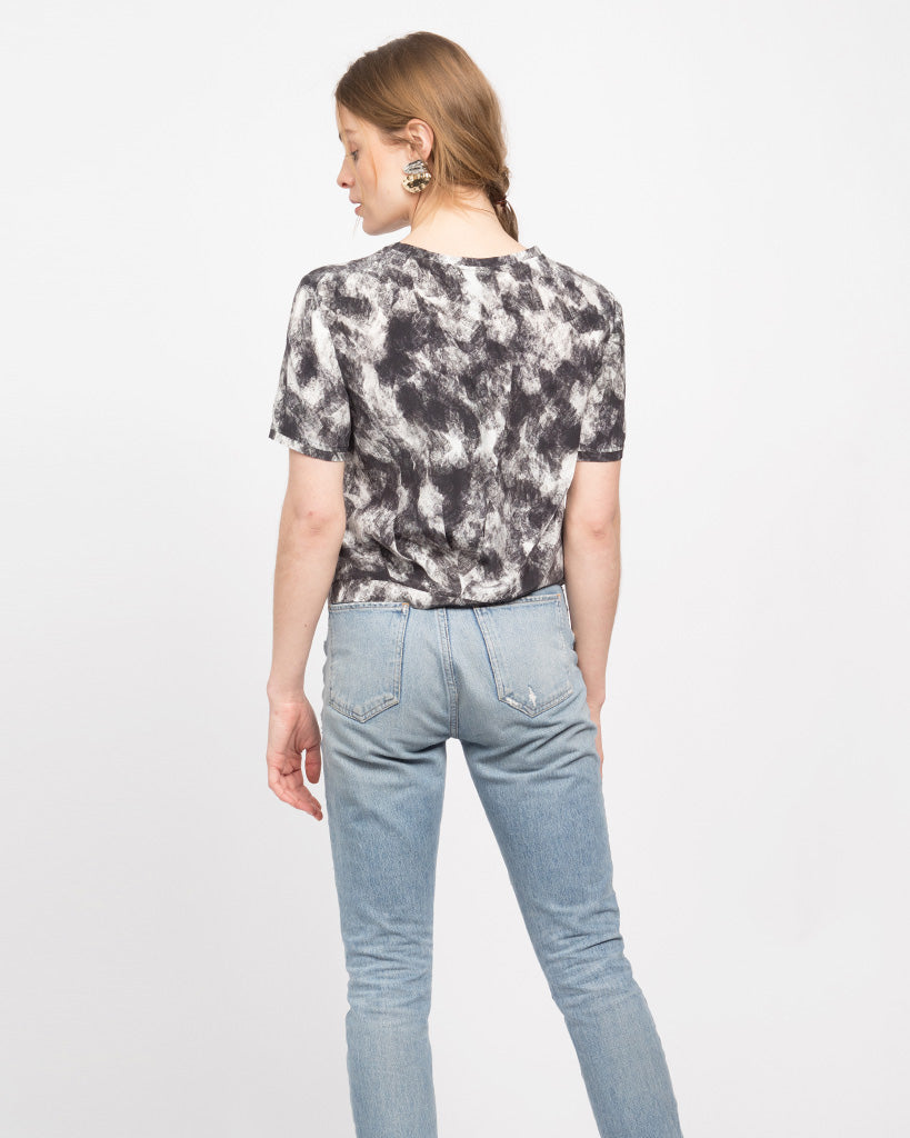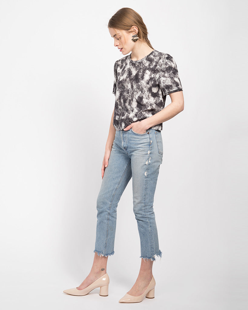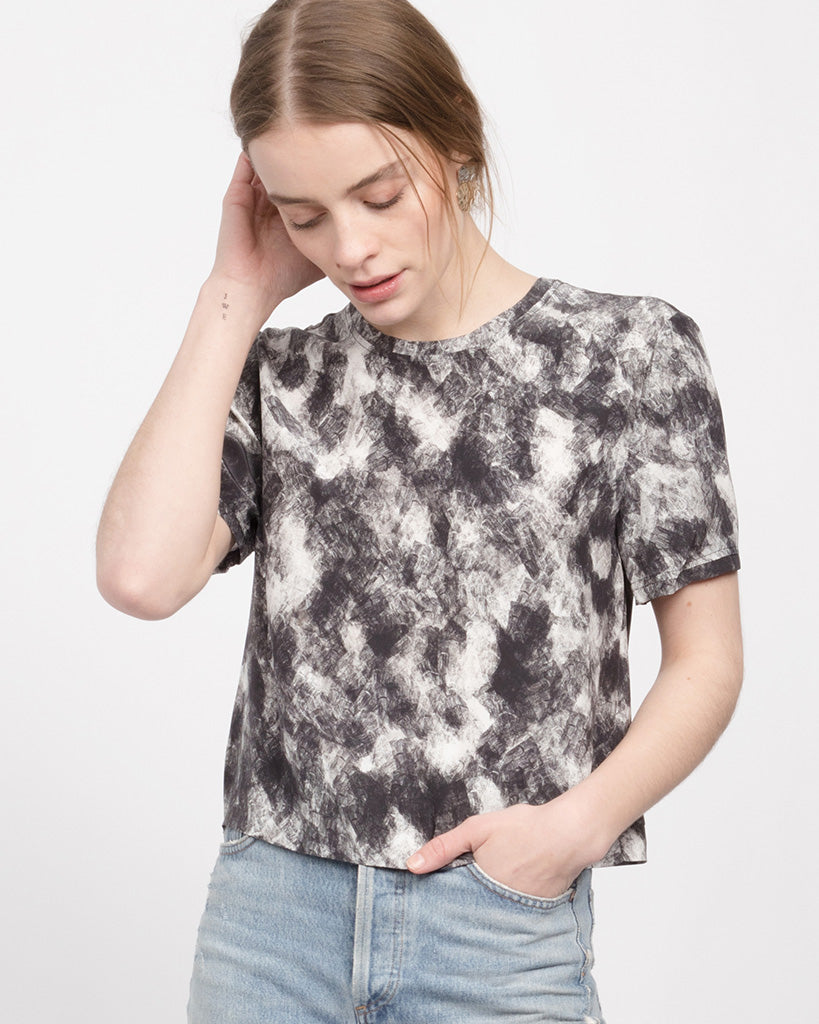 A classic woven short sleeve tee with a pleated back. Cropped fit-