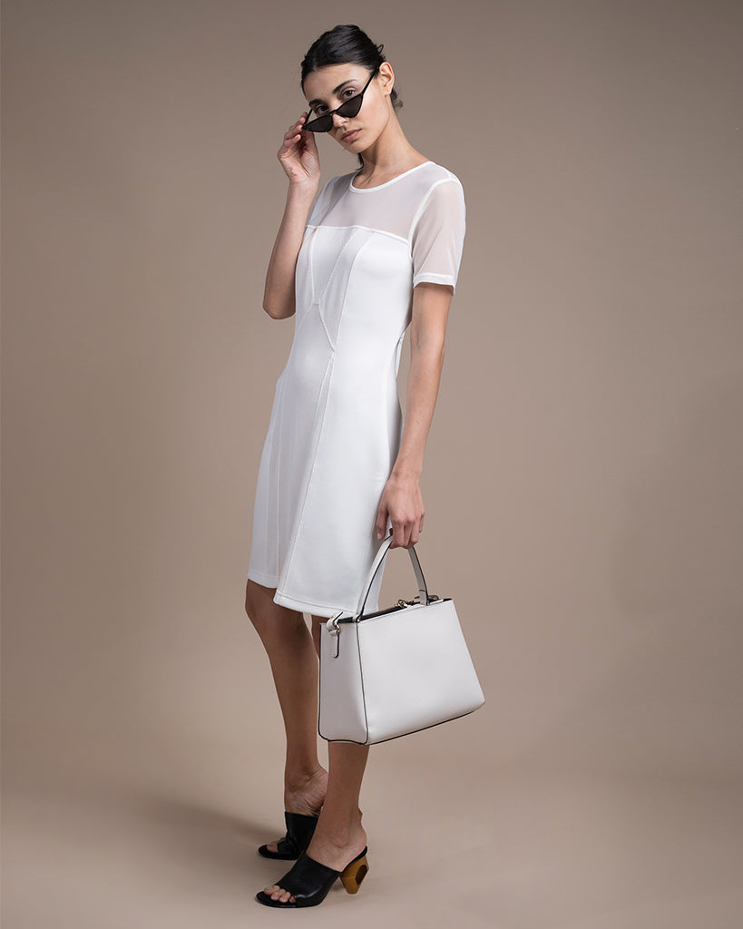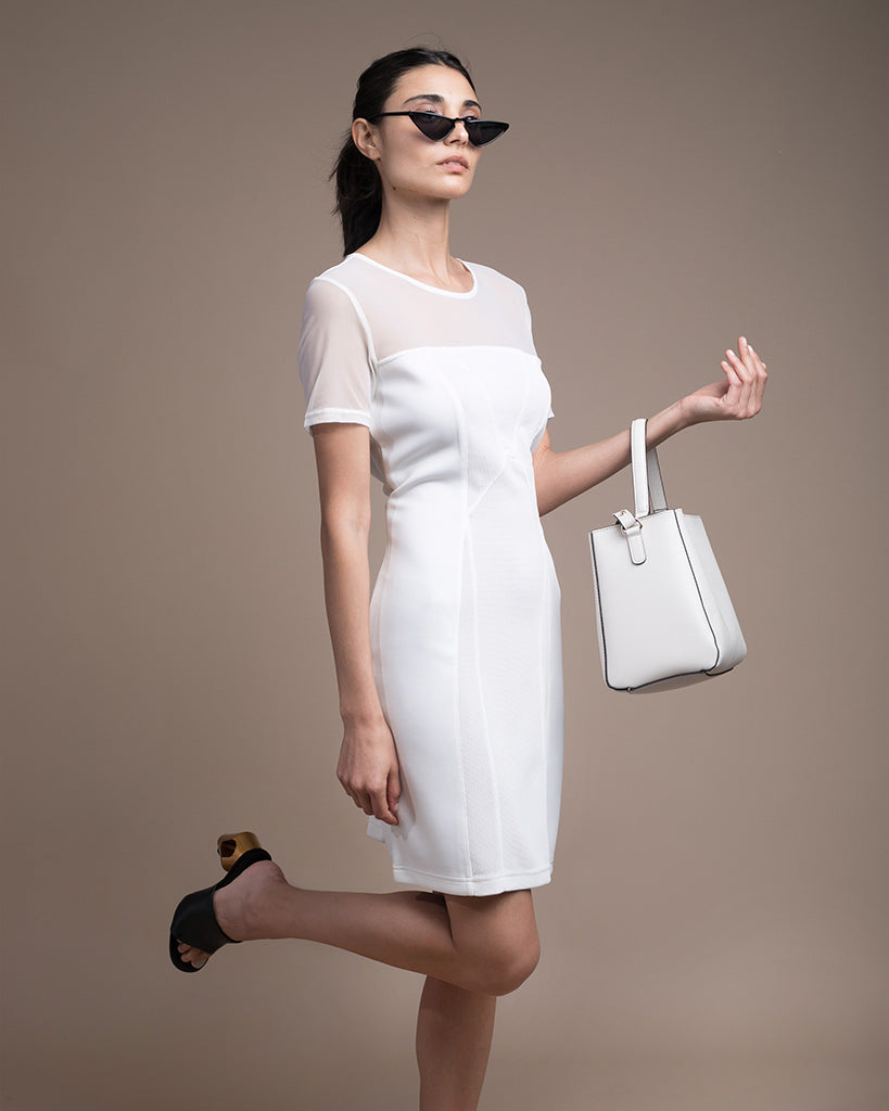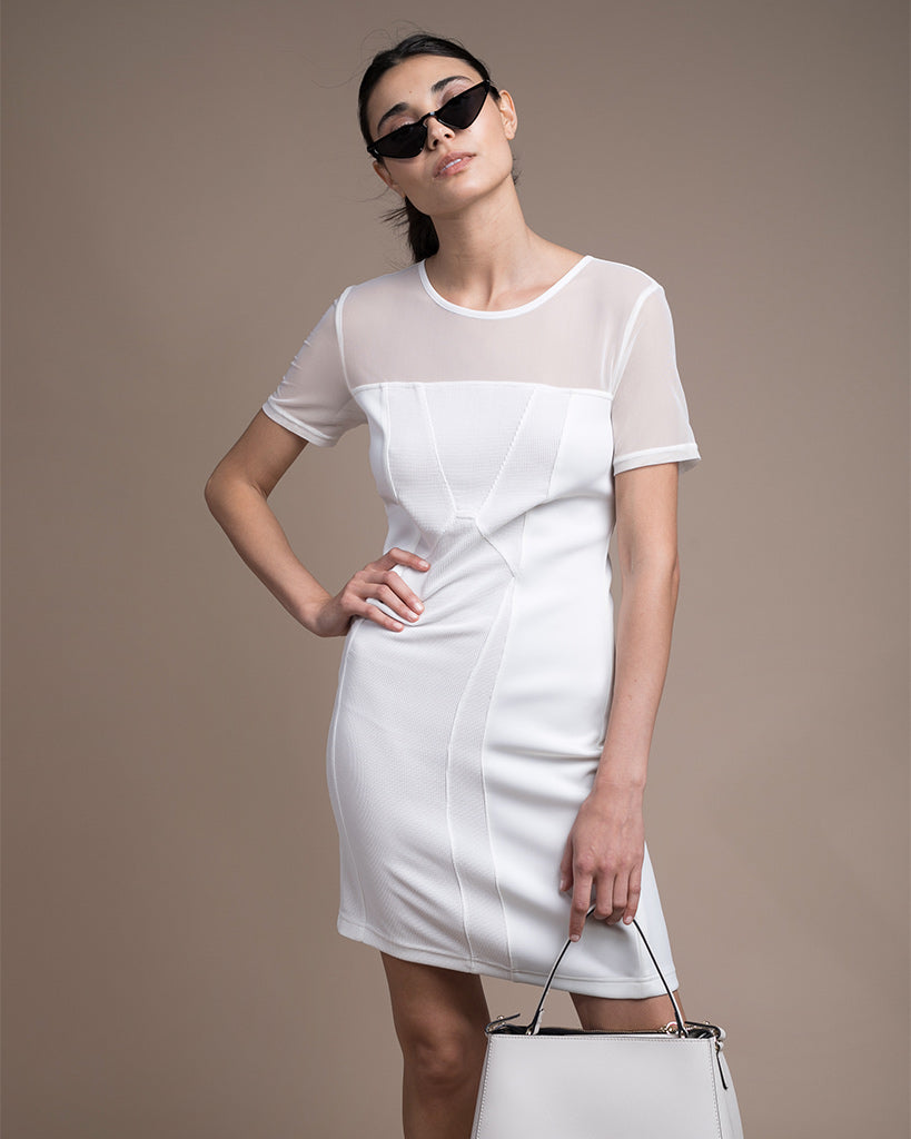 Panels of sheer mesh bring daring contrast. Get ready for that special occasion!